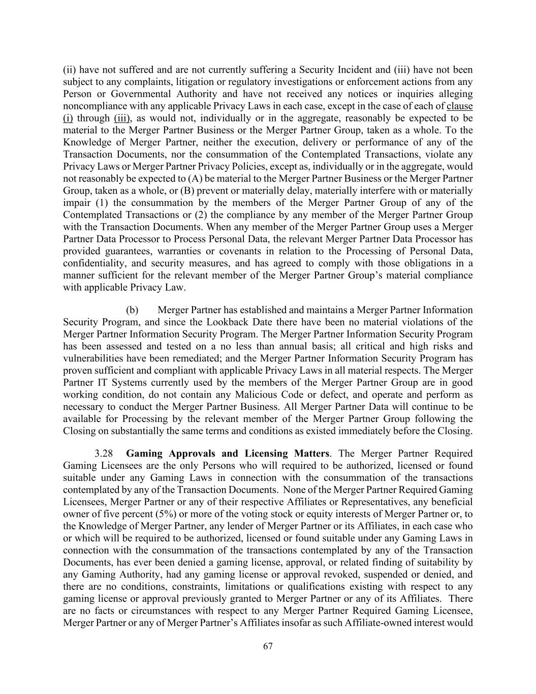 67 (ii) have not suffered and are not currently suffering a Security Incident and (iii) have not been subject to any complaints, litigation or regulatory investigations or enforcement actions from any Person or Governmental Authority and have not received any notices or inquiries alleging noncompliance with any applicable Privacy Laws in each case, except in the case of each of clause (i) through (iii), as would not, individually or in the aggregate, reasonably be expected to be material to the Merger Partner Business or the Merger Partner Group, taken as a whole. To the Knowledge of Merger Partner, neither the execution, delivery or performance of any of the Transaction Documents, nor the consummation of the Contemplated Transactions, violate any Privacy Laws or Merger Partner Privacy Policies, except as, individually or in the aggregate, would not reasonably be expected to (A) be material to the Merger Partner Business or the Merger Partner Group, taken as a whole, or (B) prevent or materially delay, materially interfere with or materially impair (1) the consummation by the members of the Merger Partner Group of any of the Contemplated Transactions or (2) the compliance by any member of the Merger Partner Group with the Transaction Documents. When any member of the Merger Partner Group uses a Merger Partner Data Processor to Process Personal Data, the relevant Merger Partner Data Processor has provided guarantees, warranties or covenants in relation to the Processing of Personal Data, confidentiality, and security measures, and has agreed to comply with those obligations in a manner sufficient for the relevant member of the Merger Partner Group’s material compliance with applicable Privacy Law. (b) Merger Partner has established and maintains a Merger Partner Information Security Program, and since the Lookback Date there have been no material violations of the Merger Partner Information Security Program. The Merger Partner Information Security Program has been assessed and tested on a no less than annual basis; all critical and high risks and vulnerabilities have been remediated; and the Merger Partner Information Security Program has proven sufficient and compliant with applicable Privacy Laws in all material respects. The Merger Partner IT Systems currently used by the members of the Merger Partner Group are in good working condition, do not contain any Malicious Code or defect, and operate and perform as necessary to conduct the Merger Partner Business. All Merger Partner Data will continue to be available for Processing by the relevant member of the Merger Partner Group following the Closing on substantially the same terms and conditions as existed immediately before the Closing. 3.28 Gaming Approvals and Licensing Matters. The Merger Partner Required Gaming Licensees are the only Persons who will required to be authorized, licensed or found suitable under any Gaming Laws in connection with the consummation of the transactions contemplated by any of the Transaction Documents. None of the Merger Partner Required Gaming Licensees, Merger Partner or any of their respective Affiliates or Representatives, any beneficial owner of five percent (5%) or more of the voting stock or equity interests of Merger Partner or, to the Knowledge of Merger Partner, any lender of Merger Partner or its Affiliates, in each case who or which will be required to be authorized, licensed or found suitable under any Gaming Laws in connection with the consummation of the transactions contemplated by any of the Transaction Documents, has ever been denied a gaming license, approval, or related finding of suitability by any Gaming Authority, had any gaming license or approval revoked, suspended or denied, and there are no conditions, constraints, limitations or qualifications existing with respect to any gaming license or approval previously granted to Merger Partner or any of its Affiliates. There are no facts or circumstances with respect to any Merger Partner Required Gaming Licensee, Merger Partner or any of Merger Partner’s Affiliates insofar as such Affiliate-owned interest would