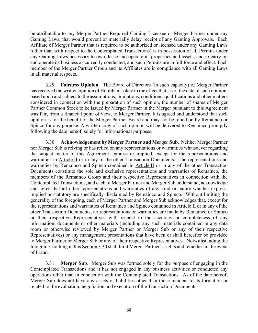 68 be attributable to any Merger Partner Required Gaming Licensee or Merger Partner under any Gaming Laws, that would prevent or materially delay receipt of any Gaming Approvals. Each Affiliate of Merger Partner that is required to be authorized or licensed under any Gaming Laws (other than with respect to the Contemplated Transactions) is in possession of all Permits under any Gaming Laws necessary to own, lease and operate its properties and assets, and to carry on and operate its business as currently conducted, and such Permits are in full force and effect. Each member of the Merger Partner Group and its Affiliates are in compliance with all Gaming Laws in all material respects. 3.29 Fairness Opinion. The Board of Directors (in such capacity) of Merger Partner has received the written opinion of Houlihan Lokey to the effect that, as of the date of such opinion, based upon and subject to the assumptions, limitations, conditions, qualifications and other matters considered in connection with the preparation of such opinion, the number of shares of Merger Partner Common Stock to be issued by Merger Partner in the Merger pursuant to this Agreement was fair, from a financial point of view, to Merger Partner. It is agreed and understood that such opinion is for the benefit of the Merger Partner Board and may not be relied on by Remainco or Spinco for any purpose. A written copy of such opinion will be delivered to Remainco promptly following the date hereof, solely for informational purposes. 3.30 Acknowledgement by Merger Partner and Merger Sub. Neither Merger Partner nor Merger Sub is relying or has relied on any representations or warranties whatsoever regarding the subject matter of this Agreement, express or implied, except for the representations and warranties in Article II or in any of the other Transaction Documents. The representations and warranties by Remainco and Spinco contained in Article II or in any of the other Transaction Documents constitute the sole and exclusive representations and warranties of Remainco, the members of the Remainco Group and their respective Representatives in connection with the Contemplated Transactions, and each of Merger Partner and Merger Sub understand, acknowledge and agree that all other representations and warranties of any kind or nature whether express, implied or statutory are specifically disclaimed by Remainco and Spinco. Without limiting the generality of the foregoing, each of Merger Partner and Merger Sub acknowledges that, except for the representations and warranties of Remainco and Spinco contained in Article II or in any of the other Transaction Documents, no representations or warranties are made by Remainco or Spinco or their respective Representatives with respect to the accuracy or completeness of any information, documents or other materials (including any such materials contained in any data room or otherwise reviewed by Merger Partner or Merger Sub or any of their respective Representatives) or any management presentations that have been or shall hereafter be provided to Merger Partner or Merger Sub or any of their respective Representatives. Notwithstanding the foregoing, nothing in this Section 3.30 shall limit Merger Partner’s rights and remedies in the event of Fraud. 3.31 Merger Sub. Merger Sub was formed solely for the purpose of engaging in the Contemplated Transactions and it has not engaged in any business activities or conducted any operations other than in connection with the Contemplated Transactions. As of the date hereof, Merger Sub does not have any assets or liabilities other than those incident to its formation or related to the evaluation, negotiation and execution of the Transaction Documents.