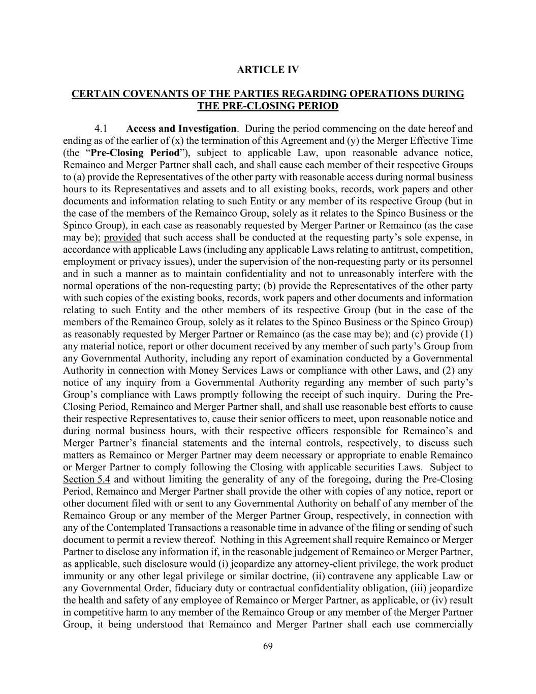 69 ARTICLE IV CERTAIN COVENANTS OF THE PARTIES REGARDING OPERATIONS DURING THE PRE-CLOSING PERIOD 4.1 Access and Investigation. During the period commencing on the date hereof and ending as of the earlier of (x) the termination of this Agreement and (y) the Merger Effective Time (the “Pre-Closing Period”), subject to applicable Law, upon reasonable advance notice, Remainco and Merger Partner shall each, and shall cause each member of their respective Groups to (a) provide the Representatives of the other party with reasonable access during normal business hours to its Representatives and assets and to all existing books, records, work papers and other documents and information relating to such Entity or any member of its respective Group (but in the case of the members of the Remainco Group, solely as it relates to the Spinco Business or the Spinco Group), in each case as reasonably requested by Merger Partner or Remainco (as the case may be); provided that such access shall be conducted at the requesting party’s sole expense, in accordance with applicable Laws (including any applicable Laws relating to antitrust, competition, employment or privacy issues), under the supervision of the non-requesting party or its personnel and in such a manner as to maintain confidentiality and not to unreasonably interfere with the normal operations of the non-requesting party; (b) provide the Representatives of the other party with such copies of the existing books, records, work papers and other documents and information relating to such Entity and the other members of its respective Group (but in the case of the members of the Remainco Group, solely as it relates to the Spinco Business or the Spinco Group) as reasonably requested by Merger Partner or Remainco (as the case may be); and (c) provide (1) any material notice, report or other document received by any member of such party’s Group from any Governmental Authority, including any report of examination conducted by a Governmental Authority in connection with Money Services Laws or compliance with other Laws, and (2) any notice of any inquiry from a Governmental Authority regarding any member of such party’s Group’s compliance with Laws promptly following the receipt of such inquiry. During the Pre- Closing Period, Remainco and Merger Partner shall, and shall use reasonable best efforts to cause their respective Representatives to, cause their senior officers to meet, upon reasonable notice and during normal business hours, with their respective officers responsible for Remainco’s and Merger Partner’s financial statements and the internal controls, respectively, to discuss such matters as Remainco or Merger Partner may deem necessary or appropriate to enable Remainco or Merger Partner to comply following the Closing with applicable securities Laws. Subject to Section 5.4 and without limiting the generality of any of the foregoing, during the Pre-Closing Period, Remainco and Merger Partner shall provide the other with copies of any notice, report or other document filed with or sent to any Governmental Authority on behalf of any member of the Remainco Group or any member of the Merger Partner Group, respectively, in connection with any of the Contemplated Transactions a reasonable time in advance of the filing or sending of such document to permit a review thereof. Nothing in this Agreement shall require Remainco or Merger Partner to disclose any information if, in the reasonable judgement of Remainco or Merger Partner, as applicable, such disclosure would (i) jeopardize any attorney-client privilege, the work product immunity or any other legal privilege or similar doctrine, (ii) contravene any applicable Law or any Governmental Order, fiduciary duty or contractual confidentiality obligation, (iii) jeopardize the health and safety of any employee of Remainco or Merger Partner, as applicable, or (iv) result in competitive harm to any member of the Remainco Group or any member of the Merger Partner Group, it being understood that Remainco and Merger Partner shall each use commercially