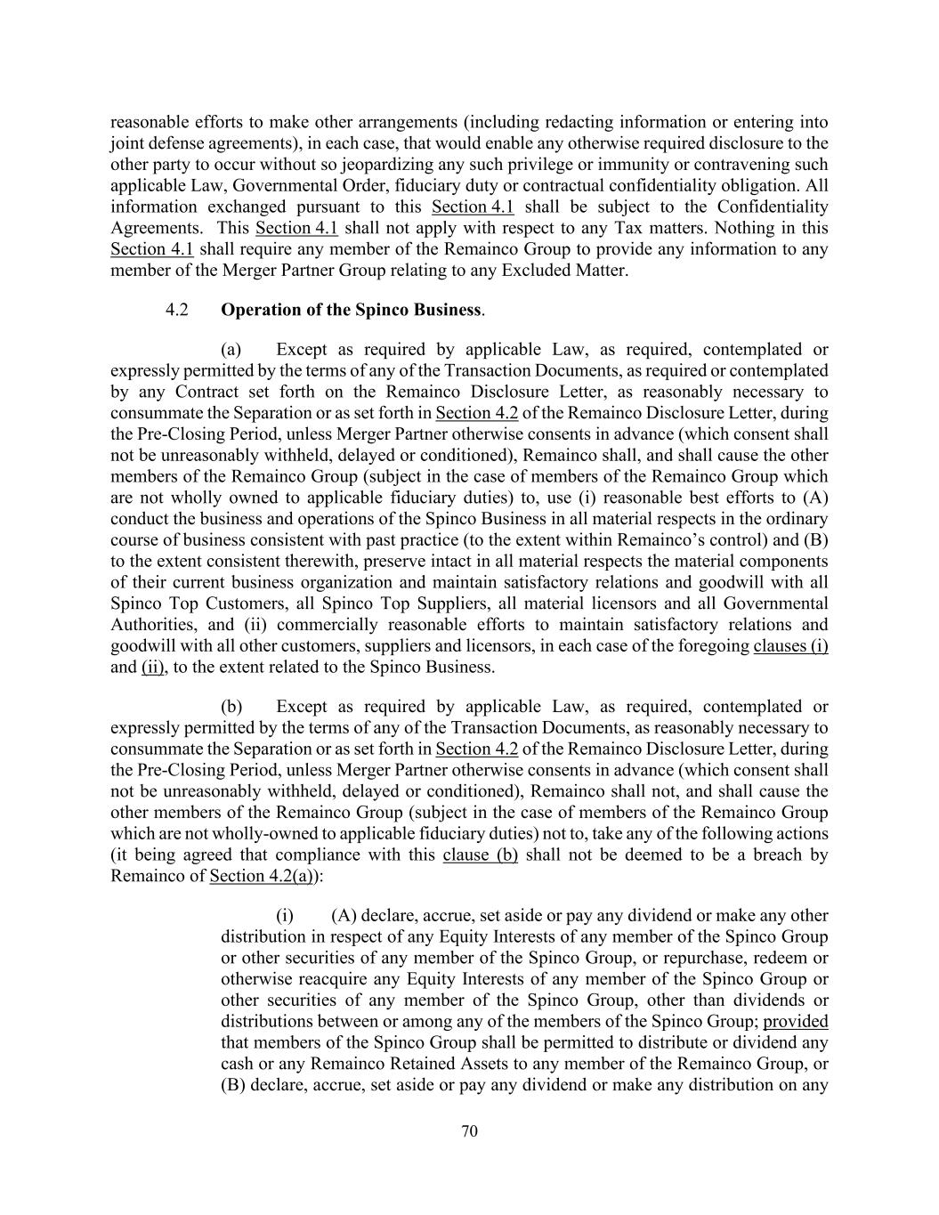 70 reasonable efforts to make other arrangements (including redacting information or entering into joint defense agreements), in each case, that would enable any otherwise required disclosure to the other party to occur without so jeopardizing any such privilege or immunity or contravening such applicable Law, Governmental Order, fiduciary duty or contractual confidentiality obligation. All information exchanged pursuant to this Section 4.1 shall be subject to the Confidentiality Agreements. This Section 4.1 shall not apply with respect to any Tax matters. Nothing in this Section 4.1 shall require any member of the Remainco Group to provide any information to any member of the Merger Partner Group relating to any Excluded Matter. 4.2 Operation of the Spinco Business. (a) Except as required by applicable Law, as required, contemplated or expressly permitted by the terms of any of the Transaction Documents, as required or contemplated by any Contract set forth on the Remainco Disclosure Letter, as reasonably necessary to consummate the Separation or as set forth in Section 4.2 of the Remainco Disclosure Letter, during the Pre-Closing Period, unless Merger Partner otherwise consents in advance (which consent shall not be unreasonably withheld, delayed or conditioned), Remainco shall, and shall cause the other members of the Remainco Group (subject in the case of members of the Remainco Group which are not wholly owned to applicable fiduciary duties) to, use (i) reasonable best efforts to (A) conduct the business and operations of the Spinco Business in all material respects in the ordinary course of business consistent with past practice (to the extent within Remainco’s control) and (B) to the extent consistent therewith, preserve intact in all material respects the material components of their current business organization and maintain satisfactory relations and goodwill with all Spinco Top Customers, all Spinco Top Suppliers, all material licensors and all Governmental Authorities, and (ii) commercially reasonable efforts to maintain satisfactory relations and goodwill with all other customers, suppliers and licensors, in each case of the foregoing clauses (i) and (ii), to the extent related to the Spinco Business. (b) Except as required by applicable Law, as required, contemplated or expressly permitted by the terms of any of the Transaction Documents, as reasonably necessary to consummate the Separation or as set forth in Section 4.2 of the Remainco Disclosure Letter, during the Pre-Closing Period, unless Merger Partner otherwise consents in advance (which consent shall not be unreasonably withheld, delayed or conditioned), Remainco shall not, and shall cause the other members of the Remainco Group (subject in the case of members of the Remainco Group which are not wholly-owned to applicable fiduciary duties) not to, take any of the following actions (it being agreed that compliance with this clause (b) shall not be deemed to be a breach by Remainco of Section 4.2(a)): (i) (A) declare, accrue, set aside or pay any dividend or make any other distribution in respect of any Equity Interests of any member of the Spinco Group or other securities of any member of the Spinco Group, or repurchase, redeem or otherwise reacquire any Equity Interests of any member of the Spinco Group or other securities of any member of the Spinco Group, other than dividends or distributions between or among any of the members of the Spinco Group; provided that members of the Spinco Group shall be permitted to distribute or dividend any cash or any Remainco Retained Assets to any member of the Remainco Group, or (B) declare, accrue, set aside or pay any dividend or make any distribution on any