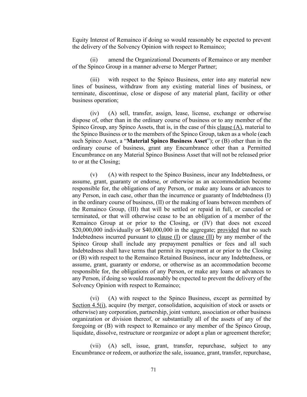 71 Equity Interest of Remainco if doing so would reasonably be expected to prevent the delivery of the Solvency Opinion with respect to Remainco; (ii) amend the Organizational Documents of Remainco or any member of the Spinco Group in a manner adverse to Merger Partner; (iii) with respect to the Spinco Business, enter into any material new lines of business, withdraw from any existing material lines of business, or terminate, discontinue, close or dispose of any material plant, facility or other business operation; (iv) (A) sell, transfer, assign, lease, license, exchange or otherwise dispose of, other than in the ordinary course of business or to any member of the Spinco Group, any Spinco Assets, that is, in the case of this clause (A), material to the Spinco Business or to the members of the Spinco Group, taken as a whole (each such Spinco Asset, a “Material Spinco Business Asset”); or (B) other than in the ordinary course of business, grant any Encumbrance other than a Permitted Encumbrance on any Material Spinco Business Asset that will not be released prior to or at the Closing; (v) (A) with respect to the Spinco Business, incur any Indebtedness, or assume, grant, guaranty or endorse, or otherwise as an accommodation become responsible for, the obligations of any Person, or make any loans or advances to any Person, in each case, other than the incurrence or guaranty of Indebtedness (I) in the ordinary course of business, (II) or the making of loans between members of the Remainco Group, (III) that will be settled or repaid in full, or canceled or terminated, or that will otherwise cease to be an obligation of a member of the Remainco Group at or prior to the Closing, or (IV) that does not exceed $20,000,000 individually or $40,000,000 in the aggregate; provided that no such Indebtedness incurred pursuant to clause (I) or clause (II) by any member of the Spinco Group shall include any prepayment penalties or fees and all such Indebtedness shall have terms that permit its repayment at or prior to the Closing or (B) with respect to the Remainco Retained Business, incur any Indebtedness, or assume, grant, guaranty or endorse, or otherwise as an accommodation become responsible for, the obligations of any Person, or make any loans or advances to any Person, if doing so would reasonably be expected to prevent the delivery of the Solvency Opinion with respect to Remainco; (vi) (A) with respect to the Spinco Business, except as permitted by Section 4.5(i), acquire (by merger, consolidation, acquisition of stock or assets or otherwise) any corporation, partnership, joint venture, association or other business organization or division thereof, or substantially all of the assets of any of the foregoing or (B) with respect to Remainco or any member of the Spinco Group, liquidate, dissolve, restructure or reorganize or adopt a plan or agreement therefor; (vii) (A) sell, issue, grant, transfer, repurchase, subject to any Encumbrance or redeem, or authorize the sale, issuance, grant, transfer, repurchase,