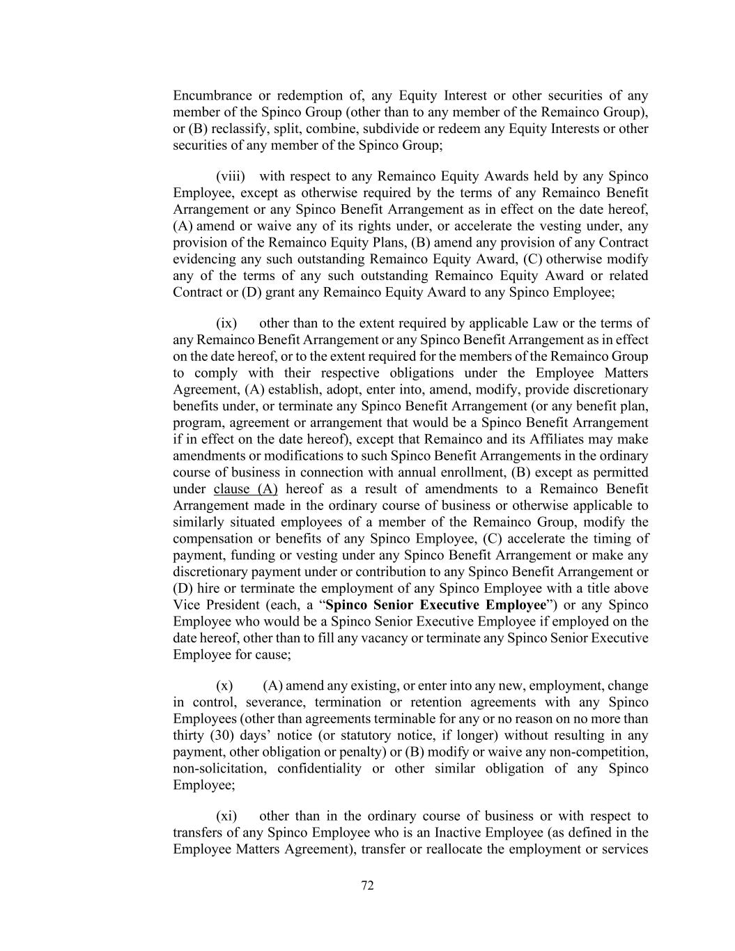 72 Encumbrance or redemption of, any Equity Interest or other securities of any member of the Spinco Group (other than to any member of the Remainco Group), or (B) reclassify, split, combine, subdivide or redeem any Equity Interests or other securities of any member of the Spinco Group; (viii) with respect to any Remainco Equity Awards held by any Spinco Employee, except as otherwise required by the terms of any Remainco Benefit Arrangement or any Spinco Benefit Arrangement as in effect on the date hereof, (A) amend or waive any of its rights under, or accelerate the vesting under, any provision of the Remainco Equity Plans, (B) amend any provision of any Contract evidencing any such outstanding Remainco Equity Award, (C) otherwise modify any of the terms of any such outstanding Remainco Equity Award or related Contract or (D) grant any Remainco Equity Award to any Spinco Employee; (ix) other than to the extent required by applicable Law or the terms of any Remainco Benefit Arrangement or any Spinco Benefit Arrangement as in effect on the date hereof, or to the extent required for the members of the Remainco Group to comply with their respective obligations under the Employee Matters Agreement, (A) establish, adopt, enter into, amend, modify, provide discretionary benefits under, or terminate any Spinco Benefit Arrangement (or any benefit plan, program, agreement or arrangement that would be a Spinco Benefit Arrangement if in effect on the date hereof), except that Remainco and its Affiliates may make amendments or modifications to such Spinco Benefit Arrangements in the ordinary course of business in connection with annual enrollment, (B) except as permitted under clause (A) hereof as a result of amendments to a Remainco Benefit Arrangement made in the ordinary course of business or otherwise applicable to similarly situated employees of a member of the Remainco Group, modify the compensation or benefits of any Spinco Employee, (C) accelerate the timing of payment, funding or vesting under any Spinco Benefit Arrangement or make any discretionary payment under or contribution to any Spinco Benefit Arrangement or (D) hire or terminate the employment of any Spinco Employee with a title above Vice President (each, a “Spinco Senior Executive Employee”) or any Spinco Employee who would be a Spinco Senior Executive Employee if employed on the date hereof, other than to fill any vacancy or terminate any Spinco Senior Executive Employee for cause; (x) (A) amend any existing, or enter into any new, employment, change in control, severance, termination or retention agreements with any Spinco Employees (other than agreements terminable for any or no reason on no more than thirty (30) days’ notice (or statutory notice, if longer) without resulting in any payment, other obligation or penalty) or (B) modify or waive any non-competition, non-solicitation, confidentiality or other similar obligation of any Spinco Employee; (xi) other than in the ordinary course of business or with respect to transfers of any Spinco Employee who is an Inactive Employee (as defined in the Employee Matters Agreement), transfer or reallocate the employment or services