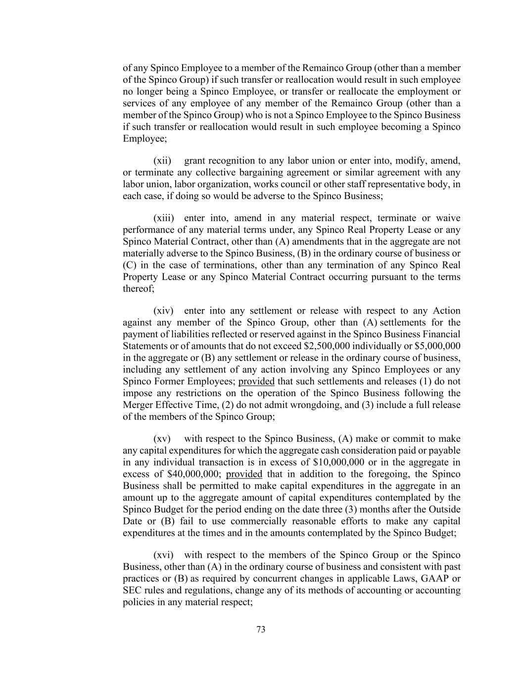 73 of any Spinco Employee to a member of the Remainco Group (other than a member of the Spinco Group) if such transfer or reallocation would result in such employee no longer being a Spinco Employee, or transfer or reallocate the employment or services of any employee of any member of the Remainco Group (other than a member of the Spinco Group) who is not a Spinco Employee to the Spinco Business if such transfer or reallocation would result in such employee becoming a Spinco Employee; (xii) grant recognition to any labor union or enter into, modify, amend, or terminate any collective bargaining agreement or similar agreement with any labor union, labor organization, works council or other staff representative body, in each case, if doing so would be adverse to the Spinco Business; (xiii) enter into, amend in any material respect, terminate or waive performance of any material terms under, any Spinco Real Property Lease or any Spinco Material Contract, other than (A) amendments that in the aggregate are not materially adverse to the Spinco Business, (B) in the ordinary course of business or (C) in the case of terminations, other than any termination of any Spinco Real Property Lease or any Spinco Material Contract occurring pursuant to the terms thereof; (xiv) enter into any settlement or release with respect to any Action against any member of the Spinco Group, other than (A) settlements for the payment of liabilities reflected or reserved against in the Spinco Business Financial Statements or of amounts that do not exceed $2,500,000 individually or $5,000,000 in the aggregate or (B) any settlement or release in the ordinary course of business, including any settlement of any action involving any Spinco Employees or any Spinco Former Employees; provided that such settlements and releases (1) do not impose any restrictions on the operation of the Spinco Business following the Merger Effective Time, (2) do not admit wrongdoing, and (3) include a full release of the members of the Spinco Group; (xv) with respect to the Spinco Business, (A) make or commit to make any capital expenditures for which the aggregate cash consideration paid or payable in any individual transaction is in excess of $10,000,000 or in the aggregate in excess of $40,000,000; provided that in addition to the foregoing, the Spinco Business shall be permitted to make capital expenditures in the aggregate in an amount up to the aggregate amount of capital expenditures contemplated by the Spinco Budget for the period ending on the date three (3) months after the Outside Date or (B) fail to use commercially reasonable efforts to make any capital expenditures at the times and in the amounts contemplated by the Spinco Budget; (xvi) with respect to the members of the Spinco Group or the Spinco Business, other than (A) in the ordinary course of business and consistent with past practices or (B) as required by concurrent changes in applicable Laws, GAAP or SEC rules and regulations, change any of its methods of accounting or accounting policies in any material respect;