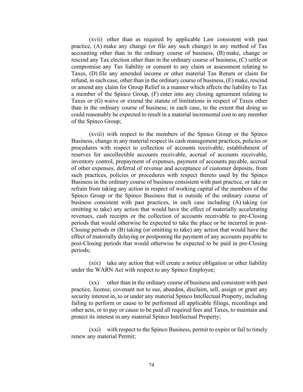 74 (xvii) other than as required by applicable Law consistent with past practice, (A) make any change (or file any such change) in any method of Tax accounting other than in the ordinary course of business, (B) make, change or rescind any Tax election other than in the ordinary course of business, (C) settle or compromise any Tax liability or consent to any claim or assessment relating to Taxes, (D) file any amended income or other material Tax Return or claim for refund, in each case, other than in the ordinary course of business, (E) make, rescind or amend any claim for Group Relief in a manner which affects the liability to Tax a member of the Spinco Group, (F) enter into any closing agreement relating to Taxes or (G) waive or extend the statute of limitations in respect of Taxes other than in the ordinary course of business; in each case, to the extent that doing so could reasonably be expected to result in a material incremental cost to any member of the Spinco Group; (xviii) with respect to the members of the Spinco Group or the Spinco Business, change in any material respect its cash management practices, policies or procedures with respect to collection of accounts receivable, establishment of reserves for uncollectible accounts receivable, accrual of accounts receivable, inventory control, prepayment of expenses, payment of accounts payable, accrual of other expenses, deferral of revenue and acceptance of customer deposits, from such practices, policies or procedures with respect thereto used by the Spinco Business in the ordinary course of business consistent with past practice, or take or refrain from taking any action in respect of working capital of the members of the Spinco Group or the Spinco Business that is outside of the ordinary course of business consistent with past practices, in each case including (A) taking (or omitting to take) any action that would have the effect of materially accelerating revenues, cash receipts or the collection of accounts receivable to pre-Closing periods that would otherwise be expected to take the place or be incurred in post- Closing periods or (B) taking (or omitting to take) any action that would have the effect of materially delaying or postponing the payment of any accounts payable to post-Closing periods that would otherwise be expected to be paid in pre-Closing periods; (xix) take any action that will create a notice obligation or other liability under the WARN Act with respect to any Spinco Employee; (xx) other than in the ordinary course of business and consistent with past practice, license, covenant not to sue, abandon, disclaim, sell, assign or grant any security interest in, to or under any material Spinco Intellectual Property, including failing to perform or cause to be performed all applicable filings, recordings and other acts, or to pay or cause to be paid all required fees and Taxes, to maintain and protect its interest in any material Spinco Intellectual Property; (xxi) with respect to the Spinco Business, permit to expire or fail to timely renew any material Permit;