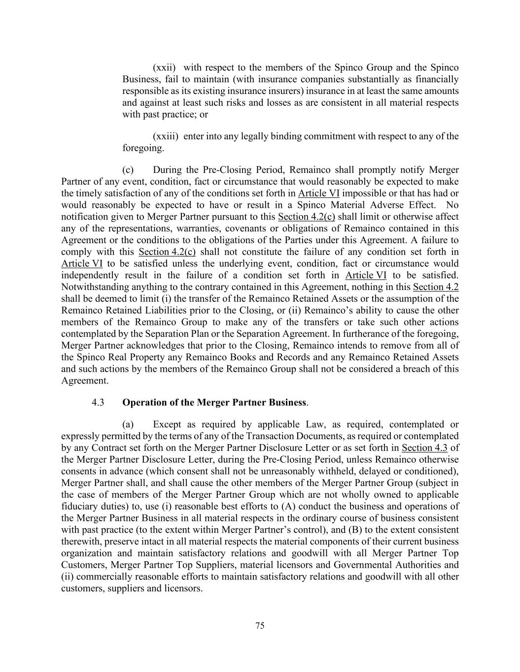 75 (xxii) with respect to the members of the Spinco Group and the Spinco Business, fail to maintain (with insurance companies substantially as financially responsible as its existing insurance insurers) insurance in at least the same amounts and against at least such risks and losses as are consistent in all material respects with past practice; or (xxiii) enter into any legally binding commitment with respect to any of the foregoing. (c) During the Pre-Closing Period, Remainco shall promptly notify Merger Partner of any event, condition, fact or circumstance that would reasonably be expected to make the timely satisfaction of any of the conditions set forth in Article VI impossible or that has had or would reasonably be expected to have or result in a Spinco Material Adverse Effect. No notification given to Merger Partner pursuant to this Section 4.2(c) shall limit or otherwise affect any of the representations, warranties, covenants or obligations of Remainco contained in this Agreement or the conditions to the obligations of the Parties under this Agreement. A failure to comply with this Section 4.2(c) shall not constitute the failure of any condition set forth in Article VI to be satisfied unless the underlying event, condition, fact or circumstance would independently result in the failure of a condition set forth in Article VI to be satisfied. Notwithstanding anything to the contrary contained in this Agreement, nothing in this Section 4.2 shall be deemed to limit (i) the transfer of the Remainco Retained Assets or the assumption of the Remainco Retained Liabilities prior to the Closing, or (ii) Remainco’s ability to cause the other members of the Remainco Group to make any of the transfers or take such other actions contemplated by the Separation Plan or the Separation Agreement. In furtherance of the foregoing, Merger Partner acknowledges that prior to the Closing, Remainco intends to remove from all of the Spinco Real Property any Remainco Books and Records and any Remainco Retained Assets and such actions by the members of the Remainco Group shall not be considered a breach of this Agreement. 4.3 Operation of the Merger Partner Business. (a) Except as required by applicable Law, as required, contemplated or expressly permitted by the terms of any of the Transaction Documents, as required or contemplated by any Contract set forth on the Merger Partner Disclosure Letter or as set forth in Section 4.3 of the Merger Partner Disclosure Letter, during the Pre-Closing Period, unless Remainco otherwise consents in advance (which consent shall not be unreasonably withheld, delayed or conditioned), Merger Partner shall, and shall cause the other members of the Merger Partner Group (subject in the case of members of the Merger Partner Group which are not wholly owned to applicable fiduciary duties) to, use (i) reasonable best efforts to (A) conduct the business and operations of the Merger Partner Business in all material respects in the ordinary course of business consistent with past practice (to the extent within Merger Partner’s control), and (B) to the extent consistent therewith, preserve intact in all material respects the material components of their current business organization and maintain satisfactory relations and goodwill with all Merger Partner Top Customers, Merger Partner Top Suppliers, material licensors and Governmental Authorities and (ii) commercially reasonable efforts to maintain satisfactory relations and goodwill with all other customers, suppliers and licensors.