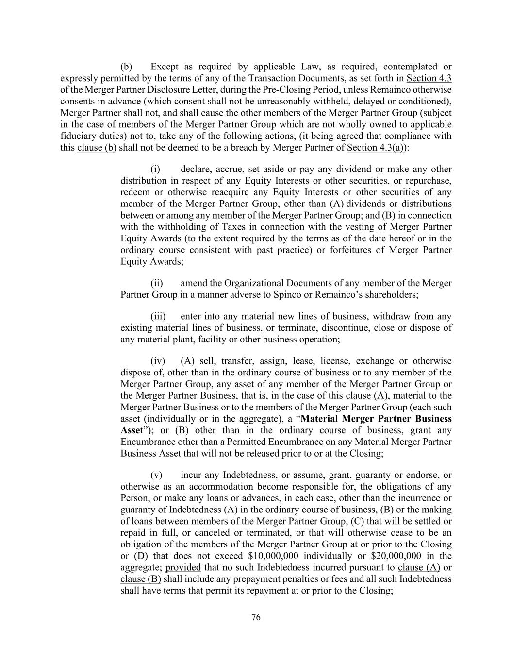 76 (b) Except as required by applicable Law, as required, contemplated or expressly permitted by the terms of any of the Transaction Documents, as set forth in Section 4.3 of the Merger Partner Disclosure Letter, during the Pre-Closing Period, unless Remainco otherwise consents in advance (which consent shall not be unreasonably withheld, delayed or conditioned), Merger Partner shall not, and shall cause the other members of the Merger Partner Group (subject in the case of members of the Merger Partner Group which are not wholly owned to applicable fiduciary duties) not to, take any of the following actions, (it being agreed that compliance with this clause (b) shall not be deemed to be a breach by Merger Partner of Section 4.3(a)): (i) declare, accrue, set aside or pay any dividend or make any other distribution in respect of any Equity Interests or other securities, or repurchase, redeem or otherwise reacquire any Equity Interests or other securities of any member of the Merger Partner Group, other than (A) dividends or distributions between or among any member of the Merger Partner Group; and (B) in connection with the withholding of Taxes in connection with the vesting of Merger Partner Equity Awards (to the extent required by the terms as of the date hereof or in the ordinary course consistent with past practice) or forfeitures of Merger Partner Equity Awards; (ii) amend the Organizational Documents of any member of the Merger Partner Group in a manner adverse to Spinco or Remainco’s shareholders; (iii) enter into any material new lines of business, withdraw from any existing material lines of business, or terminate, discontinue, close or dispose of any material plant, facility or other business operation; (iv) (A) sell, transfer, assign, lease, license, exchange or otherwise dispose of, other than in the ordinary course of business or to any member of the Merger Partner Group, any asset of any member of the Merger Partner Group or the Merger Partner Business, that is, in the case of this clause (A), material to the Merger Partner Business or to the members of the Merger Partner Group (each such asset (individually or in the aggregate), a “Material Merger Partner Business Asset”); or (B) other than in the ordinary course of business, grant any Encumbrance other than a Permitted Encumbrance on any Material Merger Partner Business Asset that will not be released prior to or at the Closing; (v) incur any Indebtedness, or assume, grant, guaranty or endorse, or otherwise as an accommodation become responsible for, the obligations of any Person, or make any loans or advances, in each case, other than the incurrence or guaranty of Indebtedness (A) in the ordinary course of business, (B) or the making of loans between members of the Merger Partner Group, (C) that will be settled or repaid in full, or canceled or terminated, or that will otherwise cease to be an obligation of the members of the Merger Partner Group at or prior to the Closing or (D) that does not exceed $10,000,000 individually or $20,000,000 in the aggregate; provided that no such Indebtedness incurred pursuant to clause (A) or clause (B) shall include any prepayment penalties or fees and all such Indebtedness shall have terms that permit its repayment at or prior to the Closing;