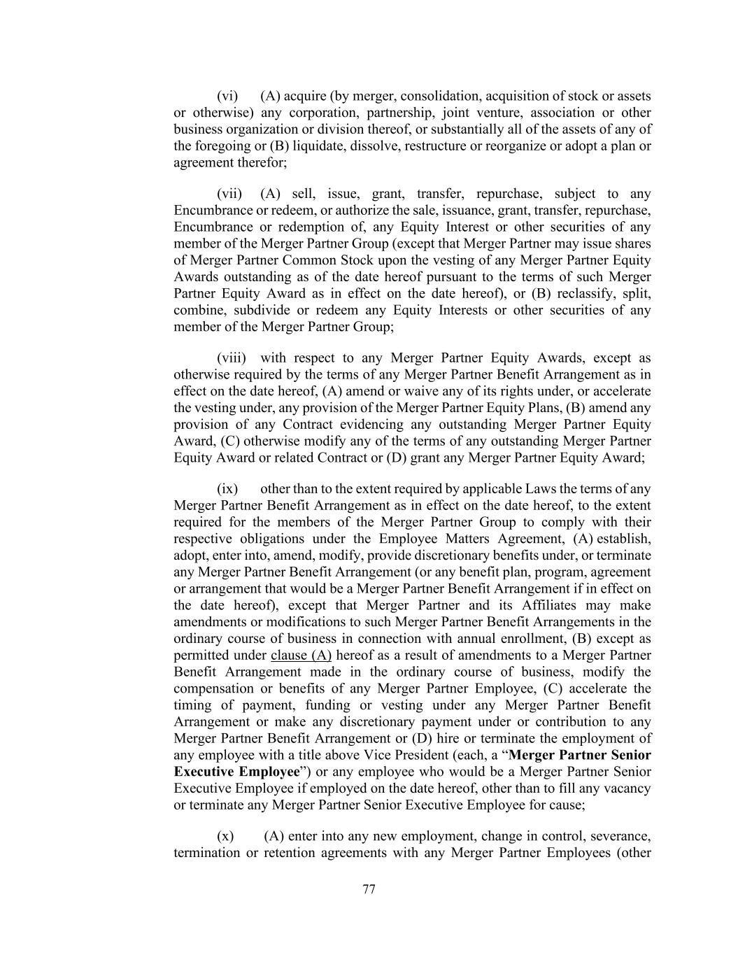 77 (vi) (A) acquire (by merger, consolidation, acquisition of stock or assets or otherwise) any corporation, partnership, joint venture, association or other business organization or division thereof, or substantially all of the assets of any of the foregoing or (B) liquidate, dissolve, restructure or reorganize or adopt a plan or agreement therefor; (vii) (A) sell, issue, grant, transfer, repurchase, subject to any Encumbrance or redeem, or authorize the sale, issuance, grant, transfer, repurchase, Encumbrance or redemption of, any Equity Interest or other securities of any member of the Merger Partner Group (except that Merger Partner may issue shares of Merger Partner Common Stock upon the vesting of any Merger Partner Equity Awards outstanding as of the date hereof pursuant to the terms of such Merger Partner Equity Award as in effect on the date hereof), or (B) reclassify, split, combine, subdivide or redeem any Equity Interests or other securities of any member of the Merger Partner Group; (viii) with respect to any Merger Partner Equity Awards, except as otherwise required by the terms of any Merger Partner Benefit Arrangement as in effect on the date hereof, (A) amend or waive any of its rights under, or accelerate the vesting under, any provision of the Merger Partner Equity Plans, (B) amend any provision of any Contract evidencing any outstanding Merger Partner Equity Award, (C) otherwise modify any of the terms of any outstanding Merger Partner Equity Award or related Contract or (D) grant any Merger Partner Equity Award; (ix) other than to the extent required by applicable Laws the terms of any Merger Partner Benefit Arrangement as in effect on the date hereof, to the extent required for the members of the Merger Partner Group to comply with their respective obligations under the Employee Matters Agreement, (A) establish, adopt, enter into, amend, modify, provide discretionary benefits under, or terminate any Merger Partner Benefit Arrangement (or any benefit plan, program, agreement or arrangement that would be a Merger Partner Benefit Arrangement if in effect on the date hereof), except that Merger Partner and its Affiliates may make amendments or modifications to such Merger Partner Benefit Arrangements in the ordinary course of business in connection with annual enrollment, (B) except as permitted under clause (A) hereof as a result of amendments to a Merger Partner Benefit Arrangement made in the ordinary course of business, modify the compensation or benefits of any Merger Partner Employee, (C) accelerate the timing of payment, funding or vesting under any Merger Partner Benefit Arrangement or make any discretionary payment under or contribution to any Merger Partner Benefit Arrangement or (D) hire or terminate the employment of any employee with a title above Vice President (each, a “Merger Partner Senior Executive Employee”) or any employee who would be a Merger Partner Senior Executive Employee if employed on the date hereof, other than to fill any vacancy or terminate any Merger Partner Senior Executive Employee for cause; (x) (A) enter into any new employment, change in control, severance, termination or retention agreements with any Merger Partner Employees (other