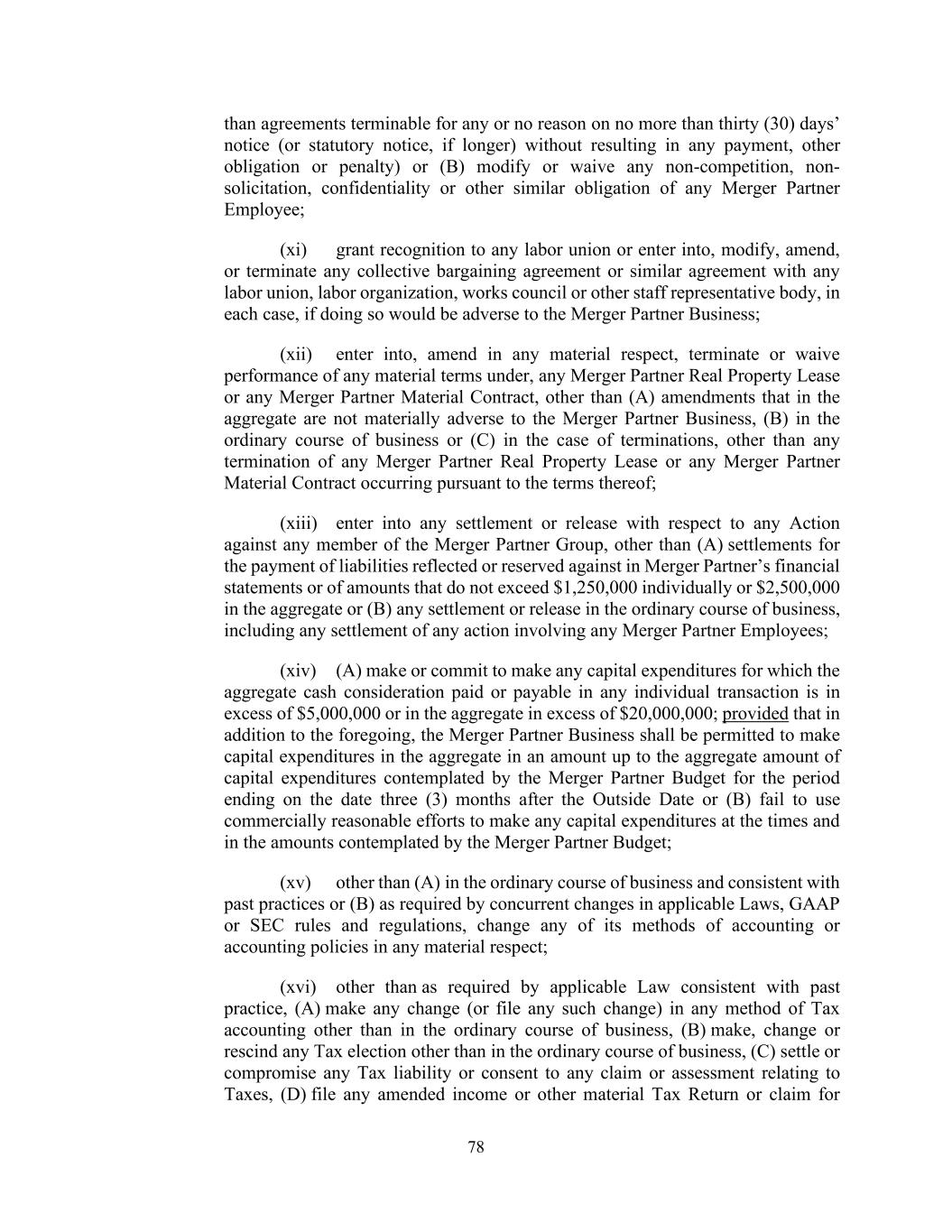 78 than agreements terminable for any or no reason on no more than thirty (30) days’ notice (or statutory notice, if longer) without resulting in any payment, other obligation or penalty) or (B) modify or waive any non-competition, non- solicitation, confidentiality or other similar obligation of any Merger Partner Employee; (xi) grant recognition to any labor union or enter into, modify, amend, or terminate any collective bargaining agreement or similar agreement with any labor union, labor organization, works council or other staff representative body, in each case, if doing so would be adverse to the Merger Partner Business; (xii) enter into, amend in any material respect, terminate or waive performance of any material terms under, any Merger Partner Real Property Lease or any Merger Partner Material Contract, other than (A) amendments that in the aggregate are not materially adverse to the Merger Partner Business, (B) in the ordinary course of business or (C) in the case of terminations, other than any termination of any Merger Partner Real Property Lease or any Merger Partner Material Contract occurring pursuant to the terms thereof; (xiii) enter into any settlement or release with respect to any Action against any member of the Merger Partner Group, other than (A) settlements for the payment of liabilities reflected or reserved against in Merger Partner’s financial statements or of amounts that do not exceed $1,250,000 individually or $2,500,000 in the aggregate or (B) any settlement or release in the ordinary course of business, including any settlement of any action involving any Merger Partner Employees; (xiv) (A) make or commit to make any capital expenditures for which the aggregate cash consideration paid or payable in any individual transaction is in excess of $5,000,000 or in the aggregate in excess of $20,000,000; provided that in addition to the foregoing, the Merger Partner Business shall be permitted to make capital expenditures in the aggregate in an amount up to the aggregate amount of capital expenditures contemplated by the Merger Partner Budget for the period ending on the date three (3) months after the Outside Date or (B) fail to use commercially reasonable efforts to make any capital expenditures at the times and in the amounts contemplated by the Merger Partner Budget; (xv) other than (A) in the ordinary course of business and consistent with past practices or (B) as required by concurrent changes in applicable Laws, GAAP or SEC rules and regulations, change any of its methods of accounting or accounting policies in any material respect; (xvi) other than as required by applicable Law consistent with past practice, (A) make any change (or file any such change) in any method of Tax accounting other than in the ordinary course of business, (B) make, change or rescind any Tax election other than in the ordinary course of business, (C) settle or compromise any Tax liability or consent to any claim or assessment relating to Taxes, (D) file any amended income or other material Tax Return or claim for