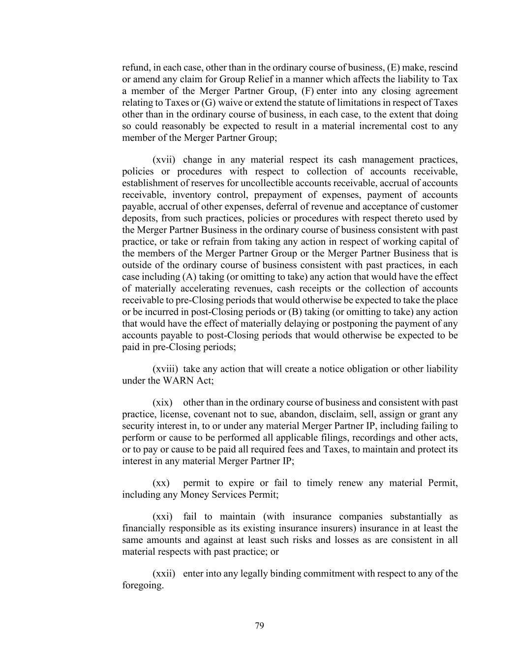 79 refund, in each case, other than in the ordinary course of business, (E) make, rescind or amend any claim for Group Relief in a manner which affects the liability to Tax a member of the Merger Partner Group, (F) enter into any closing agreement relating to Taxes or (G) waive or extend the statute of limitations in respect of Taxes other than in the ordinary course of business, in each case, to the extent that doing so could reasonably be expected to result in a material incremental cost to any member of the Merger Partner Group; (xvii) change in any material respect its cash management practices, policies or procedures with respect to collection of accounts receivable, establishment of reserves for uncollectible accounts receivable, accrual of accounts receivable, inventory control, prepayment of expenses, payment of accounts payable, accrual of other expenses, deferral of revenue and acceptance of customer deposits, from such practices, policies or procedures with respect thereto used by the Merger Partner Business in the ordinary course of business consistent with past practice, or take or refrain from taking any action in respect of working capital of the members of the Merger Partner Group or the Merger Partner Business that is outside of the ordinary course of business consistent with past practices, in each case including (A) taking (or omitting to take) any action that would have the effect of materially accelerating revenues, cash receipts or the collection of accounts receivable to pre-Closing periods that would otherwise be expected to take the place or be incurred in post-Closing periods or (B) taking (or omitting to take) any action that would have the effect of materially delaying or postponing the payment of any accounts payable to post-Closing periods that would otherwise be expected to be paid in pre-Closing periods; (xviii) take any action that will create a notice obligation or other liability under the WARN Act; (xix) other than in the ordinary course of business and consistent with past practice, license, covenant not to sue, abandon, disclaim, sell, assign or grant any security interest in, to or under any material Merger Partner IP, including failing to perform or cause to be performed all applicable filings, recordings and other acts, or to pay or cause to be paid all required fees and Taxes, to maintain and protect its interest in any material Merger Partner IP; (xx) permit to expire or fail to timely renew any material Permit, including any Money Services Permit; (xxi) fail to maintain (with insurance companies substantially as financially responsible as its existing insurance insurers) insurance in at least the same amounts and against at least such risks and losses as are consistent in all material respects with past practice; or (xxii) enter into any legally binding commitment with respect to any of the foregoing.