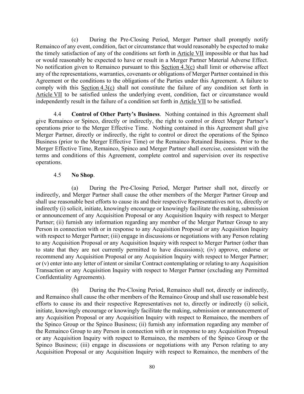 80 (c) During the Pre-Closing Period, Merger Partner shall promptly notify Remainco of any event, condition, fact or circumstance that would reasonably be expected to make the timely satisfaction of any of the conditions set forth in Article VII impossible or that has had or would reasonably be expected to have or result in a Merger Partner Material Adverse Effect. No notification given to Remainco pursuant to this Section 4.3(c) shall limit or otherwise affect any of the representations, warranties, covenants or obligations of Merger Partner contained in this Agreement or the conditions to the obligations of the Parties under this Agreement. A failure to comply with this Section 4.3(c) shall not constitute the failure of any condition set forth in Article VII to be satisfied unless the underlying event, condition, fact or circumstance would independently result in the failure of a condition set forth in Article VII to be satisfied. 4.4 Control of Other Party’s Business. Nothing contained in this Agreement shall give Remainco or Spinco, directly or indirectly, the right to control or direct Merger Partner’s operations prior to the Merger Effective Time. Nothing contained in this Agreement shall give Merger Partner, directly or indirectly, the right to control or direct the operations of the Spinco Business (prior to the Merger Effective Time) or the Remainco Retained Business. Prior to the Merger Effective Time, Remainco, Spinco and Merger Partner shall exercise, consistent with the terms and conditions of this Agreement, complete control and supervision over its respective operations. 4.5 No Shop. (a) During the Pre-Closing Period, Merger Partner shall not, directly or indirectly, and Merger Partner shall cause the other members of the Merger Partner Group and shall use reasonable best efforts to cause its and their respective Representatives not to, directly or indirectly (i) solicit, initiate, knowingly encourage or knowingly facilitate the making, submission or announcement of any Acquisition Proposal or any Acquisition Inquiry with respect to Merger Partner; (ii) furnish any information regarding any member of the Merger Partner Group to any Person in connection with or in response to any Acquisition Proposal or any Acquisition Inquiry with respect to Merger Partner; (iii) engage in discussions or negotiations with any Person relating to any Acquisition Proposal or any Acquisition Inquiry with respect to Merger Partner (other than to state that they are not currently permitted to have discussions); (iv) approve, endorse or recommend any Acquisition Proposal or any Acquisition Inquiry with respect to Merger Partner; or (v) enter into any letter of intent or similar Contract contemplating or relating to any Acquisition Transaction or any Acquisition Inquiry with respect to Merger Partner (excluding any Permitted Confidentiality Agreements). (b) During the Pre-Closing Period, Remainco shall not, directly or indirectly, and Remainco shall cause the other members of the Remainco Group and shall use reasonable best efforts to cause its and their respective Representatives not to, directly or indirectly (i) solicit, initiate, knowingly encourage or knowingly facilitate the making, submission or announcement of any Acquisition Proposal or any Acquisition Inquiry with respect to Remainco, the members of the Spinco Group or the Spinco Business; (ii) furnish any information regarding any member of the Remainco Group to any Person in connection with or in response to any Acquisition Proposal or any Acquisition Inquiry with respect to Remainco, the members of the Spinco Group or the Spinco Business; (iii) engage in discussions or negotiations with any Person relating to any Acquisition Proposal or any Acquisition Inquiry with respect to Remainco, the members of the