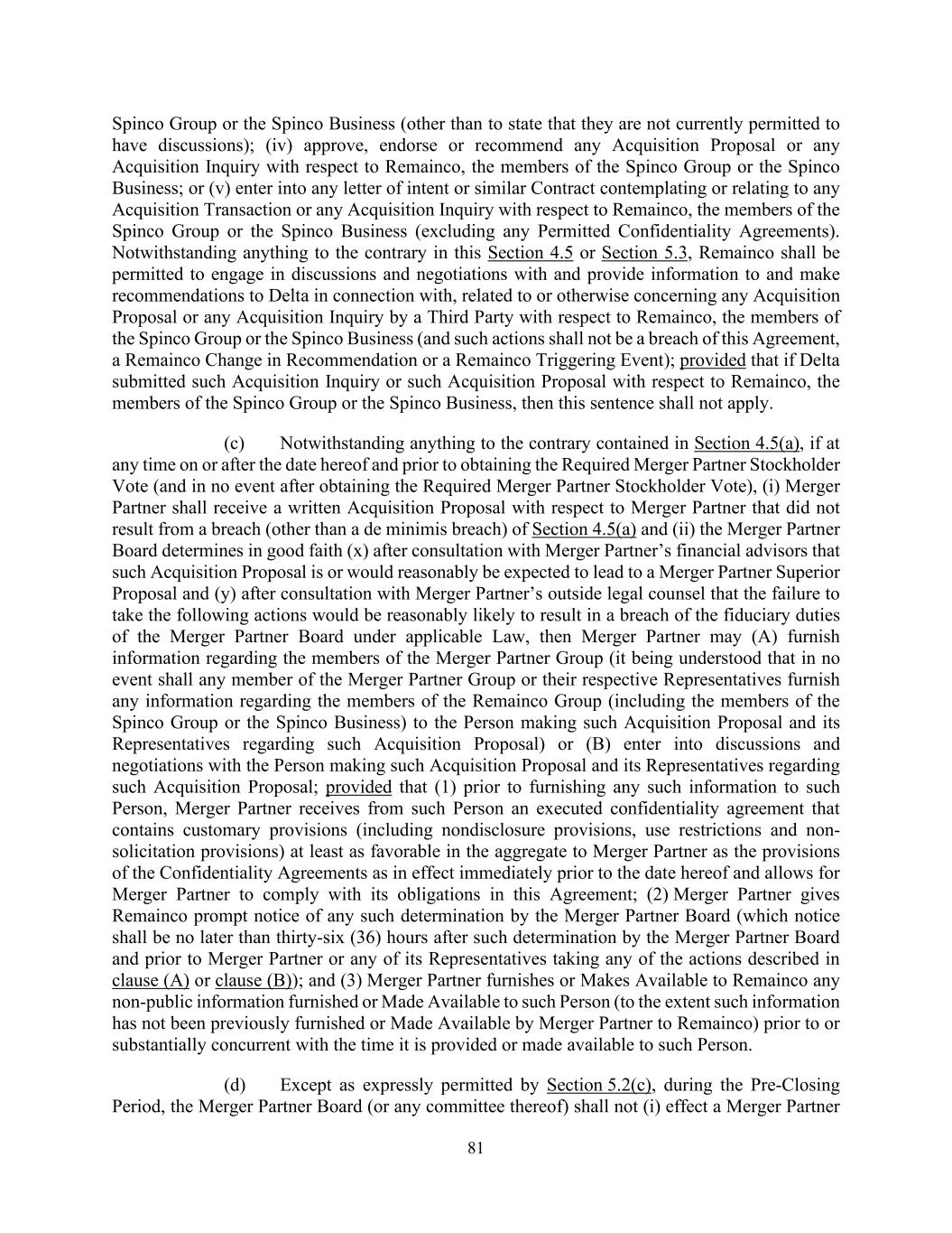 81 Spinco Group or the Spinco Business (other than to state that they are not currently permitted to have discussions); (iv) approve, endorse or recommend any Acquisition Proposal or any Acquisition Inquiry with respect to Remainco, the members of the Spinco Group or the Spinco Business; or (v) enter into any letter of intent or similar Contract contemplating or relating to any Acquisition Transaction or any Acquisition Inquiry with respect to Remainco, the members of the Spinco Group or the Spinco Business (excluding any Permitted Confidentiality Agreements). Notwithstanding anything to the contrary in this Section 4.5 or Section 5.3, Remainco shall be permitted to engage in discussions and negotiations with and provide information to and make recommendations to Delta in connection with, related to or otherwise concerning any Acquisition Proposal or any Acquisition Inquiry by a Third Party with respect to Remainco, the members of the Spinco Group or the Spinco Business (and such actions shall not be a breach of this Agreement, a Remainco Change in Recommendation or a Remainco Triggering Event); provided that if Delta submitted such Acquisition Inquiry or such Acquisition Proposal with respect to Remainco, the members of the Spinco Group or the Spinco Business, then this sentence shall not apply. (c) Notwithstanding anything to the contrary contained in Section 4.5(a), if at any time on or after the date hereof and prior to obtaining the Required Merger Partner Stockholder Vote (and in no event after obtaining the Required Merger Partner Stockholder Vote), (i) Merger Partner shall receive a written Acquisition Proposal with respect to Merger Partner that did not result from a breach (other than a de minimis breach) of Section 4.5(a) and (ii) the Merger Partner Board determines in good faith (x) after consultation with Merger Partner’s financial advisors that such Acquisition Proposal is or would reasonably be expected to lead to a Merger Partner Superior Proposal and (y) after consultation with Merger Partner’s outside legal counsel that the failure to take the following actions would be reasonably likely to result in a breach of the fiduciary duties of the Merger Partner Board under applicable Law, then Merger Partner may (A) furnish information regarding the members of the Merger Partner Group (it being understood that in no event shall any member of the Merger Partner Group or their respective Representatives furnish any information regarding the members of the Remainco Group (including the members of the Spinco Group or the Spinco Business) to the Person making such Acquisition Proposal and its Representatives regarding such Acquisition Proposal) or (B) enter into discussions and negotiations with the Person making such Acquisition Proposal and its Representatives regarding such Acquisition Proposal; provided that (1) prior to furnishing any such information to such Person, Merger Partner receives from such Person an executed confidentiality agreement that contains customary provisions (including nondisclosure provisions, use restrictions and non- solicitation provisions) at least as favorable in the aggregate to Merger Partner as the provisions of the Confidentiality Agreements as in effect immediately prior to the date hereof and allows for Merger Partner to comply with its obligations in this Agreement; (2) Merger Partner gives Remainco prompt notice of any such determination by the Merger Partner Board (which notice shall be no later than thirty-six (36) hours after such determination by the Merger Partner Board and prior to Merger Partner or any of its Representatives taking any of the actions described in clause (A) or clause (B)); and (3) Merger Partner furnishes or Makes Available to Remainco any non-public information furnished or Made Available to such Person (to the extent such information has not been previously furnished or Made Available by Merger Partner to Remainco) prior to or substantially concurrent with the time it is provided or made available to such Person. (d) Except as expressly permitted by Section 5.2(c), during the Pre-Closing Period, the Merger Partner Board (or any committee thereof) shall not (i) effect a Merger Partner