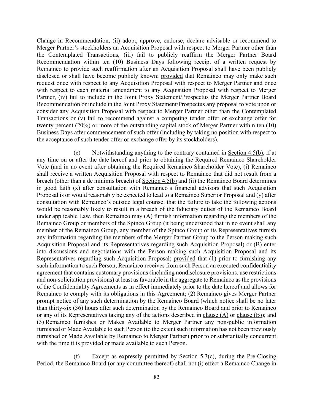 82 Change in Recommendation, (ii) adopt, approve, endorse, declare advisable or recommend to Merger Partner’s stockholders an Acquisition Proposal with respect to Merger Partner other than the Contemplated Transactions, (iii) fail to publicly reaffirm the Merger Partner Board Recommendation within ten (10) Business Days following receipt of a written request by Remainco to provide such reaffirmation after an Acquisition Proposal shall have been publicly disclosed or shall have become publicly known; provided that Remainco may only make such request once with respect to any Acquisition Proposal with respect to Merger Partner and once with respect to each material amendment to any Acquisition Proposal with respect to Merger Partner, (iv) fail to include in the Joint Proxy Statement/Prospectus the Merger Partner Board Recommendation or include in the Joint Proxy Statement/Prospectus any proposal to vote upon or consider any Acquisition Proposal with respect to Merger Partner other than the Contemplated Transactions or (v) fail to recommend against a competing tender offer or exchange offer for twenty percent (20%) or more of the outstanding capital stock of Merger Partner within ten (10) Business Days after commencement of such offer (including by taking no position with respect to the acceptance of such tender offer or exchange offer by its stockholders). (e) Notwithstanding anything to the contrary contained in Section 4.5(b), if at any time on or after the date hereof and prior to obtaining the Required Remainco Shareholder Vote (and in no event after obtaining the Required Remainco Shareholder Vote), (i) Remainco shall receive a written Acquisition Proposal with respect to Remainco that did not result from a breach (other than a de minimis breach) of Section 4.5(b) and (ii) the Remainco Board determines in good faith (x) after consultation with Remainco’s financial advisors that such Acquisition Proposal is or would reasonably be expected to lead to a Remainco Superior Proposal and (y) after consultation with Remainco’s outside legal counsel that the failure to take the following actions would be reasonably likely to result in a breach of the fiduciary duties of the Remainco Board under applicable Law, then Remainco may (A) furnish information regarding the members of the Remainco Group or members of the Spinco Group (it being understood that in no event shall any member of the Remainco Group, any member of the Spinco Group or its Representatives furnish any information regarding the members of the Merger Partner Group to the Person making such Acquisition Proposal and its Representatives regarding such Acquisition Proposal) or (B) enter into discussions and negotiations with the Person making such Acquisition Proposal and its Representatives regarding such Acquisition Proposal; provided that (1) prior to furnishing any such information to such Person, Remainco receives from such Person an executed confidentiality agreement that contains customary provisions (including nondisclosure provisions, use restrictions and non-solicitation provisions) at least as favorable in the aggregate to Remainco as the provisions of the Confidentiality Agreements as in effect immediately prior to the date hereof and allows for Remainco to comply with its obligations in this Agreement; (2) Remainco gives Merger Partner prompt notice of any such determination by the Remainco Board (which notice shall be no later than thirty-six (36) hours after such determination by the Remainco Board and prior to Remainco or any of its Representatives taking any of the actions described in clause (A) or clause (B)); and (3) Remainco furnishes or Makes Available to Merger Partner any non-public information furnished or Made Available to such Person (to the extent such information has not been previously furnished or Made Available by Remainco to Merger Partner) prior to or substantially concurrent with the time it is provided or made available to such Person. (f) Except as expressly permitted by Section 5.3(c), during the Pre-Closing Period, the Remainco Board (or any committee thereof) shall not (i) effect a Remainco Change in