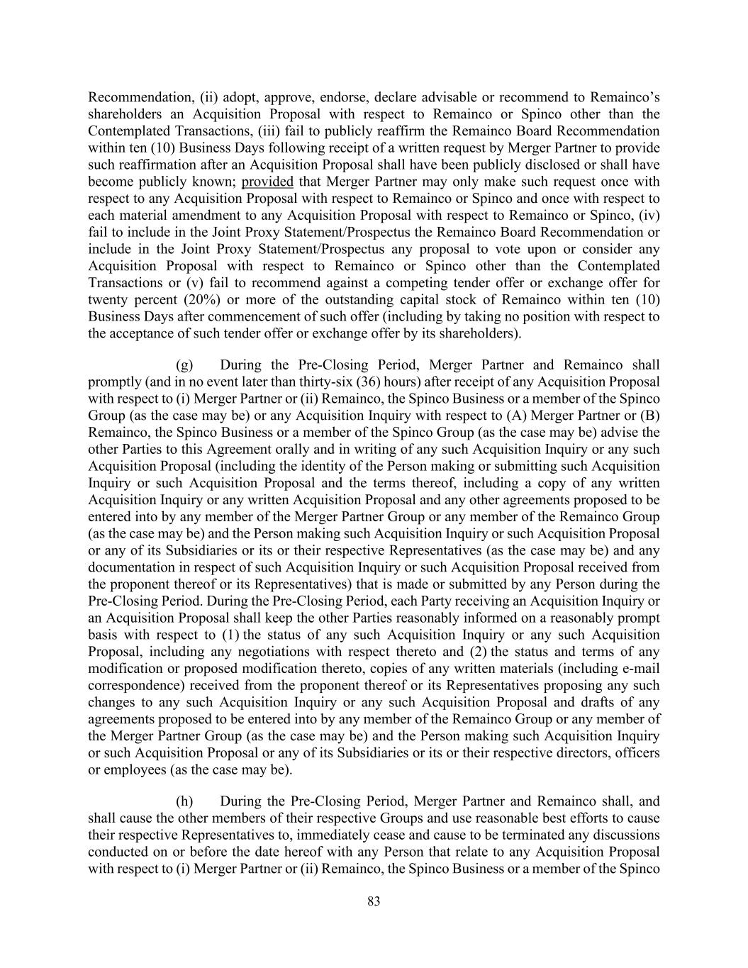 83 Recommendation, (ii) adopt, approve, endorse, declare advisable or recommend to Remainco’s shareholders an Acquisition Proposal with respect to Remainco or Spinco other than the Contemplated Transactions, (iii) fail to publicly reaffirm the Remainco Board Recommendation within ten (10) Business Days following receipt of a written request by Merger Partner to provide such reaffirmation after an Acquisition Proposal shall have been publicly disclosed or shall have become publicly known; provided that Merger Partner may only make such request once with respect to any Acquisition Proposal with respect to Remainco or Spinco and once with respect to each material amendment to any Acquisition Proposal with respect to Remainco or Spinco, (iv) fail to include in the Joint Proxy Statement/Prospectus the Remainco Board Recommendation or include in the Joint Proxy Statement/Prospectus any proposal to vote upon or consider any Acquisition Proposal with respect to Remainco or Spinco other than the Contemplated Transactions or (v) fail to recommend against a competing tender offer or exchange offer for twenty percent (20%) or more of the outstanding capital stock of Remainco within ten (10) Business Days after commencement of such offer (including by taking no position with respect to the acceptance of such tender offer or exchange offer by its shareholders). (g) During the Pre-Closing Period, Merger Partner and Remainco shall promptly (and in no event later than thirty-six (36) hours) after receipt of any Acquisition Proposal with respect to (i) Merger Partner or (ii) Remainco, the Spinco Business or a member of the Spinco Group (as the case may be) or any Acquisition Inquiry with respect to (A) Merger Partner or (B) Remainco, the Spinco Business or a member of the Spinco Group (as the case may be) advise the other Parties to this Agreement orally and in writing of any such Acquisition Inquiry or any such Acquisition Proposal (including the identity of the Person making or submitting such Acquisition Inquiry or such Acquisition Proposal and the terms thereof, including a copy of any written Acquisition Inquiry or any written Acquisition Proposal and any other agreements proposed to be entered into by any member of the Merger Partner Group or any member of the Remainco Group (as the case may be) and the Person making such Acquisition Inquiry or such Acquisition Proposal or any of its Subsidiaries or its or their respective Representatives (as the case may be) and any documentation in respect of such Acquisition Inquiry or such Acquisition Proposal received from the proponent thereof or its Representatives) that is made or submitted by any Person during the Pre-Closing Period. During the Pre-Closing Period, each Party receiving an Acquisition Inquiry or an Acquisition Proposal shall keep the other Parties reasonably informed on a reasonably prompt basis with respect to (1) the status of any such Acquisition Inquiry or any such Acquisition Proposal, including any negotiations with respect thereto and (2) the status and terms of any modification or proposed modification thereto, copies of any written materials (including e-mail correspondence) received from the proponent thereof or its Representatives proposing any such changes to any such Acquisition Inquiry or any such Acquisition Proposal and drafts of any agreements proposed to be entered into by any member of the Remainco Group or any member of the Merger Partner Group (as the case may be) and the Person making such Acquisition Inquiry or such Acquisition Proposal or any of its Subsidiaries or its or their respective directors, officers or employees (as the case may be). (h) During the Pre-Closing Period, Merger Partner and Remainco shall, and shall cause the other members of their respective Groups and use reasonable best efforts to cause their respective Representatives to, immediately cease and cause to be terminated any discussions conducted on or before the date hereof with any Person that relate to any Acquisition Proposal with respect to (i) Merger Partner or (ii) Remainco, the Spinco Business or a member of the Spinco