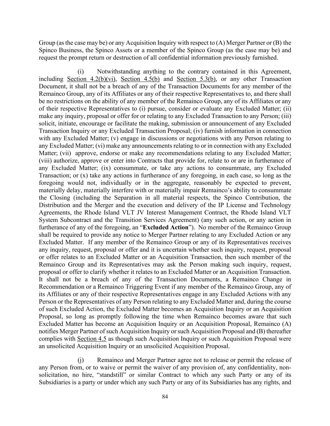 84 Group (as the case may be) or any Acquisition Inquiry with respect to (A) Merger Partner or (B) the Spinco Business, the Spinco Assets or a member of the Spinco Group (as the case may be) and request the prompt return or destruction of all confidential information previously furnished. (i) Notwithstanding anything to the contrary contained in this Agreement, including Section 4.2(b)(vi), Section 4.5(b) and Section 5.3(b), or any other Transaction Document, it shall not be a breach of any of the Transaction Documents for any member of the Remainco Group, any of its Affiliates or any of their respective Representatives to, and there shall be no restrictions on the ability of any member of the Remainco Group, any of its Affiliates or any of their respective Representatives to (i) pursue, consider or evaluate any Excluded Matter; (ii) make any inquiry, proposal or offer for or relating to any Excluded Transaction to any Person; (iii) solicit, initiate, encourage or facilitate the making, submission or announcement of any Excluded Transaction Inquiry or any Excluded Transaction Proposal; (iv) furnish information in connection with any Excluded Matter; (v) engage in discussions or negotiations with any Person relating to any Excluded Matter; (vi) make any announcements relating to or in connection with any Excluded Matter; (vii) approve, endorse or make any recommendations relating to any Excluded Matter; (viii) authorize, approve or enter into Contracts that provide for, relate to or are in furtherance of any Excluded Matter; (ix) consummate, or take any actions to consummate, any Excluded Transaction; or (x) take any actions in furtherance of any foregoing, in each case, so long as the foregoing would not, individually or in the aggregate, reasonably be expected to prevent, materially delay, materially interfere with or materially impair Remainco’s ability to consummate the Closing (including the Separation in all material respects, the Spinco Contribution, the Distribution and the Merger and the execution and delivery of the IP License and Technology Agreements, the Rhode Island VLT JV Interest Management Contract, the Rhode Island VLT System Subcontract and the Transition Services Agreement) (any such action, or any action in furtherance of any of the foregoing, an “Excluded Action”). No member of the Remainco Group shall be required to provide any notice to Merger Partner relating to any Excluded Action or any Excluded Matter. If any member of the Remainco Group or any of its Representatives receives any inquiry, request, proposal or offer and it is uncertain whether such inquiry, request, proposal or offer relates to an Excluded Matter or an Acquisition Transaction, then such member of the Remainco Group and its Representatives may ask the Person making such inquiry, request, proposal or offer to clarify whether it relates to an Excluded Matter or an Acquisition Transaction. It shall not be a breach of any of the Transaction Documents, a Remainco Change in Recommendation or a Remainco Triggering Event if any member of the Remainco Group, any of its Affiliates or any of their respective Representatives engage in any Excluded Actions with any Person or the Representatives of any Person relating to any Excluded Matter and, during the course of such Excluded Action, the Excluded Matter becomes an Acquisition Inquiry or an Acquisition Proposal, so long as promptly following the time when Remainco becomes aware that such Excluded Matter has become an Acquisition Inquiry or an Acquisition Proposal, Remainco (A) notifies Merger Partner of such Acquisition Inquiry or such Acquisition Proposal and (B) thereafter complies with Section 4.5 as though such Acquisition Inquiry or such Acquisition Proposal were an unsolicited Acquisition Inquiry or an unsolicited Acquisition Proposal. (j) Remainco and Merger Partner agree not to release or permit the release of any Person from, or to waive or permit the waiver of any provision of, any confidentiality, non- solicitation, no hire, “standstill” or similar Contract to which any such Party or any of its Subsidiaries is a party or under which any such Party or any of its Subsidiaries has any rights, and