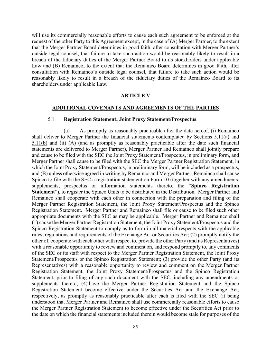 85 will use its commercially reasonable efforts to cause each such agreement to be enforced at the request of the other Party to this Agreement except, in the case of (A) Merger Partner, to the extent that the Merger Partner Board determines in good faith, after consultation with Merger Partner’s outside legal counsel, that failure to take such action would be reasonably likely to result in a breach of the fiduciary duties of the Merger Partner Board to its stockholders under applicable Law and (B) Remainco, to the extent that the Remainco Board determines in good faith, after consultation with Remainco’s outside legal counsel, that failure to take such action would be reasonably likely to result in a breach of the fiduciary duties of the Remainco Board to its shareholders under applicable Law. ARTICLE V ADDITIONAL COVENANTS AND AGREEMENTS OF THE PARTIES 5.1 Registration Statement; Joint Proxy Statement/Prospectus. (a) As promptly as reasonably practicable after the date hereof, (i) Remainco shall deliver to Merger Partner the financial statements contemplated by Sections 5.11(a) and 5.11(b) and (ii) (A) (and as promptly as reasonably practicable after the date such financial statements are delivered to Merger Partner), Merger Partner and Remainco shall jointly prepare and cause to be filed with the SEC the Joint Proxy Statement/Prospectus, in preliminary form, and Merger Partner shall cause to be filed with the SEC the Merger Partner Registration Statement, in which the Joint Proxy Statement/Prospectus, in preliminary form, will be included as a prospectus, and (B) unless otherwise agreed in writing by Remainco and Merger Partner, Remainco shall cause Spinco to file with the SEC a registration statement on Form 10 (together with any amendments, supplements, prospectus or information statements thereto, the “Spinco Registration Statement”), to register the Spinco Units to be distributed in the Distribution. Merger Partner and Remainco shall cooperate with each other in connection with the preparation and filing of the Merger Partner Registration Statement, the Joint Proxy Statement/Prospectus and the Spinco Registration Statement. Merger Partner and Remainco shall file or cause to be filed such other appropriate documents with the SEC as may be applicable. Merger Partner and Remainco shall (1) cause the Merger Partner Registration Statement, the Joint Proxy Statement/Prospectus and the Spinco Registration Statement to comply as to form in all material respects with the applicable rules, regulations and requirements of the Exchange Act or Securities Act; (2) promptly notify the other of, cooperate with each other with respect to, provide the other Party (and its Representatives) with a reasonable opportunity to review and comment on, and respond promptly to, any comments of the SEC or its staff with respect to the Merger Partner Registration Statement, the Joint Proxy Statement/Prospectus or the Spinco Registration Statement; (3) provide the other Party (and its Representatives) with a reasonable opportunity to review and comment on the Merger Partner Registration Statement, the Joint Proxy Statement/Prospectus and the Spinco Registration Statement, prior to filing of any such document with the SEC, including any amendments or supplements thereto; (4) have the Merger Partner Registration Statement and the Spinco Registration Statement become effective under the Securities Act and the Exchange Act, respectively, as promptly as reasonably practicable after each is filed with the SEC (it being understood that Merger Partner and Remainco shall use commercially reasonable efforts to cause the Merger Partner Registration Statement to become effective under the Securities Act prior to the date on which the financial statements included therein would become stale for purposes of the