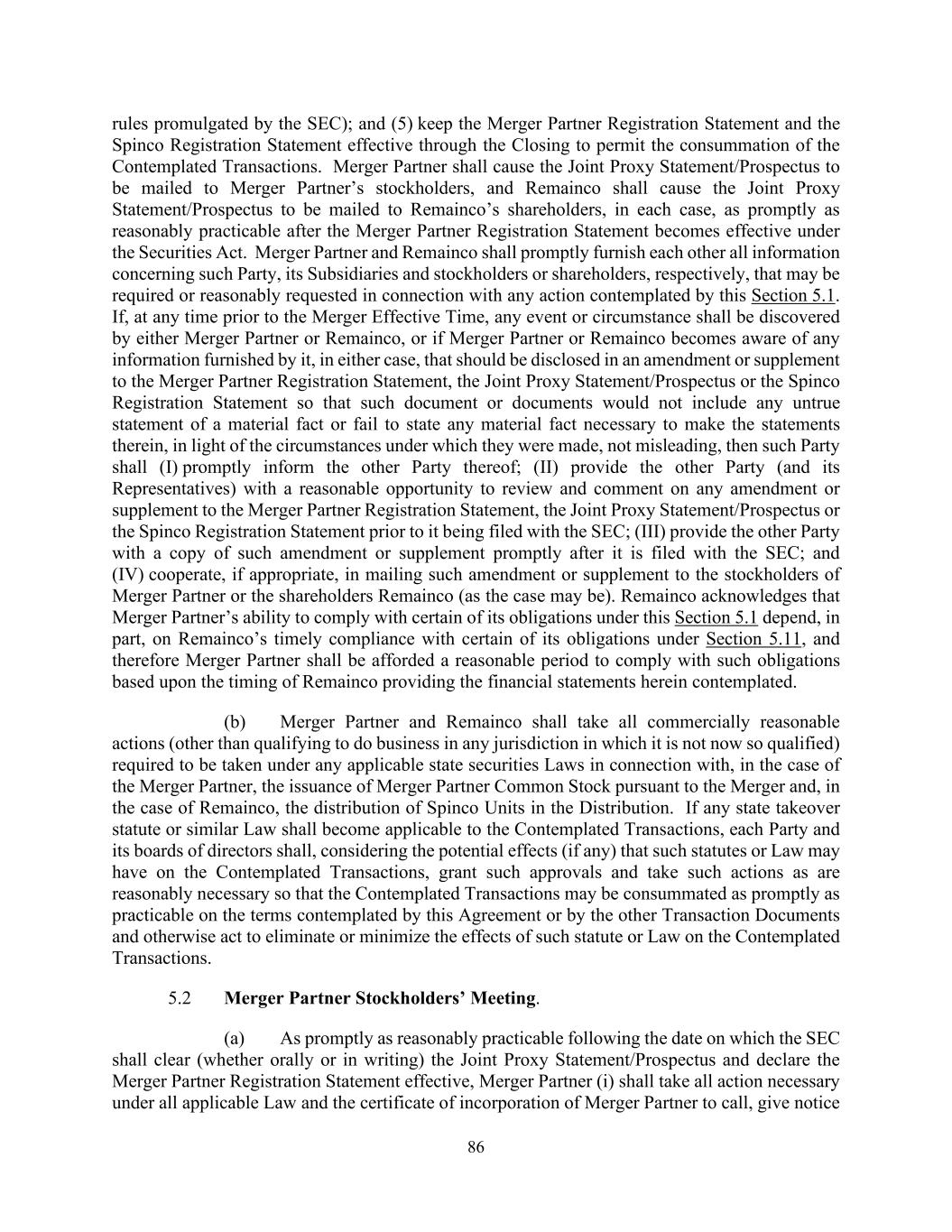 86 rules promulgated by the SEC); and (5) keep the Merger Partner Registration Statement and the Spinco Registration Statement effective through the Closing to permit the consummation of the Contemplated Transactions. Merger Partner shall cause the Joint Proxy Statement/Prospectus to be mailed to Merger Partner’s stockholders, and Remainco shall cause the Joint Proxy Statement/Prospectus to be mailed to Remainco’s shareholders, in each case, as promptly as reasonably practicable after the Merger Partner Registration Statement becomes effective under the Securities Act. Merger Partner and Remainco shall promptly furnish each other all information concerning such Party, its Subsidiaries and stockholders or shareholders, respectively, that may be required or reasonably requested in connection with any action contemplated by this Section 5.1. If, at any time prior to the Merger Effective Time, any event or circumstance shall be discovered by either Merger Partner or Remainco, or if Merger Partner or Remainco becomes aware of any information furnished by it, in either case, that should be disclosed in an amendment or supplement to the Merger Partner Registration Statement, the Joint Proxy Statement/Prospectus or the Spinco Registration Statement so that such document or documents would not include any untrue statement of a material fact or fail to state any material fact necessary to make the statements therein, in light of the circumstances under which they were made, not misleading, then such Party shall (I) promptly inform the other Party thereof; (II) provide the other Party (and its Representatives) with a reasonable opportunity to review and comment on any amendment or supplement to the Merger Partner Registration Statement, the Joint Proxy Statement/Prospectus or the Spinco Registration Statement prior to it being filed with the SEC; (III) provide the other Party with a copy of such amendment or supplement promptly after it is filed with the SEC; and (IV) cooperate, if appropriate, in mailing such amendment or supplement to the stockholders of Merger Partner or the shareholders Remainco (as the case may be). Remainco acknowledges that Merger Partner’s ability to comply with certain of its obligations under this Section 5.1 depend, in part, on Remainco’s timely compliance with certain of its obligations under Section 5.11, and therefore Merger Partner shall be afforded a reasonable period to comply with such obligations based upon the timing of Remainco providing the financial statements herein contemplated. (b) Merger Partner and Remainco shall take all commercially reasonable actions (other than qualifying to do business in any jurisdiction in which it is not now so qualified) required to be taken under any applicable state securities Laws in connection with, in the case of the Merger Partner, the issuance of Merger Partner Common Stock pursuant to the Merger and, in the case of Remainco, the distribution of Spinco Units in the Distribution. If any state takeover statute or similar Law shall become applicable to the Contemplated Transactions, each Party and its boards of directors shall, considering the potential effects (if any) that such statutes or Law may have on the Contemplated Transactions, grant such approvals and take such actions as are reasonably necessary so that the Contemplated Transactions may be consummated as promptly as practicable on the terms contemplated by this Agreement or by the other Transaction Documents and otherwise act to eliminate or minimize the effects of such statute or Law on the Contemplated Transactions. 5.2 Merger Partner Stockholders’ Meeting. (a) As promptly as reasonably practicable following the date on which the SEC shall clear (whether orally or in writing) the Joint Proxy Statement/Prospectus and declare the Merger Partner Registration Statement effective, Merger Partner (i) shall take all action necessary under all applicable Law and the certificate of incorporation of Merger Partner to call, give notice