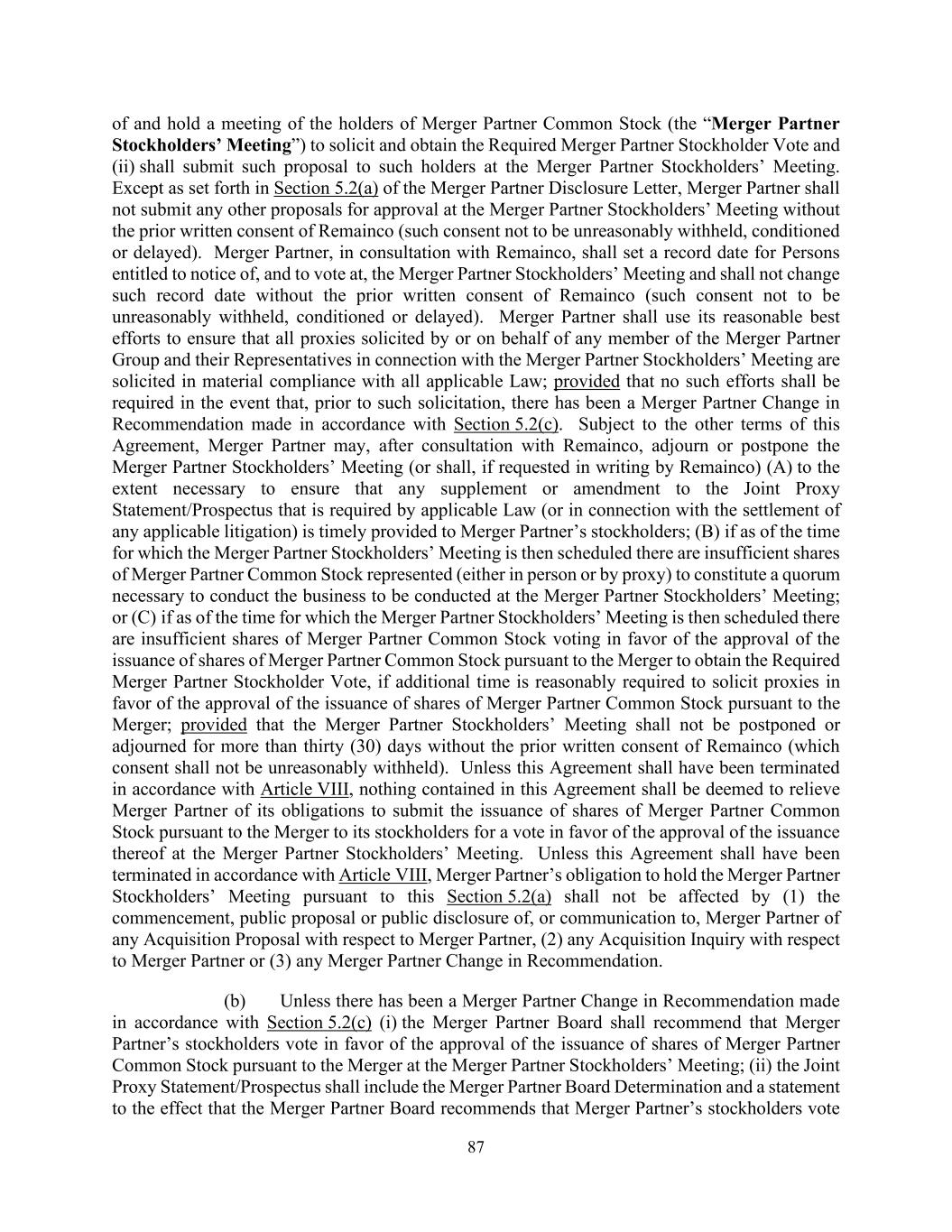 87 of and hold a meeting of the holders of Merger Partner Common Stock (the “Merger Partner Stockholders’ Meeting”) to solicit and obtain the Required Merger Partner Stockholder Vote and (ii) shall submit such proposal to such holders at the Merger Partner Stockholders’ Meeting. Except as set forth in Section 5.2(a) of the Merger Partner Disclosure Letter, Merger Partner shall not submit any other proposals for approval at the Merger Partner Stockholders’ Meeting without the prior written consent of Remainco (such consent not to be unreasonably withheld, conditioned or delayed). Merger Partner, in consultation with Remainco, shall set a record date for Persons entitled to notice of, and to vote at, the Merger Partner Stockholders’ Meeting and shall not change such record date without the prior written consent of Remainco (such consent not to be unreasonably withheld, conditioned or delayed). Merger Partner shall use its reasonable best efforts to ensure that all proxies solicited by or on behalf of any member of the Merger Partner Group and their Representatives in connection with the Merger Partner Stockholders’ Meeting are solicited in material compliance with all applicable Law; provided that no such efforts shall be required in the event that, prior to such solicitation, there has been a Merger Partner Change in Recommendation made in accordance with Section 5.2(c). Subject to the other terms of this Agreement, Merger Partner may, after consultation with Remainco, adjourn or postpone the Merger Partner Stockholders’ Meeting (or shall, if requested in writing by Remainco) (A) to the extent necessary to ensure that any supplement or amendment to the Joint Proxy Statement/Prospectus that is required by applicable Law (or in connection with the settlement of any applicable litigation) is timely provided to Merger Partner’s stockholders; (B) if as of the time for which the Merger Partner Stockholders’ Meeting is then scheduled there are insufficient shares of Merger Partner Common Stock represented (either in person or by proxy) to constitute a quorum necessary to conduct the business to be conducted at the Merger Partner Stockholders’ Meeting; or (C) if as of the time for which the Merger Partner Stockholders’ Meeting is then scheduled there are insufficient shares of Merger Partner Common Stock voting in favor of the approval of the issuance of shares of Merger Partner Common Stock pursuant to the Merger to obtain the Required Merger Partner Stockholder Vote, if additional time is reasonably required to solicit proxies in favor of the approval of the issuance of shares of Merger Partner Common Stock pursuant to the Merger; provided that the Merger Partner Stockholders’ Meeting shall not be postponed or adjourned for more than thirty (30) days without the prior written consent of Remainco (which consent shall not be unreasonably withheld). Unless this Agreement shall have been terminated in accordance with Article VIII, nothing contained in this Agreement shall be deemed to relieve Merger Partner of its obligations to submit the issuance of shares of Merger Partner Common Stock pursuant to the Merger to its stockholders for a vote in favor of the approval of the issuance thereof at the Merger Partner Stockholders’ Meeting. Unless this Agreement shall have been terminated in accordance with Article VIII, Merger Partner’s obligation to hold the Merger Partner Stockholders’ Meeting pursuant to this Section 5.2(a) shall not be affected by (1) the commencement, public proposal or public disclosure of, or communication to, Merger Partner of any Acquisition Proposal with respect to Merger Partner, (2) any Acquisition Inquiry with respect to Merger Partner or (3) any Merger Partner Change in Recommendation. (b) Unless there has been a Merger Partner Change in Recommendation made in accordance with Section 5.2(c) (i) the Merger Partner Board shall recommend that Merger Partner’s stockholders vote in favor of the approval of the issuance of shares of Merger Partner Common Stock pursuant to the Merger at the Merger Partner Stockholders’ Meeting; (ii) the Joint Proxy Statement/Prospectus shall include the Merger Partner Board Determination and a statement to the effect that the Merger Partner Board recommends that Merger Partner’s stockholders vote