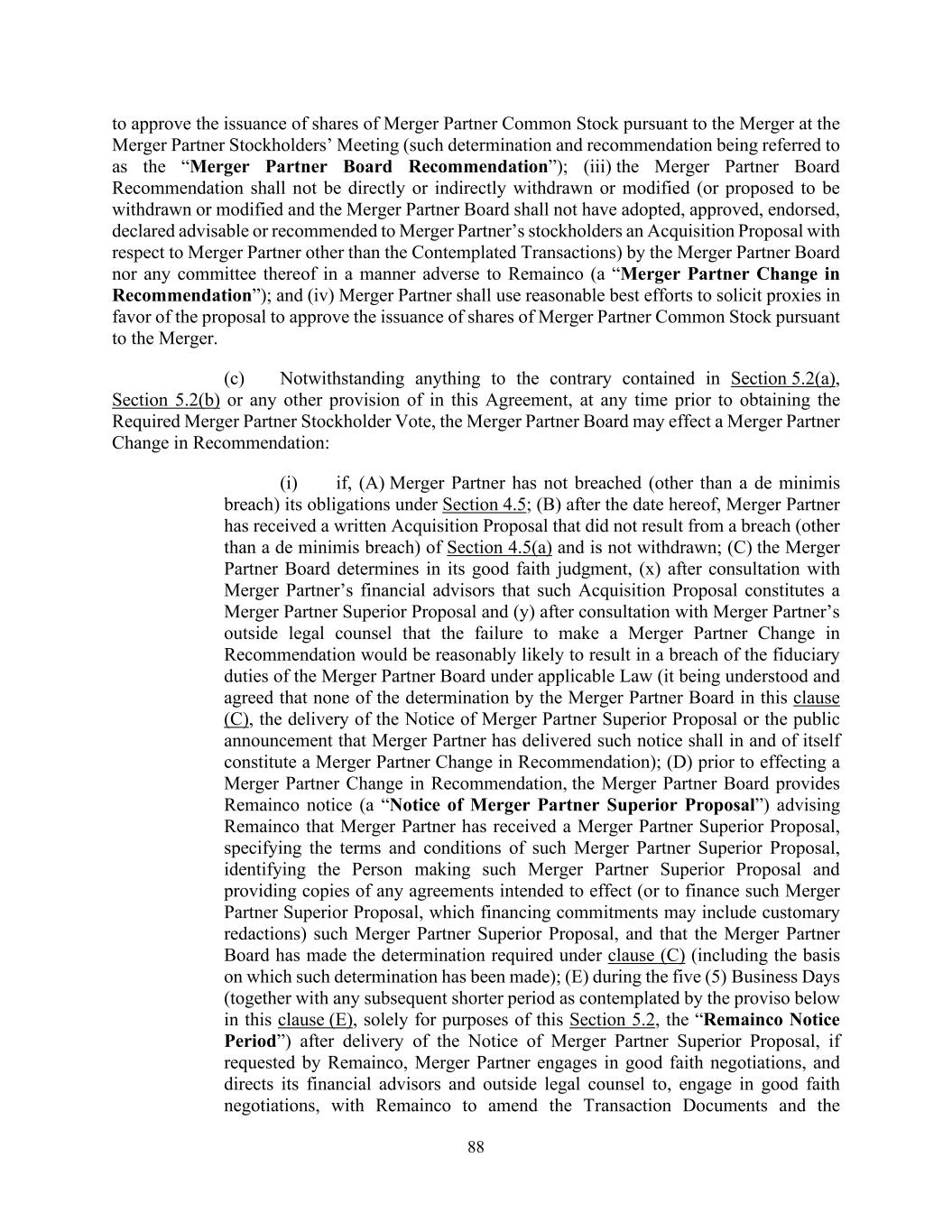 88 to approve the issuance of shares of Merger Partner Common Stock pursuant to the Merger at the Merger Partner Stockholders’ Meeting (such determination and recommendation being referred to as the “Merger Partner Board Recommendation”); (iii) the Merger Partner Board Recommendation shall not be directly or indirectly withdrawn or modified (or proposed to be withdrawn or modified and the Merger Partner Board shall not have adopted, approved, endorsed, declared advisable or recommended to Merger Partner’s stockholders an Acquisition Proposal with respect to Merger Partner other than the Contemplated Transactions) by the Merger Partner Board nor any committee thereof in a manner adverse to Remainco (a “Merger Partner Change in Recommendation”); and (iv) Merger Partner shall use reasonable best efforts to solicit proxies in favor of the proposal to approve the issuance of shares of Merger Partner Common Stock pursuant to the Merger. (c) Notwithstanding anything to the contrary contained in Section 5.2(a), Section 5.2(b) or any other provision of in this Agreement, at any time prior to obtaining the Required Merger Partner Stockholder Vote, the Merger Partner Board may effect a Merger Partner Change in Recommendation: (i) if, (A) Merger Partner has not breached (other than a de minimis breach) its obligations under Section 4.5; (B) after the date hereof, Merger Partner has received a written Acquisition Proposal that did not result from a breach (other than a de minimis breach) of Section 4.5(a) and is not withdrawn; (C) the Merger Partner Board determines in its good faith judgment, (x) after consultation with Merger Partner’s financial advisors that such Acquisition Proposal constitutes a Merger Partner Superior Proposal and (y) after consultation with Merger Partner’s outside legal counsel that the failure to make a Merger Partner Change in Recommendation would be reasonably likely to result in a breach of the fiduciary duties of the Merger Partner Board under applicable Law (it being understood and agreed that none of the determination by the Merger Partner Board in this clause (C), the delivery of the Notice of Merger Partner Superior Proposal or the public announcement that Merger Partner has delivered such notice shall in and of itself constitute a Merger Partner Change in Recommendation); (D) prior to effecting a Merger Partner Change in Recommendation, the Merger Partner Board provides Remainco notice (a “Notice of Merger Partner Superior Proposal”) advising Remainco that Merger Partner has received a Merger Partner Superior Proposal, specifying the terms and conditions of such Merger Partner Superior Proposal, identifying the Person making such Merger Partner Superior Proposal and providing copies of any agreements intended to effect (or to finance such Merger Partner Superior Proposal, which financing commitments may include customary redactions) such Merger Partner Superior Proposal, and that the Merger Partner Board has made the determination required under clause (C) (including the basis on which such determination has been made); (E) during the five (5) Business Days (together with any subsequent shorter period as contemplated by the proviso below in this clause (E), solely for purposes of this Section 5.2, the “Remainco Notice Period”) after delivery of the Notice of Merger Partner Superior Proposal, if requested by Remainco, Merger Partner engages in good faith negotiations, and directs its financial advisors and outside legal counsel to, engage in good faith negotiations, with Remainco to amend the Transaction Documents and the