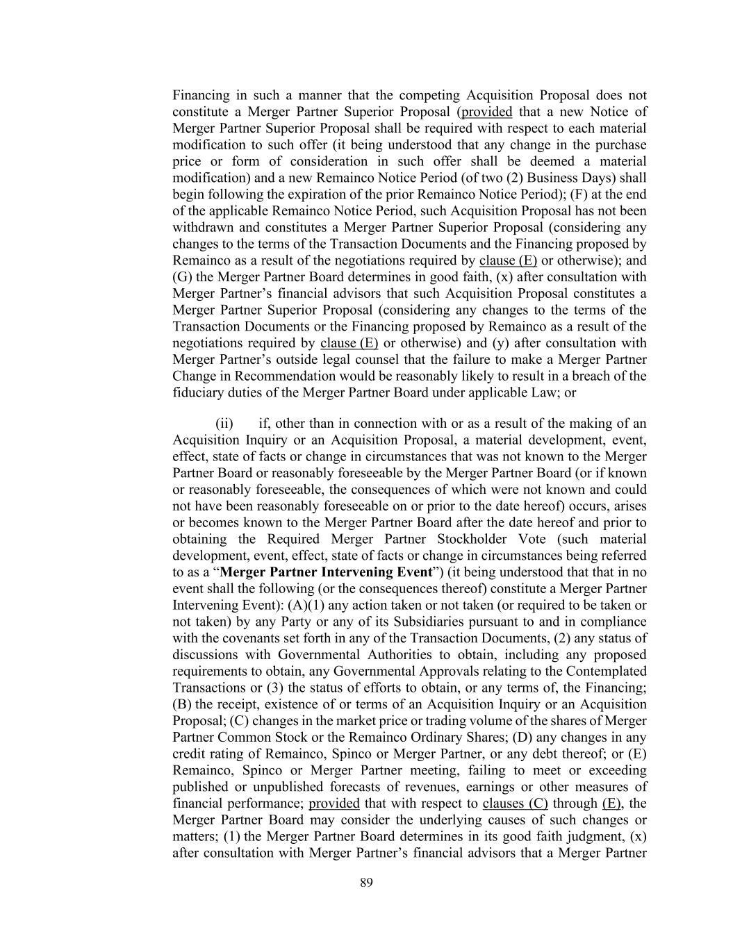 89 Financing in such a manner that the competing Acquisition Proposal does not constitute a Merger Partner Superior Proposal (provided that a new Notice of Merger Partner Superior Proposal shall be required with respect to each material modification to such offer (it being understood that any change in the purchase price or form of consideration in such offer shall be deemed a material modification) and a new Remainco Notice Period (of two (2) Business Days) shall begin following the expiration of the prior Remainco Notice Period); (F) at the end of the applicable Remainco Notice Period, such Acquisition Proposal has not been withdrawn and constitutes a Merger Partner Superior Proposal (considering any changes to the terms of the Transaction Documents and the Financing proposed by Remainco as a result of the negotiations required by clause (E) or otherwise); and (G) the Merger Partner Board determines in good faith, (x) after consultation with Merger Partner’s financial advisors that such Acquisition Proposal constitutes a Merger Partner Superior Proposal (considering any changes to the terms of the Transaction Documents or the Financing proposed by Remainco as a result of the negotiations required by clause (E) or otherwise) and (y) after consultation with Merger Partner’s outside legal counsel that the failure to make a Merger Partner Change in Recommendation would be reasonably likely to result in a breach of the fiduciary duties of the Merger Partner Board under applicable Law; or (ii) if, other than in connection with or as a result of the making of an Acquisition Inquiry or an Acquisition Proposal, a material development, event, effect, state of facts or change in circumstances that was not known to the Merger Partner Board or reasonably foreseeable by the Merger Partner Board (or if known or reasonably foreseeable, the consequences of which were not known and could not have been reasonably foreseeable on or prior to the date hereof) occurs, arises or becomes known to the Merger Partner Board after the date hereof and prior to obtaining the Required Merger Partner Stockholder Vote (such material development, event, effect, state of facts or change in circumstances being referred to as a “Merger Partner Intervening Event”) (it being understood that that in no event shall the following (or the consequences thereof) constitute a Merger Partner Intervening Event): (A)(1) any action taken or not taken (or required to be taken or not taken) by any Party or any of its Subsidiaries pursuant to and in compliance with the covenants set forth in any of the Transaction Documents, (2) any status of discussions with Governmental Authorities to obtain, including any proposed requirements to obtain, any Governmental Approvals relating to the Contemplated Transactions or (3) the status of efforts to obtain, or any terms of, the Financing; (B) the receipt, existence of or terms of an Acquisition Inquiry or an Acquisition Proposal; (C) changes in the market price or trading volume of the shares of Merger Partner Common Stock or the Remainco Ordinary Shares; (D) any changes in any credit rating of Remainco, Spinco or Merger Partner, or any debt thereof; or (E) Remainco, Spinco or Merger Partner meeting, failing to meet or exceeding published or unpublished forecasts of revenues, earnings or other measures of financial performance; provided that with respect to clauses (C) through (E), the Merger Partner Board may consider the underlying causes of such changes or matters; (1) the Merger Partner Board determines in its good faith judgment, (x) after consultation with Merger Partner’s financial advisors that a Merger Partner