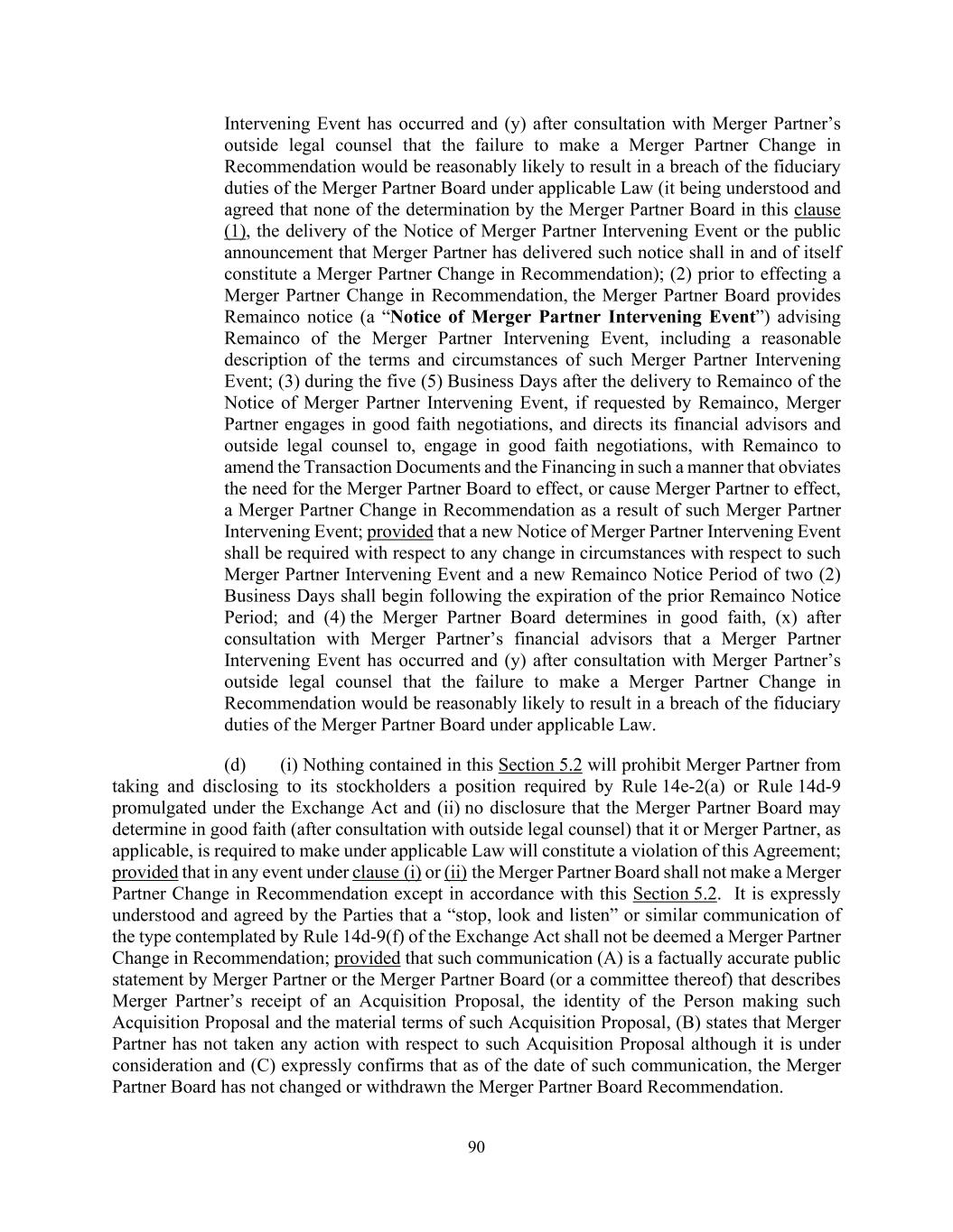 90 Intervening Event has occurred and (y) after consultation with Merger Partner’s outside legal counsel that the failure to make a Merger Partner Change in Recommendation would be reasonably likely to result in a breach of the fiduciary duties of the Merger Partner Board under applicable Law (it being understood and agreed that none of the determination by the Merger Partner Board in this clause (1), the delivery of the Notice of Merger Partner Intervening Event or the public announcement that Merger Partner has delivered such notice shall in and of itself constitute a Merger Partner Change in Recommendation); (2) prior to effecting a Merger Partner Change in Recommendation, the Merger Partner Board provides Remainco notice (a “Notice of Merger Partner Intervening Event”) advising Remainco of the Merger Partner Intervening Event, including a reasonable description of the terms and circumstances of such Merger Partner Intervening Event; (3) during the five (5) Business Days after the delivery to Remainco of the Notice of Merger Partner Intervening Event, if requested by Remainco, Merger Partner engages in good faith negotiations, and directs its financial advisors and outside legal counsel to, engage in good faith negotiations, with Remainco to amend the Transaction Documents and the Financing in such a manner that obviates the need for the Merger Partner Board to effect, or cause Merger Partner to effect, a Merger Partner Change in Recommendation as a result of such Merger Partner Intervening Event; provided that a new Notice of Merger Partner Intervening Event shall be required with respect to any change in circumstances with respect to such Merger Partner Intervening Event and a new Remainco Notice Period of two (2) Business Days shall begin following the expiration of the prior Remainco Notice Period; and (4) the Merger Partner Board determines in good faith, (x) after consultation with Merger Partner’s financial advisors that a Merger Partner Intervening Event has occurred and (y) after consultation with Merger Partner’s outside legal counsel that the failure to make a Merger Partner Change in Recommendation would be reasonably likely to result in a breach of the fiduciary duties of the Merger Partner Board under applicable Law. (d) (i) Nothing contained in this Section 5.2 will prohibit Merger Partner from taking and disclosing to its stockholders a position required by Rule 14e-2(a) or Rule 14d-9 promulgated under the Exchange Act and (ii) no disclosure that the Merger Partner Board may determine in good faith (after consultation with outside legal counsel) that it or Merger Partner, as applicable, is required to make under applicable Law will constitute a violation of this Agreement; provided that in any event under clause (i) or (ii) the Merger Partner Board shall not make a Merger Partner Change in Recommendation except in accordance with this Section 5.2. It is expressly understood and agreed by the Parties that a “stop, look and listen” or similar communication of the type contemplated by Rule 14d-9(f) of the Exchange Act shall not be deemed a Merger Partner Change in Recommendation; provided that such communication (A) is a factually accurate public statement by Merger Partner or the Merger Partner Board (or a committee thereof) that describes Merger Partner’s receipt of an Acquisition Proposal, the identity of the Person making such Acquisition Proposal and the material terms of such Acquisition Proposal, (B) states that Merger Partner has not taken any action with respect to such Acquisition Proposal although it is under consideration and (C) expressly confirms that as of the date of such communication, the Merger Partner Board has not changed or withdrawn the Merger Partner Board Recommendation.