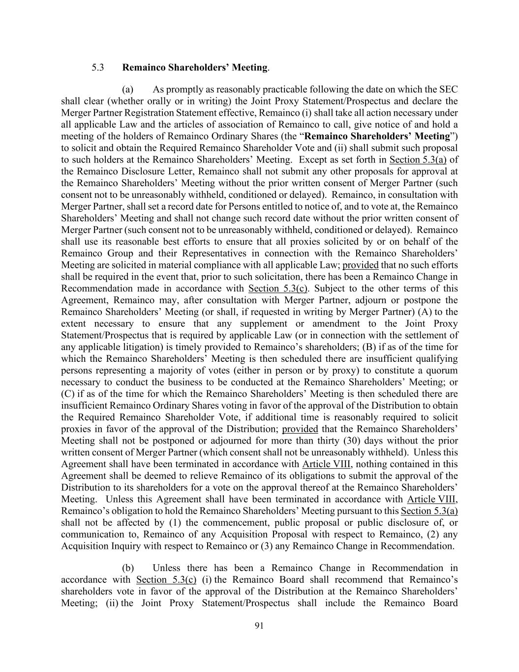 91 5.3 Remainco Shareholders’ Meeting. (a) As promptly as reasonably practicable following the date on which the SEC shall clear (whether orally or in writing) the Joint Proxy Statement/Prospectus and declare the Merger Partner Registration Statement effective, Remainco (i) shall take all action necessary under all applicable Law and the articles of association of Remainco to call, give notice of and hold a meeting of the holders of Remainco Ordinary Shares (the “Remainco Shareholders’ Meeting”) to solicit and obtain the Required Remainco Shareholder Vote and (ii) shall submit such proposal to such holders at the Remainco Shareholders’ Meeting. Except as set forth in Section 5.3(a) of the Remainco Disclosure Letter, Remainco shall not submit any other proposals for approval at the Remainco Shareholders’ Meeting without the prior written consent of Merger Partner (such consent not to be unreasonably withheld, conditioned or delayed). Remainco, in consultation with Merger Partner, shall set a record date for Persons entitled to notice of, and to vote at, the Remainco Shareholders’ Meeting and shall not change such record date without the prior written consent of Merger Partner (such consent not to be unreasonably withheld, conditioned or delayed). Remainco shall use its reasonable best efforts to ensure that all proxies solicited by or on behalf of the Remainco Group and their Representatives in connection with the Remainco Shareholders’ Meeting are solicited in material compliance with all applicable Law; provided that no such efforts shall be required in the event that, prior to such solicitation, there has been a Remainco Change in Recommendation made in accordance with Section 5.3(c). Subject to the other terms of this Agreement, Remainco may, after consultation with Merger Partner, adjourn or postpone the Remainco Shareholders’ Meeting (or shall, if requested in writing by Merger Partner) (A) to the extent necessary to ensure that any supplement or amendment to the Joint Proxy Statement/Prospectus that is required by applicable Law (or in connection with the settlement of any applicable litigation) is timely provided to Remainco’s shareholders; (B) if as of the time for which the Remainco Shareholders’ Meeting is then scheduled there are insufficient qualifying persons representing a majority of votes (either in person or by proxy) to constitute a quorum necessary to conduct the business to be conducted at the Remainco Shareholders’ Meeting; or (C) if as of the time for which the Remainco Shareholders’ Meeting is then scheduled there are insufficient Remainco Ordinary Shares voting in favor of the approval of the Distribution to obtain the Required Remainco Shareholder Vote, if additional time is reasonably required to solicit proxies in favor of the approval of the Distribution; provided that the Remainco Shareholders’ Meeting shall not be postponed or adjourned for more than thirty (30) days without the prior written consent of Merger Partner (which consent shall not be unreasonably withheld). Unless this Agreement shall have been terminated in accordance with Article VIII, nothing contained in this Agreement shall be deemed to relieve Remainco of its obligations to submit the approval of the Distribution to its shareholders for a vote on the approval thereof at the Remainco Shareholders’ Meeting. Unless this Agreement shall have been terminated in accordance with Article VIII, Remainco’s obligation to hold the Remainco Shareholders’ Meeting pursuant to this Section 5.3(a) shall not be affected by (1) the commencement, public proposal or public disclosure of, or communication to, Remainco of any Acquisition Proposal with respect to Remainco, (2) any Acquisition Inquiry with respect to Remainco or (3) any Remainco Change in Recommendation. (b) Unless there has been a Remainco Change in Recommendation in accordance with Section 5.3(c) (i) the Remainco Board shall recommend that Remainco’s shareholders vote in favor of the approval of the Distribution at the Remainco Shareholders’ Meeting; (ii) the Joint Proxy Statement/Prospectus shall include the Remainco Board