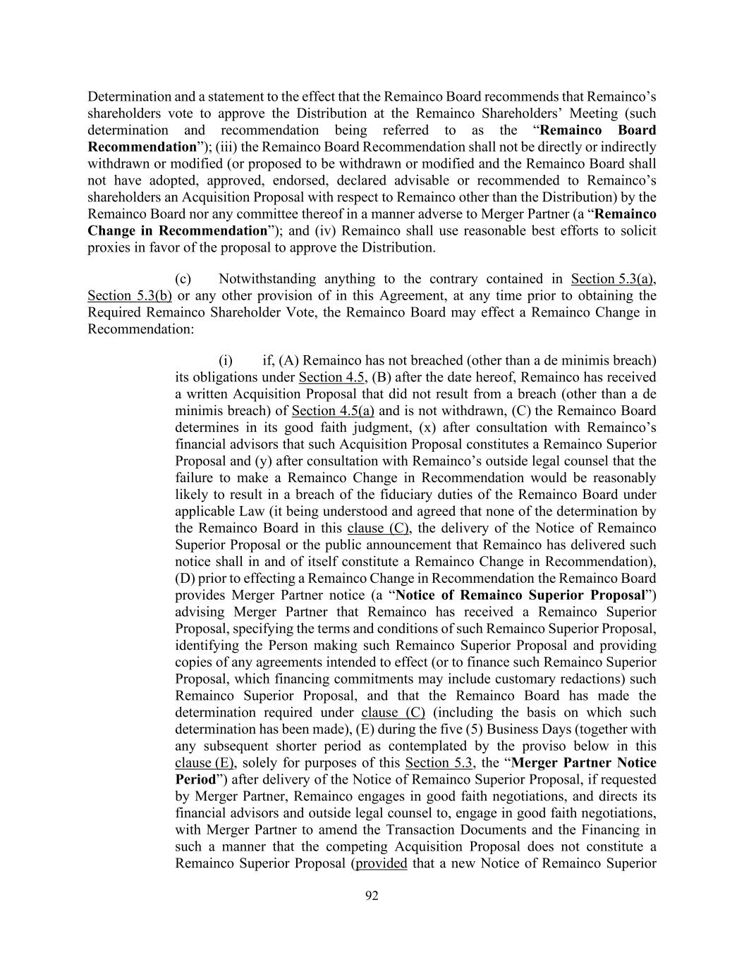 92 Determination and a statement to the effect that the Remainco Board recommends that Remainco’s shareholders vote to approve the Distribution at the Remainco Shareholders’ Meeting (such determination and recommendation being referred to as the “Remainco Board Recommendation”); (iii) the Remainco Board Recommendation shall not be directly or indirectly withdrawn or modified (or proposed to be withdrawn or modified and the Remainco Board shall not have adopted, approved, endorsed, declared advisable or recommended to Remainco’s shareholders an Acquisition Proposal with respect to Remainco other than the Distribution) by the Remainco Board nor any committee thereof in a manner adverse to Merger Partner (a “Remainco Change in Recommendation”); and (iv) Remainco shall use reasonable best efforts to solicit proxies in favor of the proposal to approve the Distribution. (c) Notwithstanding anything to the contrary contained in Section 5.3(a), Section 5.3(b) or any other provision of in this Agreement, at any time prior to obtaining the Required Remainco Shareholder Vote, the Remainco Board may effect a Remainco Change in Recommendation: (i) if, (A) Remainco has not breached (other than a de minimis breach) its obligations under Section 4.5, (B) after the date hereof, Remainco has received a written Acquisition Proposal that did not result from a breach (other than a de minimis breach) of Section 4.5(a) and is not withdrawn, (C) the Remainco Board determines in its good faith judgment, (x) after consultation with Remainco’s financial advisors that such Acquisition Proposal constitutes a Remainco Superior Proposal and (y) after consultation with Remainco’s outside legal counsel that the failure to make a Remainco Change in Recommendation would be reasonably likely to result in a breach of the fiduciary duties of the Remainco Board under applicable Law (it being understood and agreed that none of the determination by the Remainco Board in this clause (C), the delivery of the Notice of Remainco Superior Proposal or the public announcement that Remainco has delivered such notice shall in and of itself constitute a Remainco Change in Recommendation), (D) prior to effecting a Remainco Change in Recommendation the Remainco Board provides Merger Partner notice (a “Notice of Remainco Superior Proposal”) advising Merger Partner that Remainco has received a Remainco Superior Proposal, specifying the terms and conditions of such Remainco Superior Proposal, identifying the Person making such Remainco Superior Proposal and providing copies of any agreements intended to effect (or to finance such Remainco Superior Proposal, which financing commitments may include customary redactions) such Remainco Superior Proposal, and that the Remainco Board has made the determination required under clause (C) (including the basis on which such determination has been made), (E) during the five (5) Business Days (together with any subsequent shorter period as contemplated by the proviso below in this clause (E), solely for purposes of this Section 5.3, the “Merger Partner Notice Period”) after delivery of the Notice of Remainco Superior Proposal, if requested by Merger Partner, Remainco engages in good faith negotiations, and directs its financial advisors and outside legal counsel to, engage in good faith negotiations, with Merger Partner to amend the Transaction Documents and the Financing in such a manner that the competing Acquisition Proposal does not constitute a Remainco Superior Proposal (provided that a new Notice of Remainco Superior