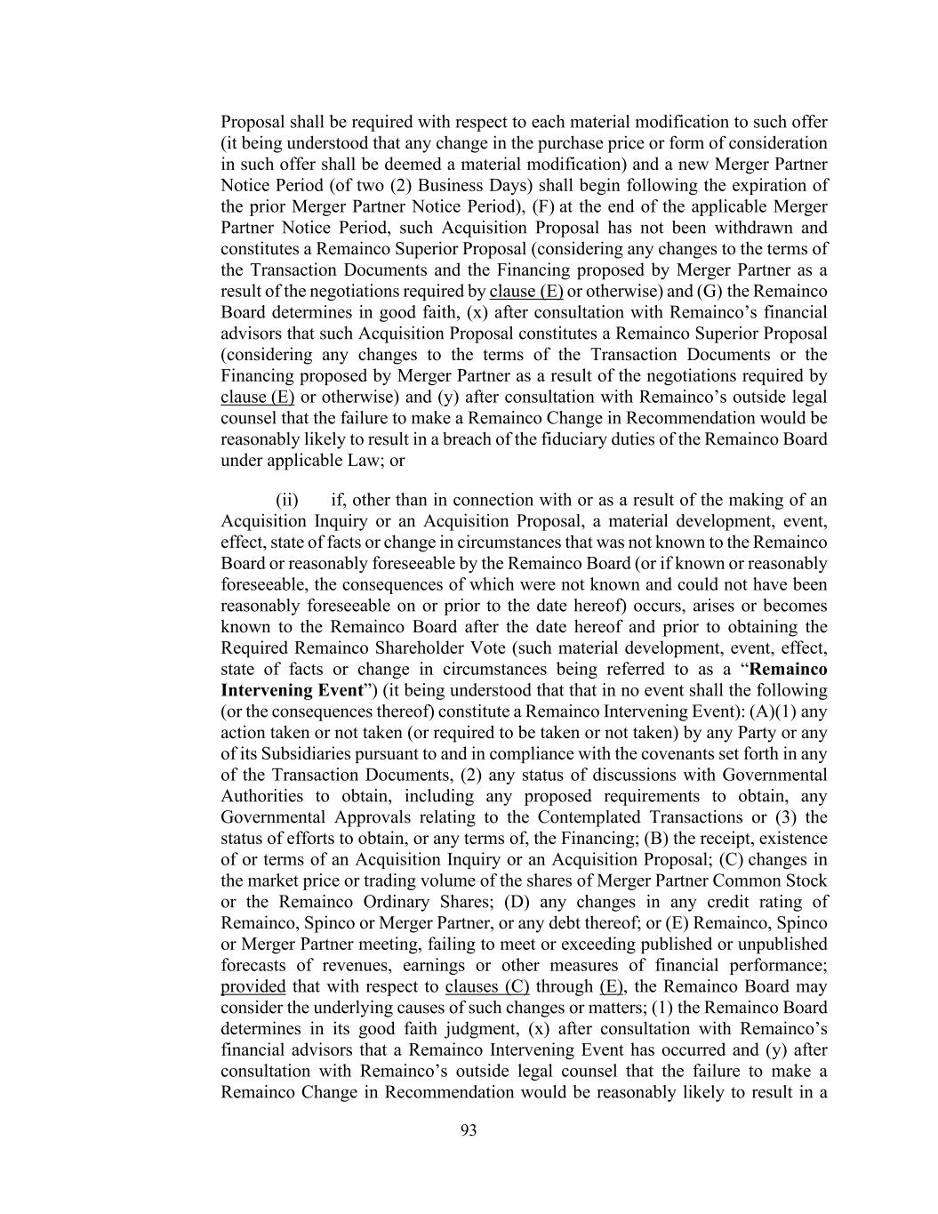 93 Proposal shall be required with respect to each material modification to such offer (it being understood that any change in the purchase price or form of consideration in such offer shall be deemed a material modification) and a new Merger Partner Notice Period (of two (2) Business Days) shall begin following the expiration of the prior Merger Partner Notice Period), (F) at the end of the applicable Merger Partner Notice Period, such Acquisition Proposal has not been withdrawn and constitutes a Remainco Superior Proposal (considering any changes to the terms of the Transaction Documents and the Financing proposed by Merger Partner as a result of the negotiations required by clause (E) or otherwise) and (G) the Remainco Board determines in good faith, (x) after consultation with Remainco’s financial advisors that such Acquisition Proposal constitutes a Remainco Superior Proposal (considering any changes to the terms of the Transaction Documents or the Financing proposed by Merger Partner as a result of the negotiations required by clause (E) or otherwise) and (y) after consultation with Remainco’s outside legal counsel that the failure to make a Remainco Change in Recommendation would be reasonably likely to result in a breach of the fiduciary duties of the Remainco Board under applicable Law; or (ii) if, other than in connection with or as a result of the making of an Acquisition Inquiry or an Acquisition Proposal, a material development, event, effect, state of facts or change in circumstances that was not known to the Remainco Board or reasonably foreseeable by the Remainco Board (or if known or reasonably foreseeable, the consequences of which were not known and could not have been reasonably foreseeable on or prior to the date hereof) occurs, arises or becomes known to the Remainco Board after the date hereof and prior to obtaining the Required Remainco Shareholder Vote (such material development, event, effect, state of facts or change in circumstances being referred to as a “Remainco Intervening Event”) (it being understood that that in no event shall the following (or the consequences thereof) constitute a Remainco Intervening Event): (A)(1) any action taken or not taken (or required to be taken or not taken) by any Party or any of its Subsidiaries pursuant to and in compliance with the covenants set forth in any of the Transaction Documents, (2) any status of discussions with Governmental Authorities to obtain, including any proposed requirements to obtain, any Governmental Approvals relating to the Contemplated Transactions or (3) the status of efforts to obtain, or any terms of, the Financing; (B) the receipt, existence of or terms of an Acquisition Inquiry or an Acquisition Proposal; (C) changes in the market price or trading volume of the shares of Merger Partner Common Stock or the Remainco Ordinary Shares; (D) any changes in any credit rating of Remainco, Spinco or Merger Partner, or any debt thereof; or (E) Remainco, Spinco or Merger Partner meeting, failing to meet or exceeding published or unpublished forecasts of revenues, earnings or other measures of financial performance; provided that with respect to clauses (C) through (E), the Remainco Board may consider the underlying causes of such changes or matters; (1) the Remainco Board determines in its good faith judgment, (x) after consultation with Remainco’s financial advisors that a Remainco Intervening Event has occurred and (y) after consultation with Remainco’s outside legal counsel that the failure to make a Remainco Change in Recommendation would be reasonably likely to result in a