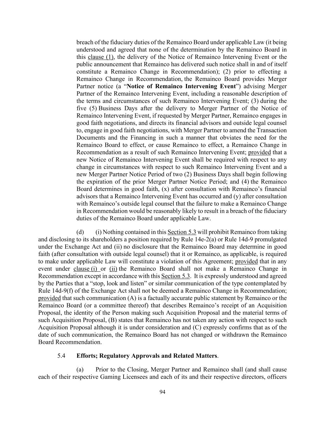 94 breach of the fiduciary duties of the Remainco Board under applicable Law (it being understood and agreed that none of the determination by the Remainco Board in this clause (1), the delivery of the Notice of Remainco Intervening Event or the public announcement that Remainco has delivered such notice shall in and of itself constitute a Remainco Change in Recommendation); (2) prior to effecting a Remainco Change in Recommendation, the Remainco Board provides Merger Partner notice (a “Notice of Remainco Intervening Event”) advising Merger Partner of the Remainco Intervening Event, including a reasonable description of the terms and circumstances of such Remainco Intervening Event; (3) during the five (5) Business Days after the delivery to Merger Partner of the Notice of Remainco Intervening Event, if requested by Merger Partner, Remainco engages in good faith negotiations, and directs its financial advisors and outside legal counsel to, engage in good faith negotiations, with Merger Partner to amend the Transaction Documents and the Financing in such a manner that obviates the need for the Remainco Board to effect, or cause Remainco to effect, a Remainco Change in Recommendation as a result of such Remainco Intervening Event; provided that a new Notice of Remainco Intervening Event shall be required with respect to any change in circumstances with respect to such Remainco Intervening Event and a new Merger Partner Notice Period of two (2) Business Days shall begin following the expiration of the prior Merger Partner Notice Period; and (4) the Remainco Board determines in good faith, (x) after consultation with Remainco’s financial advisors that a Remainco Intervening Event has occurred and (y) after consultation with Remainco’s outside legal counsel that the failure to make a Remainco Change in Recommendation would be reasonably likely to result in a breach of the fiduciary duties of the Remainco Board under applicable Law. (d) (i) Nothing contained in this Section 5.3 will prohibit Remainco from taking and disclosing to its shareholders a position required by Rule 14e-2(a) or Rule 14d-9 promulgated under the Exchange Act and (ii) no disclosure that the Remainco Board may determine in good faith (after consultation with outside legal counsel) that it or Remainco, as applicable, is required to make under applicable Law will constitute a violation of this Agreement; provided that in any event under clause (i) or (ii) the Remainco Board shall not make a Remainco Change in Recommendation except in accordance with this Section 5.3. It is expressly understood and agreed by the Parties that a “stop, look and listen” or similar communication of the type contemplated by Rule 14d-9(f) of the Exchange Act shall not be deemed a Remainco Change in Recommendation; provided that such communication (A) is a factually accurate public statement by Remainco or the Remainco Board (or a committee thereof) that describes Remainco’s receipt of an Acquisition Proposal, the identity of the Person making such Acquisition Proposal and the material terms of such Acquisition Proposal, (B) states that Remainco has not taken any action with respect to such Acquisition Proposal although it is under consideration and (C) expressly confirms that as of the date of such communication, the Remainco Board has not changed or withdrawn the Remainco Board Recommendation. 5.4 Efforts; Regulatory Approvals and Related Matters. (a) Prior to the Closing, Merger Partner and Remainco shall (and shall cause each of their respective Gaming Licensees and each of its and their respective directors, officers