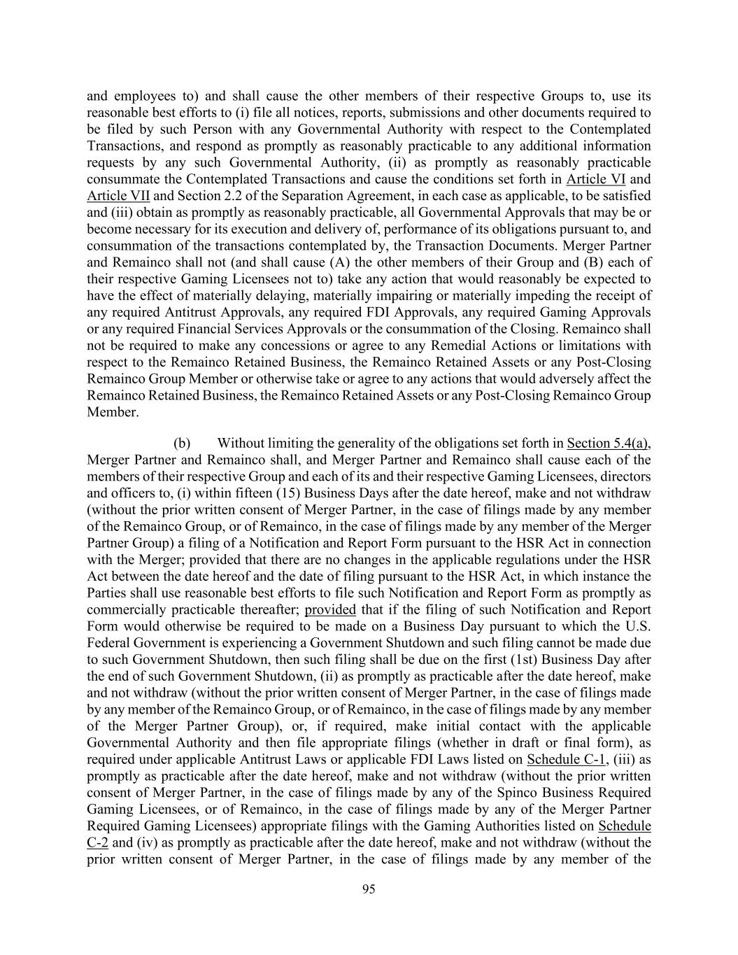 95 and employees to) and shall cause the other members of their respective Groups to, use its reasonable best efforts to (i) file all notices, reports, submissions and other documents required to be filed by such Person with any Governmental Authority with respect to the Contemplated Transactions, and respond as promptly as reasonably practicable to any additional information requests by any such Governmental Authority, (ii) as promptly as reasonably practicable consummate the Contemplated Transactions and cause the conditions set forth in Article VI and Article VII and Section 2.2 of the Separation Agreement, in each case as applicable, to be satisfied and (iii) obtain as promptly as reasonably practicable, all Governmental Approvals that may be or become necessary for its execution and delivery of, performance of its obligations pursuant to, and consummation of the transactions contemplated by, the Transaction Documents. Merger Partner and Remainco shall not (and shall cause (A) the other members of their Group and (B) each of their respective Gaming Licensees not to) take any action that would reasonably be expected to have the effect of materially delaying, materially impairing or materially impeding the receipt of any required Antitrust Approvals, any required FDI Approvals, any required Gaming Approvals or any required Financial Services Approvals or the consummation of the Closing. Remainco shall not be required to make any concessions or agree to any Remedial Actions or limitations with respect to the Remainco Retained Business, the Remainco Retained Assets or any Post-Closing Remainco Group Member or otherwise take or agree to any actions that would adversely affect the Remainco Retained Business, the Remainco Retained Assets or any Post-Closing Remainco Group Member. (b) Without limiting the generality of the obligations set forth in Section 5.4(a), Merger Partner and Remainco shall, and Merger Partner and Remainco shall cause each of the members of their respective Group and each of its and their respective Gaming Licensees, directors and officers to, (i) within fifteen (15) Business Days after the date hereof, make and not withdraw (without the prior written consent of Merger Partner, in the case of filings made by any member of the Remainco Group, or of Remainco, in the case of filings made by any member of the Merger Partner Group) a filing of a Notification and Report Form pursuant to the HSR Act in connection with the Merger; provided that there are no changes in the applicable regulations under the HSR Act between the date hereof and the date of filing pursuant to the HSR Act, in which instance the Parties shall use reasonable best efforts to file such Notification and Report Form as promptly as commercially practicable thereafter; provided that if the filing of such Notification and Report Form would otherwise be required to be made on a Business Day pursuant to which the U.S. Federal Government is experiencing a Government Shutdown and such filing cannot be made due to such Government Shutdown, then such filing shall be due on the first (1st) Business Day after the end of such Government Shutdown, (ii) as promptly as practicable after the date hereof, make and not withdraw (without the prior written consent of Merger Partner, in the case of filings made by any member of the Remainco Group, or of Remainco, in the case of filings made by any member of the Merger Partner Group), or, if required, make initial contact with the applicable Governmental Authority and then file appropriate filings (whether in draft or final form), as required under applicable Antitrust Laws or applicable FDI Laws listed on Schedule C-1, (iii) as promptly as practicable after the date hereof, make and not withdraw (without the prior written consent of Merger Partner, in the case of filings made by any of the Spinco Business Required Gaming Licensees, or of Remainco, in the case of filings made by any of the Merger Partner Required Gaming Licensees) appropriate filings with the Gaming Authorities listed on Schedule C-2 and (iv) as promptly as practicable after the date hereof, make and not withdraw (without the prior written consent of Merger Partner, in the case of filings made by any member of the