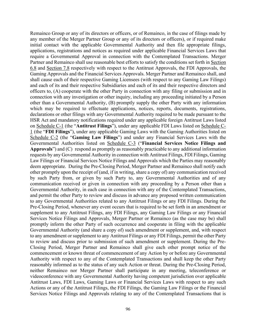 96 Remainco Group or any of its directors or officers, or of Remainco, in the case of filings made by any member of the Merger Partner Group or any of its directors or officers), or if required make initial contact with the applicable Governmental Authority and then file appropriate filings, applications, registrations and notices as required under applicable Financial Services Laws that require a Governmental Approval in connection with the Contemplated Transactions. Merger Partner and Remainco shall use reasonable best efforts to satisfy the conditions set forth in Section 6.8 and Section 7.8 respectively with respect to the Antitrust Approvals, the FDI Approvals, the Gaming Approvals and the Financial Services Approvals. Merger Partner and Remainco shall, and shall cause each of their respective Gaming Licensees (with respect to any Gaming Law Filings) and each of its and their respective Subsidiaries and each of its and their respective directors and officers to, (A) cooperate with the other Party in connection with any filing or submission and in connection with any investigation or other inquiry, including any proceeding initiated by a Person other than a Governmental Authority, (B) promptly supply the other Party with any information which may be required to effectuate applications, notices, reports, documents, registrations, declarations or other filings with any Governmental Authority required to be made pursuant to the HSR Act and mandatory notifications required under any applicable foreign Antitrust Laws listed on Schedule C-1 (the “Antitrust Filings”), under any applicable FDI Laws listed on Schedule C- 1 (the “FDI Filings”), under any applicable Gaming Laws with the Gaming Authorities listed on Schedule C-2 (the “Gaming Law Filings”) and under any Financial Services Laws with the Governmental Authorities listed on Schedule C-3 (“Financial Services Notice Filings and Approvals”) and (C) respond as promptly as reasonably practicable to any additional information requests by any Governmental Authority in connection with Antitrust Filings, FDI Filings, Gaming Law Filings or Financial Services Notice Filings and Approvals which the Parties may reasonably deem appropriate. During the Pre-Closing Period, Merger Partner and Remainco shall notify each other promptly upon the receipt of (and, if in writing, share a copy of) any communication received by such Party from, or given by such Party to, any Governmental Authorities and of any communication received or given in connection with any proceeding by a Person other than a Governmental Authority, in each case in connection with any of the Contemplated Transactions, and permit the other Party to review and discuss in advance any proposed written communication to any Governmental Authorities related to any Antitrust Filings or any FDI Filings. During the Pre-Closing Period, whenever any event occurs that is required to be set forth in an amendment or supplement to any Antitrust Filings, any FDI Filings, any Gaming Law Filings or any Financial Services Notice Filings and Approvals, Merger Partner or Remainco (as the case may be) shall promptly inform the other Party of such occurrence and cooperate in filing with the applicable Governmental Authority (and share a copy of) such amendment or supplement, and, with respect to any amendment or supplement to any Antitrust Filings or any FDI Filings, permit the other Party to review and discuss prior to submission of such amendment or supplement. During the Pre- Closing Period, Merger Partner and Remainco shall give each other prompt notice of the commencement or known threat of commencement of any Action by or before any Governmental Authority with respect to any of the Contemplated Transactions and shall keep the other Party reasonably informed as to the status of any such Action or threat. During the Pre-Closing Period, neither Remainco nor Merger Partner shall participate in any meeting, teleconference or videoconference with any Governmental Authority having competent jurisdiction over applicable Antitrust Laws, FDI Laws, Gaming Laws or Financial Services Laws with respect to any such Actions or any of the Antitrust Filings, the FDI Filings, the Gaming Law Filings or the Financial Services Notice Filings and Approvals relating to any of the Contemplated Transactions that is