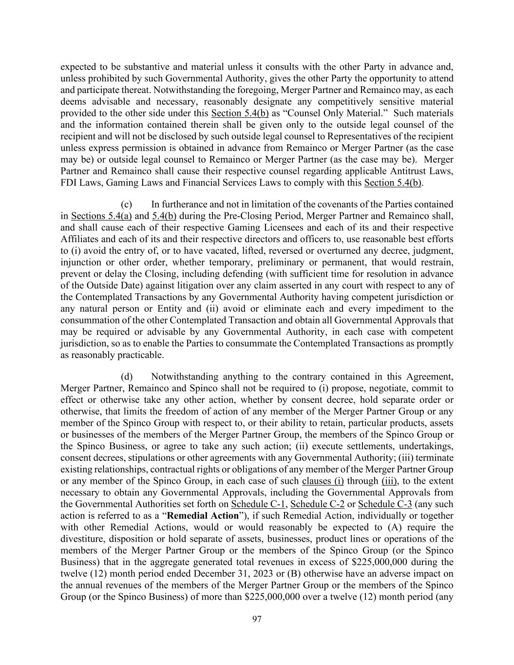 97 expected to be substantive and material unless it consults with the other Party in advance and, unless prohibited by such Governmental Authority, gives the other Party the opportunity to attend and participate thereat. Notwithstanding the foregoing, Merger Partner and Remainco may, as each deems advisable and necessary, reasonably designate any competitively sensitive material provided to the other side under this Section 5.4(b) as “Counsel Only Material.” Such materials and the information contained therein shall be given only to the outside legal counsel of the recipient and will not be disclosed by such outside legal counsel to Representatives of the recipient unless express permission is obtained in advance from Remainco or Merger Partner (as the case may be) or outside legal counsel to Remainco or Merger Partner (as the case may be). Merger Partner and Remainco shall cause their respective counsel regarding applicable Antitrust Laws, FDI Laws, Gaming Laws and Financial Services Laws to comply with this Section 5.4(b). (c) In furtherance and not in limitation of the covenants of the Parties contained in Sections 5.4(a) and 5.4(b) during the Pre-Closing Period, Merger Partner and Remainco shall, and shall cause each of their respective Gaming Licensees and each of its and their respective Affiliates and each of its and their respective directors and officers to, use reasonable best efforts to (i) avoid the entry of, or to have vacated, lifted, reversed or overturned any decree, judgment, injunction or other order, whether temporary, preliminary or permanent, that would restrain, prevent or delay the Closing, including defending (with sufficient time for resolution in advance of the Outside Date) against litigation over any claim asserted in any court with respect to any of the Contemplated Transactions by any Governmental Authority having competent jurisdiction or any natural person or Entity and (ii) avoid or eliminate each and every impediment to the consummation of the other Contemplated Transaction and obtain all Governmental Approvals that may be required or advisable by any Governmental Authority, in each case with competent jurisdiction, so as to enable the Parties to consummate the Contemplated Transactions as promptly as reasonably practicable. (d) Notwithstanding anything to the contrary contained in this Agreement, Merger Partner, Remainco and Spinco shall not be required to (i) propose, negotiate, commit to effect or otherwise take any other action, whether by consent decree, hold separate order or otherwise, that limits the freedom of action of any member of the Merger Partner Group or any member of the Spinco Group with respect to, or their ability to retain, particular products, assets or businesses of the members of the Merger Partner Group, the members of the Spinco Group or the Spinco Business, or agree to take any such action; (ii) execute settlements, undertakings, consent decrees, stipulations or other agreements with any Governmental Authority; (iii) terminate existing relationships, contractual rights or obligations of any member of the Merger Partner Group or any member of the Spinco Group, in each case of such clauses (i) through (iii), to the extent necessary to obtain any Governmental Approvals, including the Governmental Approvals from the Governmental Authorities set forth on Schedule C-1, Schedule C-2 or Schedule C-3 (any such action is referred to as a “Remedial Action”), if such Remedial Action, individually or together with other Remedial Actions, would or would reasonably be expected to (A) require the divestiture, disposition or hold separate of assets, businesses, product lines or operations of the members of the Merger Partner Group or the members of the Spinco Group (or the Spinco Business) that in the aggregate generated total revenues in excess of $225,000,000 during the twelve (12) month period ended December 31, 2023 or (B) otherwise have an adverse impact on the annual revenues of the members of the Merger Partner Group or the members of the Spinco Group (or the Spinco Business) of more than $225,000,000 over a twelve (12) month period (any