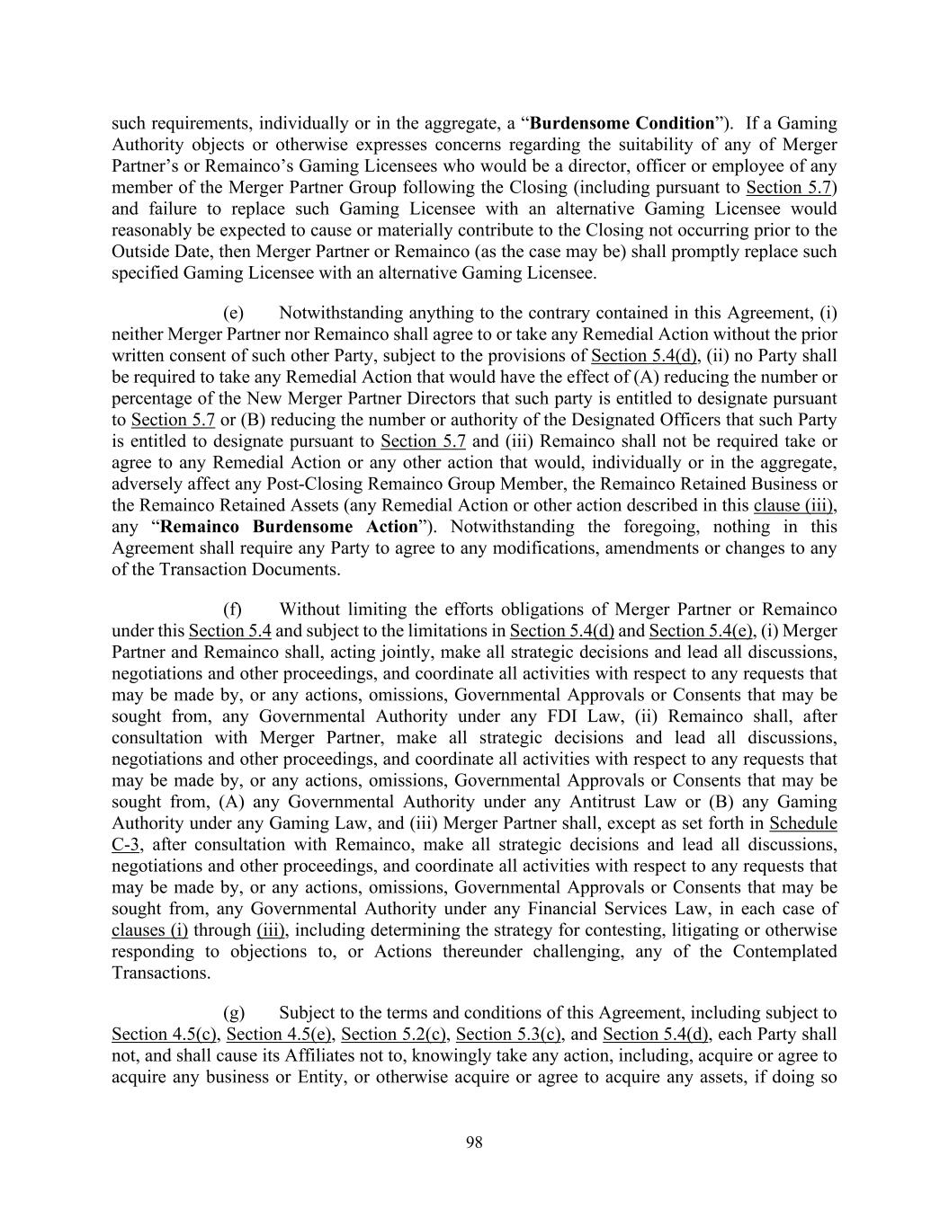 98 such requirements, individually or in the aggregate, a “Burdensome Condition”). If a Gaming Authority objects or otherwise expresses concerns regarding the suitability of any of Merger Partner’s or Remainco’s Gaming Licensees who would be a director, officer or employee of any member of the Merger Partner Group following the Closing (including pursuant to Section 5.7) and failure to replace such Gaming Licensee with an alternative Gaming Licensee would reasonably be expected to cause or materially contribute to the Closing not occurring prior to the Outside Date, then Merger Partner or Remainco (as the case may be) shall promptly replace such specified Gaming Licensee with an alternative Gaming Licensee. (e) Notwithstanding anything to the contrary contained in this Agreement, (i) neither Merger Partner nor Remainco shall agree to or take any Remedial Action without the prior written consent of such other Party, subject to the provisions of Section 5.4(d), (ii) no Party shall be required to take any Remedial Action that would have the effect of (A) reducing the number or percentage of the New Merger Partner Directors that such party is entitled to designate pursuant to Section 5.7 or (B) reducing the number or authority of the Designated Officers that such Party is entitled to designate pursuant to Section 5.7 and (iii) Remainco shall not be required take or agree to any Remedial Action or any other action that would, individually or in the aggregate, adversely affect any Post-Closing Remainco Group Member, the Remainco Retained Business or the Remainco Retained Assets (any Remedial Action or other action described in this clause (iii), any “Remainco Burdensome Action”). Notwithstanding the foregoing, nothing in this Agreement shall require any Party to agree to any modifications, amendments or changes to any of the Transaction Documents. (f) Without limiting the efforts obligations of Merger Partner or Remainco under this Section 5.4 and subject to the limitations in Section 5.4(d) and Section 5.4(e), (i) Merger Partner and Remainco shall, acting jointly, make all strategic decisions and lead all discussions, negotiations and other proceedings, and coordinate all activities with respect to any requests that may be made by, or any actions, omissions, Governmental Approvals or Consents that may be sought from, any Governmental Authority under any FDI Law, (ii) Remainco shall, after consultation with Merger Partner, make all strategic decisions and lead all discussions, negotiations and other proceedings, and coordinate all activities with respect to any requests that may be made by, or any actions, omissions, Governmental Approvals or Consents that may be sought from, (A) any Governmental Authority under any Antitrust Law or (B) any Gaming Authority under any Gaming Law, and (iii) Merger Partner shall, except as set forth in Schedule C-3, after consultation with Remainco, make all strategic decisions and lead all discussions, negotiations and other proceedings, and coordinate all activities with respect to any requests that may be made by, or any actions, omissions, Governmental Approvals or Consents that may be sought from, any Governmental Authority under any Financial Services Law, in each case of clauses (i) through (iii), including determining the strategy for contesting, litigating or otherwise responding to objections to, or Actions thereunder challenging, any of the Contemplated Transactions. (g) Subject to the terms and conditions of this Agreement, including subject to Section 4.5(c), Section 4.5(e), Section 5.2(c), Section 5.3(c), and Section 5.4(d), each Party shall not, and shall cause its Affiliates not to, knowingly take any action, including, acquire or agree to acquire any business or Entity, or otherwise acquire or agree to acquire any assets, if doing so