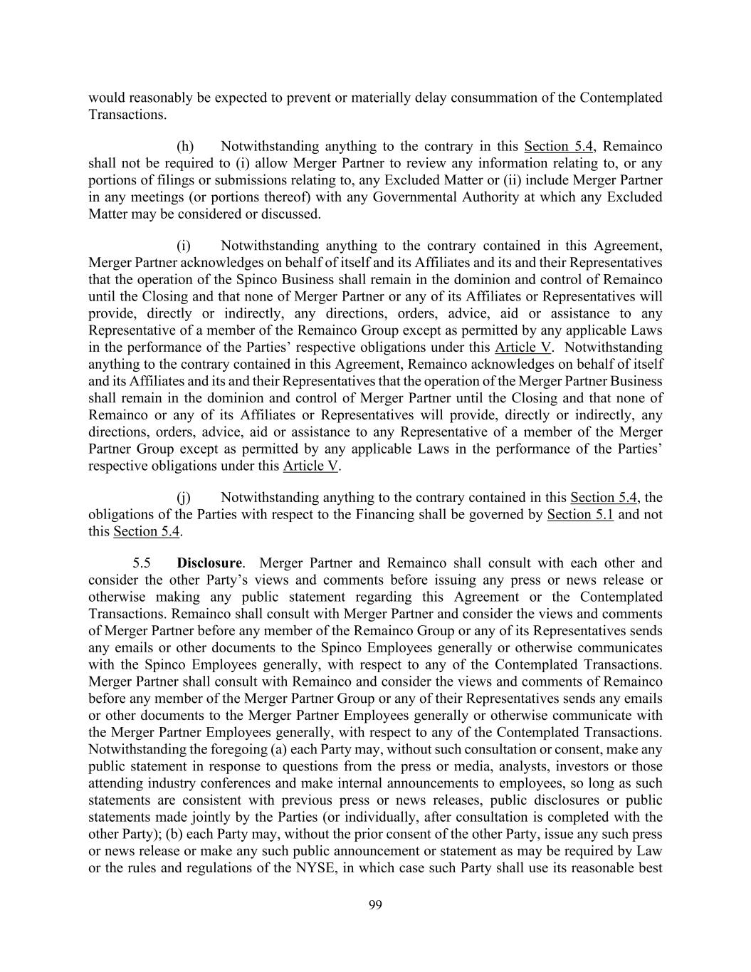 99 would reasonably be expected to prevent or materially delay consummation of the Contemplated Transactions. (h) Notwithstanding anything to the contrary in this Section 5.4, Remainco shall not be required to (i) allow Merger Partner to review any information relating to, or any portions of filings or submissions relating to, any Excluded Matter or (ii) include Merger Partner in any meetings (or portions thereof) with any Governmental Authority at which any Excluded Matter may be considered or discussed. (i) Notwithstanding anything to the contrary contained in this Agreement, Merger Partner acknowledges on behalf of itself and its Affiliates and its and their Representatives that the operation of the Spinco Business shall remain in the dominion and control of Remainco until the Closing and that none of Merger Partner or any of its Affiliates or Representatives will provide, directly or indirectly, any directions, orders, advice, aid or assistance to any Representative of a member of the Remainco Group except as permitted by any applicable Laws in the performance of the Parties’ respective obligations under this Article V. Notwithstanding anything to the contrary contained in this Agreement, Remainco acknowledges on behalf of itself and its Affiliates and its and their Representatives that the operation of the Merger Partner Business shall remain in the dominion and control of Merger Partner until the Closing and that none of Remainco or any of its Affiliates or Representatives will provide, directly or indirectly, any directions, orders, advice, aid or assistance to any Representative of a member of the Merger Partner Group except as permitted by any applicable Laws in the performance of the Parties’ respective obligations under this Article V. (j) Notwithstanding anything to the contrary contained in this Section 5.4, the obligations of the Parties with respect to the Financing shall be governed by Section 5.1 and not this Section 5.4. 5.5 Disclosure. Merger Partner and Remainco shall consult with each other and consider the other Party’s views and comments before issuing any press or news release or otherwise making any public statement regarding this Agreement or the Contemplated Transactions. Remainco shall consult with Merger Partner and consider the views and comments of Merger Partner before any member of the Remainco Group or any of its Representatives sends any emails or other documents to the Spinco Employees generally or otherwise communicates with the Spinco Employees generally, with respect to any of the Contemplated Transactions. Merger Partner shall consult with Remainco and consider the views and comments of Remainco before any member of the Merger Partner Group or any of their Representatives sends any emails or other documents to the Merger Partner Employees generally or otherwise communicate with the Merger Partner Employees generally, with respect to any of the Contemplated Transactions. Notwithstanding the foregoing (a) each Party may, without such consultation or consent, make any public statement in response to questions from the press or media, analysts, investors or those attending industry conferences and make internal announcements to employees, so long as such statements are consistent with previous press or news releases, public disclosures or public statements made jointly by the Parties (or individually, after consultation is completed with the other Party); (b) each Party may, without the prior consent of the other Party, issue any such press or news release or make any such public announcement or statement as may be required by Law or the rules and regulations of the NYSE, in which case such Party shall use its reasonable best