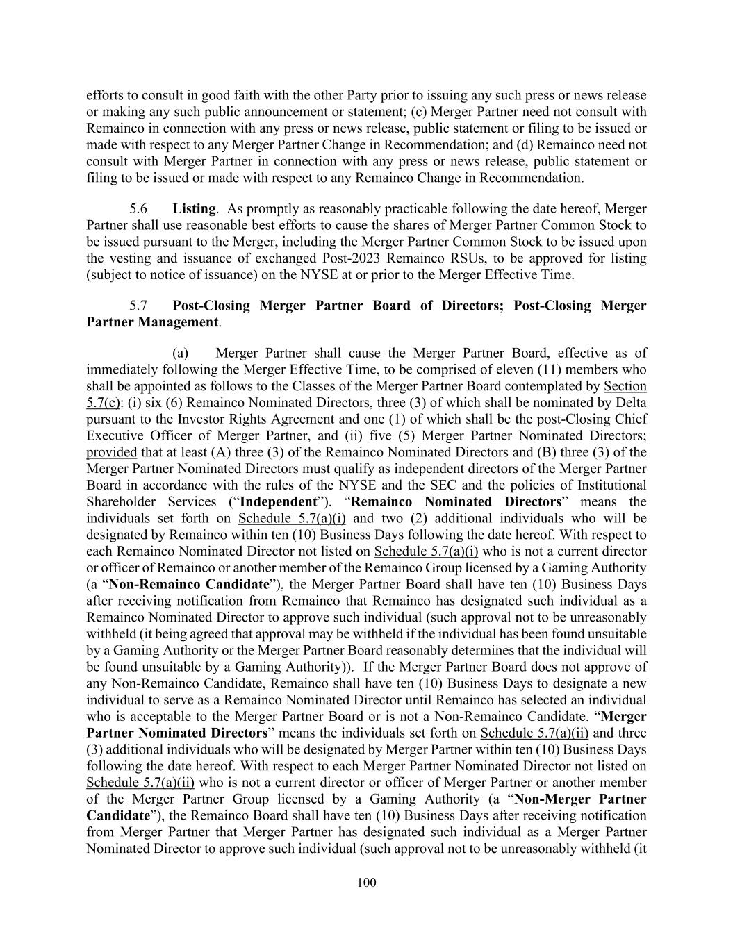 100 efforts to consult in good faith with the other Party prior to issuing any such press or news release or making any such public announcement or statement; (c) Merger Partner need not consult with Remainco in connection with any press or news release, public statement or filing to be issued or made with respect to any Merger Partner Change in Recommendation; and (d) Remainco need not consult with Merger Partner in connection with any press or news release, public statement or filing to be issued or made with respect to any Remainco Change in Recommendation. 5.6 Listing. As promptly as reasonably practicable following the date hereof, Merger Partner shall use reasonable best efforts to cause the shares of Merger Partner Common Stock to be issued pursuant to the Merger, including the Merger Partner Common Stock to be issued upon the vesting and issuance of exchanged Post-2023 Remainco RSUs, to be approved for listing (subject to notice of issuance) on the NYSE at or prior to the Merger Effective Time. 5.7 Post-Closing Merger Partner Board of Directors; Post-Closing Merger Partner Management. (a) Merger Partner shall cause the Merger Partner Board, effective as of immediately following the Merger Effective Time, to be comprised of eleven (11) members who shall be appointed as follows to the Classes of the Merger Partner Board contemplated by Section 5.7(c): (i) six (6) Remainco Nominated Directors, three (3) of which shall be nominated by Delta pursuant to the Investor Rights Agreement and one (1) of which shall be the post-Closing Chief Executive Officer of Merger Partner, and (ii) five (5) Merger Partner Nominated Directors; provided that at least (A) three (3) of the Remainco Nominated Directors and (B) three (3) of the Merger Partner Nominated Directors must qualify as independent directors of the Merger Partner Board in accordance with the rules of the NYSE and the SEC and the policies of Institutional Shareholder Services (“Independent”). “Remainco Nominated Directors” means the individuals set forth on Schedule 5.7(a)(i) and two (2) additional individuals who will be designated by Remainco within ten (10) Business Days following the date hereof. With respect to each Remainco Nominated Director not listed on Schedule 5.7(a)(i) who is not a current director or officer of Remainco or another member of the Remainco Group licensed by a Gaming Authority (a “Non-Remainco Candidate”), the Merger Partner Board shall have ten (10) Business Days after receiving notification from Remainco that Remainco has designated such individual as a Remainco Nominated Director to approve such individual (such approval not to be unreasonably withheld (it being agreed that approval may be withheld if the individual has been found unsuitable by a Gaming Authority or the Merger Partner Board reasonably determines that the individual will be found unsuitable by a Gaming Authority)). If the Merger Partner Board does not approve of any Non-Remainco Candidate, Remainco shall have ten (10) Business Days to designate a new individual to serve as a Remainco Nominated Director until Remainco has selected an individual who is acceptable to the Merger Partner Board or is not a Non-Remainco Candidate. “Merger Partner Nominated Directors” means the individuals set forth on Schedule 5.7(a)(ii) and three (3) additional individuals who will be designated by Merger Partner within ten (10) Business Days following the date hereof. With respect to each Merger Partner Nominated Director not listed on Schedule 5.7(a)(ii) who is not a current director or officer of Merger Partner or another member of the Merger Partner Group licensed by a Gaming Authority (a “Non-Merger Partner Candidate”), the Remainco Board shall have ten (10) Business Days after receiving notification from Merger Partner that Merger Partner has designated such individual as a Merger Partner Nominated Director to approve such individual (such approval not to be unreasonably withheld (it