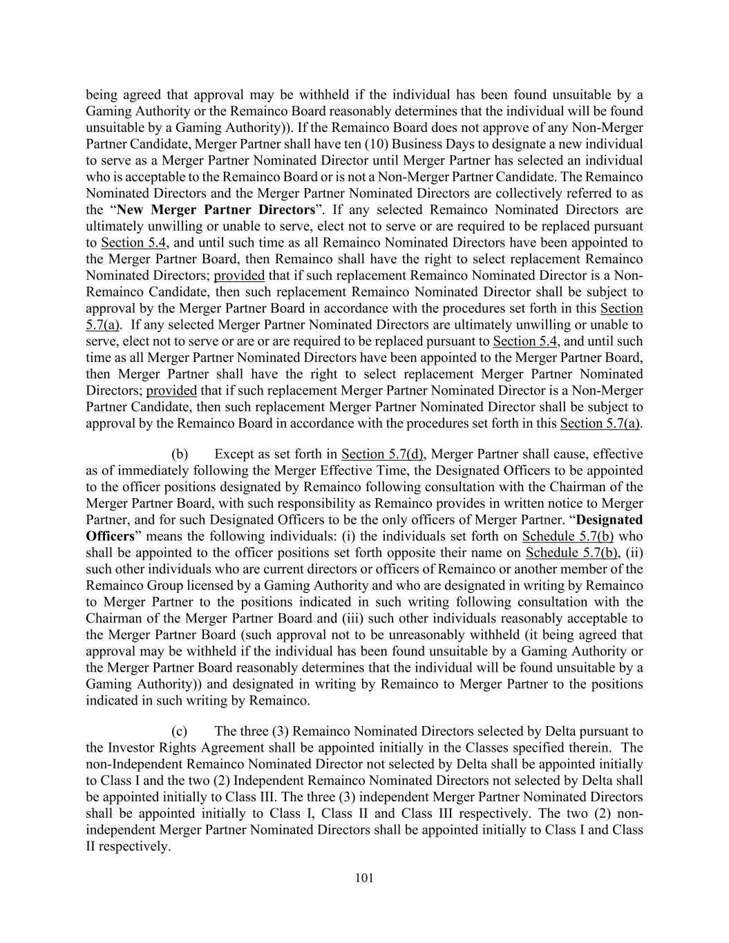 101 being agreed that approval may be withheld if the individual has been found unsuitable by a Gaming Authority or the Remainco Board reasonably determines that the individual will be found unsuitable by a Gaming Authority)). If the Remainco Board does not approve of any Non-Merger Partner Candidate, Merger Partner shall have ten (10) Business Days to designate a new individual to serve as a Merger Partner Nominated Director until Merger Partner has selected an individual who is acceptable to the Remainco Board or is not a Non-Merger Partner Candidate. The Remainco Nominated Directors and the Merger Partner Nominated Directors are collectively referred to as the “New Merger Partner Directors”. If any selected Remainco Nominated Directors are ultimately unwilling or unable to serve, elect not to serve or are required to be replaced pursuant to Section 5.4, and until such time as all Remainco Nominated Directors have been appointed to the Merger Partner Board, then Remainco shall have the right to select replacement Remainco Nominated Directors; provided that if such replacement Remainco Nominated Director is a Non- Remainco Candidate, then such replacement Remainco Nominated Director shall be subject to approval by the Merger Partner Board in accordance with the procedures set forth in this Section 5.7(a). If any selected Merger Partner Nominated Directors are ultimately unwilling or unable to serve, elect not to serve or are or are required to be replaced pursuant to Section 5.4, and until such time as all Merger Partner Nominated Directors have been appointed to the Merger Partner Board, then Merger Partner shall have the right to select replacement Merger Partner Nominated Directors; provided that if such replacement Merger Partner Nominated Director is a Non-Merger Partner Candidate, then such replacement Merger Partner Nominated Director shall be subject to approval by the Remainco Board in accordance with the procedures set forth in this Section 5.7(a). (b) Except as set forth in Section 5.7(d), Merger Partner shall cause, effective as of immediately following the Merger Effective Time, the Designated Officers to be appointed to the officer positions designated by Remainco following consultation with the Chairman of the Merger Partner Board, with such responsibility as Remainco provides in written notice to Merger Partner, and for such Designated Officers to be the only officers of Merger Partner. “Designated Officers” means the following individuals: (i) the individuals set forth on Schedule 5.7(b) who shall be appointed to the officer positions set forth opposite their name on Schedule 5.7(b), (ii) such other individuals who are current directors or officers of Remainco or another member of the Remainco Group licensed by a Gaming Authority and who are designated in writing by Remainco to Merger Partner to the positions indicated in such writing following consultation with the Chairman of the Merger Partner Board and (iii) such other individuals reasonably acceptable to the Merger Partner Board (such approval not to be unreasonably withheld (it being agreed that approval may be withheld if the individual has been found unsuitable by a Gaming Authority or the Merger Partner Board reasonably determines that the individual will be found unsuitable by a Gaming Authority)) and designated in writing by Remainco to Merger Partner to the positions indicated in such writing by Remainco. (c) The three (3) Remainco Nominated Directors selected by Delta pursuant to the Investor Rights Agreement shall be appointed initially in the Classes specified therein. The non-Independent Remainco Nominated Director not selected by Delta shall be appointed initially to Class I and the two (2) Independent Remainco Nominated Directors not selected by Delta shall be appointed initially to Class III. The three (3) independent Merger Partner Nominated Directors shall be appointed initially to Class I, Class II and Class III respectively. The two (2) non- independent Merger Partner Nominated Directors shall be appointed initially to Class I and Class II respectively.