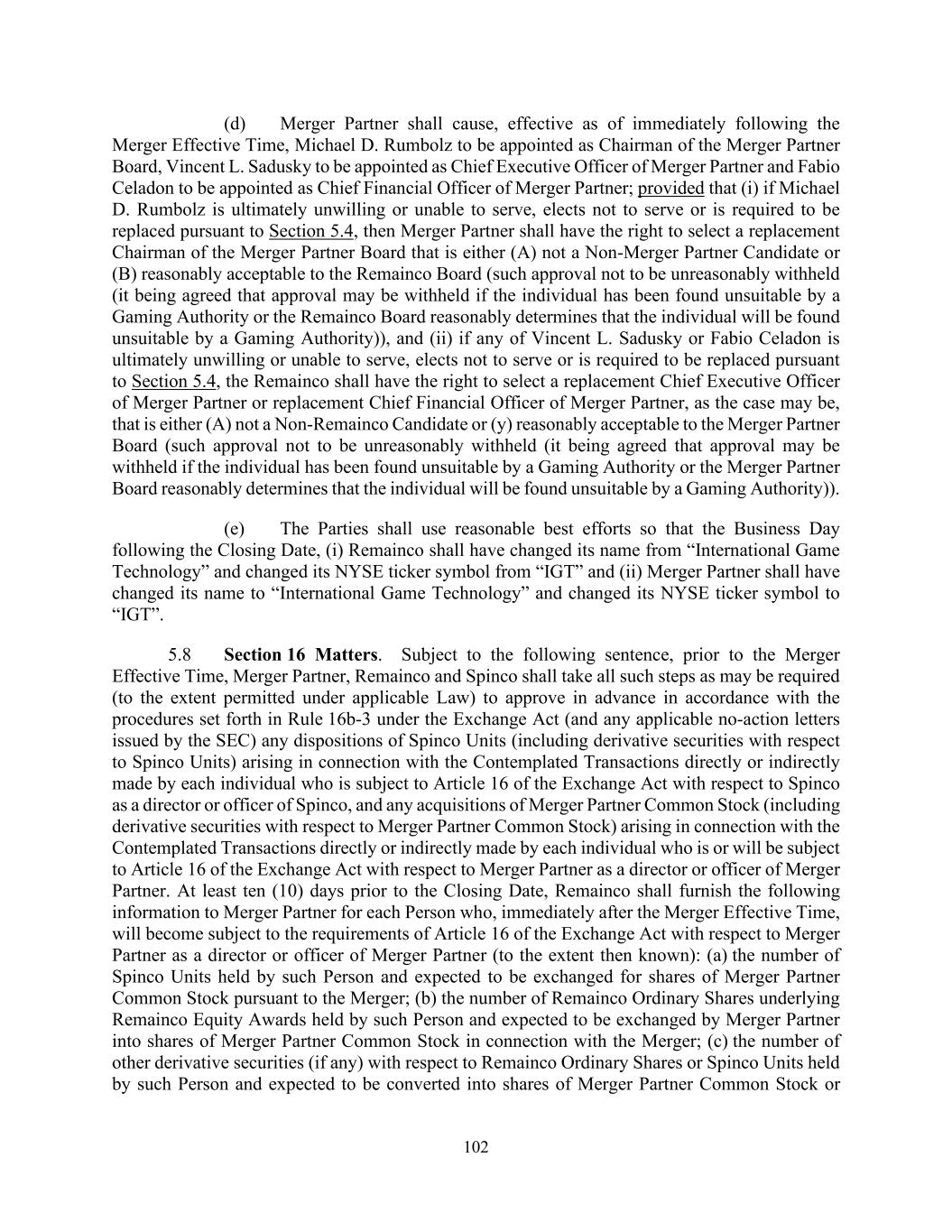 102 (d) Merger Partner shall cause, effective as of immediately following the Merger Effective Time, Michael D. Rumbolz to be appointed as Chairman of the Merger Partner Board, Vincent L. Sadusky to be appointed as Chief Executive Officer of Merger Partner and Fabio Celadon to be appointed as Chief Financial Officer of Merger Partner; provided that (i) if Michael D. Rumbolz is ultimately unwilling or unable to serve, elects not to serve or is required to be replaced pursuant to Section 5.4, then Merger Partner shall have the right to select a replacement Chairman of the Merger Partner Board that is either (A) not a Non-Merger Partner Candidate or (B) reasonably acceptable to the Remainco Board (such approval not to be unreasonably withheld (it being agreed that approval may be withheld if the individual has been found unsuitable by a Gaming Authority or the Remainco Board reasonably determines that the individual will be found unsuitable by a Gaming Authority)), and (ii) if any of Vincent L. Sadusky or Fabio Celadon is ultimately unwilling or unable to serve, elects not to serve or is required to be replaced pursuant to Section 5.4, the Remainco shall have the right to select a replacement Chief Executive Officer of Merger Partner or replacement Chief Financial Officer of Merger Partner, as the case may be, that is either (A) not a Non-Remainco Candidate or (y) reasonably acceptable to the Merger Partner Board (such approval not to be unreasonably withheld (it being agreed that approval may be withheld if the individual has been found unsuitable by a Gaming Authority or the Merger Partner Board reasonably determines that the individual will be found unsuitable by a Gaming Authority)). (e) The Parties shall use reasonable best efforts so that the Business Day following the Closing Date, (i) Remainco shall have changed its name from “International Game Technology” and changed its NYSE ticker symbol from “IGT” and (ii) Merger Partner shall have changed its name to “International Game Technology” and changed its NYSE ticker symbol to “IGT”. 5.8 Section 16 Matters. Subject to the following sentence, prior to the Merger Effective Time, Merger Partner, Remainco and Spinco shall take all such steps as may be required (to the extent permitted under applicable Law) to approve in advance in accordance with the procedures set forth in Rule 16b-3 under the Exchange Act (and any applicable no-action letters issued by the SEC) any dispositions of Spinco Units (including derivative securities with respect to Spinco Units) arising in connection with the Contemplated Transactions directly or indirectly made by each individual who is subject to Article 16 of the Exchange Act with respect to Spinco as a director or officer of Spinco, and any acquisitions of Merger Partner Common Stock (including derivative securities with respect to Merger Partner Common Stock) arising in connection with the Contemplated Transactions directly or indirectly made by each individual who is or will be subject to Article 16 of the Exchange Act with respect to Merger Partner as a director or officer of Merger Partner. At least ten (10) days prior to the Closing Date, Remainco shall furnish the following information to Merger Partner for each Person who, immediately after the Merger Effective Time, will become subject to the requirements of Article 16 of the Exchange Act with respect to Merger Partner as a director or officer of Merger Partner (to the extent then known): (a) the number of Spinco Units held by such Person and expected to be exchanged for shares of Merger Partner Common Stock pursuant to the Merger; (b) the number of Remainco Ordinary Shares underlying Remainco Equity Awards held by such Person and expected to be exchanged by Merger Partner into shares of Merger Partner Common Stock in connection with the Merger; (c) the number of other derivative securities (if any) with respect to Remainco Ordinary Shares or Spinco Units held by such Person and expected to be converted into shares of Merger Partner Common Stock or