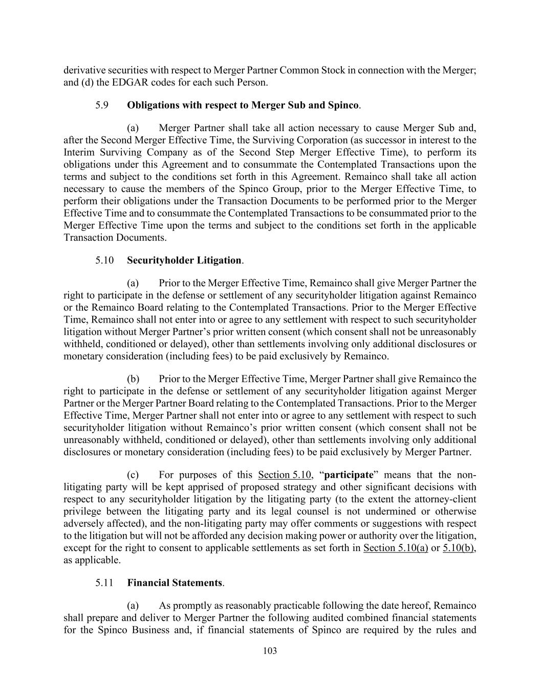 103 derivative securities with respect to Merger Partner Common Stock in connection with the Merger; and (d) the EDGAR codes for each such Person. 5.9 Obligations with respect to Merger Sub and Spinco. (a) Merger Partner shall take all action necessary to cause Merger Sub and, after the Second Merger Effective Time, the Surviving Corporation (as successor in interest to the Interim Surviving Company as of the Second Step Merger Effective Time), to perform its obligations under this Agreement and to consummate the Contemplated Transactions upon the terms and subject to the conditions set forth in this Agreement. Remainco shall take all action necessary to cause the members of the Spinco Group, prior to the Merger Effective Time, to perform their obligations under the Transaction Documents to be performed prior to the Merger Effective Time and to consummate the Contemplated Transactions to be consummated prior to the Merger Effective Time upon the terms and subject to the conditions set forth in the applicable Transaction Documents. 5.10 Securityholder Litigation. (a) Prior to the Merger Effective Time, Remainco shall give Merger Partner the right to participate in the defense or settlement of any securityholder litigation against Remainco or the Remainco Board relating to the Contemplated Transactions. Prior to the Merger Effective Time, Remainco shall not enter into or agree to any settlement with respect to such securityholder litigation without Merger Partner’s prior written consent (which consent shall not be unreasonably withheld, conditioned or delayed), other than settlements involving only additional disclosures or monetary consideration (including fees) to be paid exclusively by Remainco. (b) Prior to the Merger Effective Time, Merger Partner shall give Remainco the right to participate in the defense or settlement of any securityholder litigation against Merger Partner or the Merger Partner Board relating to the Contemplated Transactions. Prior to the Merger Effective Time, Merger Partner shall not enter into or agree to any settlement with respect to such securityholder litigation without Remainco’s prior written consent (which consent shall not be unreasonably withheld, conditioned or delayed), other than settlements involving only additional disclosures or monetary consideration (including fees) to be paid exclusively by Merger Partner. (c) For purposes of this Section 5.10, “participate” means that the non- litigating party will be kept apprised of proposed strategy and other significant decisions with respect to any securityholder litigation by the litigating party (to the extent the attorney-client privilege between the litigating party and its legal counsel is not undermined or otherwise adversely affected), and the non-litigating party may offer comments or suggestions with respect to the litigation but will not be afforded any decision making power or authority over the litigation, except for the right to consent to applicable settlements as set forth in Section 5.10(a) or 5.10(b), as applicable. 5.11 Financial Statements. (a) As promptly as reasonably practicable following the date hereof, Remainco shall prepare and deliver to Merger Partner the following audited combined financial statements for the Spinco Business and, if financial statements of Spinco are required by the rules and