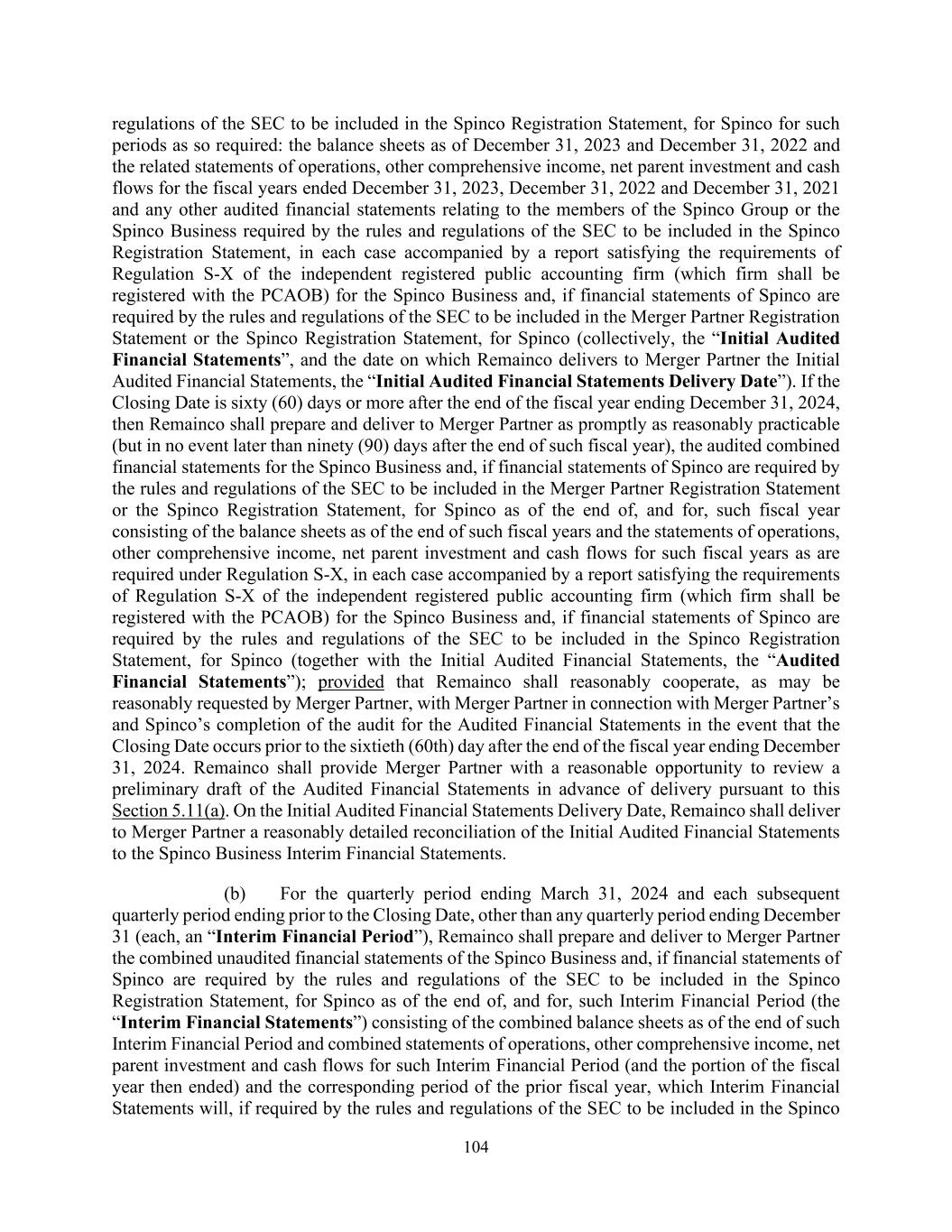 104 regulations of the SEC to be included in the Spinco Registration Statement, for Spinco for such periods as so required: the balance sheets as of December 31, 2023 and December 31, 2022 and the related statements of operations, other comprehensive income, net parent investment and cash flows for the fiscal years ended December 31, 2023, December 31, 2022 and December 31, 2021 and any other audited financial statements relating to the members of the Spinco Group or the Spinco Business required by the rules and regulations of the SEC to be included in the Spinco Registration Statement, in each case accompanied by a report satisfying the requirements of Regulation S-X of the independent registered public accounting firm (which firm shall be registered with the PCAOB) for the Spinco Business and, if financial statements of Spinco are required by the rules and regulations of the SEC to be included in the Merger Partner Registration Statement or the Spinco Registration Statement, for Spinco (collectively, the “Initial Audited Financial Statements”, and the date on which Remainco delivers to Merger Partner the Initial Audited Financial Statements, the “Initial Audited Financial Statements Delivery Date”). If the Closing Date is sixty (60) days or more after the end of the fiscal year ending December 31, 2024, then Remainco shall prepare and deliver to Merger Partner as promptly as reasonably practicable (but in no event later than ninety (90) days after the end of such fiscal year), the audited combined financial statements for the Spinco Business and, if financial statements of Spinco are required by the rules and regulations of the SEC to be included in the Merger Partner Registration Statement or the Spinco Registration Statement, for Spinco as of the end of, and for, such fiscal year consisting of the balance sheets as of the end of such fiscal years and the statements of operations, other comprehensive income, net parent investment and cash flows for such fiscal years as are required under Regulation S-X, in each case accompanied by a report satisfying the requirements of Regulation S-X of the independent registered public accounting firm (which firm shall be registered with the PCAOB) for the Spinco Business and, if financial statements of Spinco are required by the rules and regulations of the SEC to be included in the Spinco Registration Statement, for Spinco (together with the Initial Audited Financial Statements, the “Audited Financial Statements”); provided that Remainco shall reasonably cooperate, as may be reasonably requested by Merger Partner, with Merger Partner in connection with Merger Partner’s and Spinco’s completion of the audit for the Audited Financial Statements in the event that the Closing Date occurs prior to the sixtieth (60th) day after the end of the fiscal year ending December 31, 2024. Remainco shall provide Merger Partner with a reasonable opportunity to review a preliminary draft of the Audited Financial Statements in advance of delivery pursuant to this Section 5.11(a). On the Initial Audited Financial Statements Delivery Date, Remainco shall deliver to Merger Partner a reasonably detailed reconciliation of the Initial Audited Financial Statements to the Spinco Business Interim Financial Statements. (b) For the quarterly period ending March 31, 2024 and each subsequent quarterly period ending prior to the Closing Date, other than any quarterly period ending December 31 (each, an “Interim Financial Period”), Remainco shall prepare and deliver to Merger Partner the combined unaudited financial statements of the Spinco Business and, if financial statements of Spinco are required by the rules and regulations of the SEC to be included in the Spinco Registration Statement, for Spinco as of the end of, and for, such Interim Financial Period (the “Interim Financial Statements”) consisting of the combined balance sheets as of the end of such Interim Financial Period and combined statements of operations, other comprehensive income, net parent investment and cash flows for such Interim Financial Period (and the portion of the fiscal year then ended) and the corresponding period of the prior fiscal year, which Interim Financial Statements will, if required by the rules and regulations of the SEC to be included in the Spinco