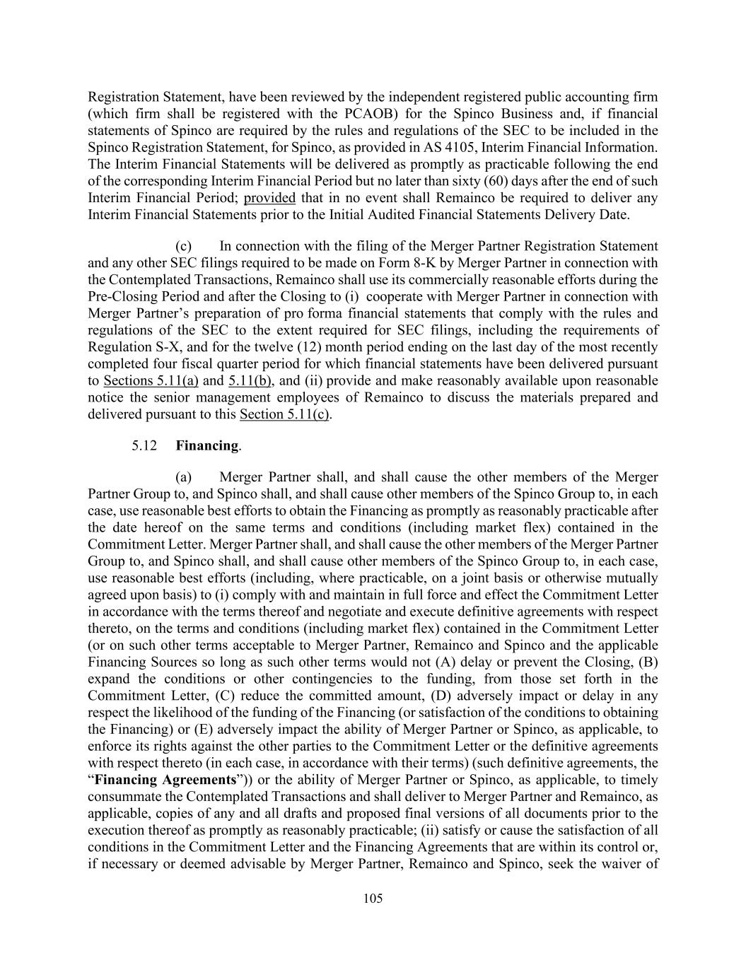 105 Registration Statement, have been reviewed by the independent registered public accounting firm (which firm shall be registered with the PCAOB) for the Spinco Business and, if financial statements of Spinco are required by the rules and regulations of the SEC to be included in the Spinco Registration Statement, for Spinco, as provided in AS 4105, Interim Financial Information. The Interim Financial Statements will be delivered as promptly as practicable following the end of the corresponding Interim Financial Period but no later than sixty (60) days after the end of such Interim Financial Period; provided that in no event shall Remainco be required to deliver any Interim Financial Statements prior to the Initial Audited Financial Statements Delivery Date. (c) In connection with the filing of the Merger Partner Registration Statement and any other SEC filings required to be made on Form 8-K by Merger Partner in connection with the Contemplated Transactions, Remainco shall use its commercially reasonable efforts during the Pre-Closing Period and after the Closing to (i) cooperate with Merger Partner in connection with Merger Partner’s preparation of pro forma financial statements that comply with the rules and regulations of the SEC to the extent required for SEC filings, including the requirements of Regulation S-X, and for the twelve (12) month period ending on the last day of the most recently completed four fiscal quarter period for which financial statements have been delivered pursuant to Sections 5.11(a) and 5.11(b), and (ii) provide and make reasonably available upon reasonable notice the senior management employees of Remainco to discuss the materials prepared and delivered pursuant to this Section 5.11(c). 5.12 Financing. (a) Merger Partner shall, and shall cause the other members of the Merger Partner Group to, and Spinco shall, and shall cause other members of the Spinco Group to, in each case, use reasonable best efforts to obtain the Financing as promptly as reasonably practicable after the date hereof on the same terms and conditions (including market flex) contained in the Commitment Letter. Merger Partner shall, and shall cause the other members of the Merger Partner Group to, and Spinco shall, and shall cause other members of the Spinco Group to, in each case, use reasonable best efforts (including, where practicable, on a joint basis or otherwise mutually agreed upon basis) to (i) comply with and maintain in full force and effect the Commitment Letter in accordance with the terms thereof and negotiate and execute definitive agreements with respect thereto, on the terms and conditions (including market flex) contained in the Commitment Letter (or on such other terms acceptable to Merger Partner, Remainco and Spinco and the applicable Financing Sources so long as such other terms would not (A) delay or prevent the Closing, (B) expand the conditions or other contingencies to the funding, from those set forth in the Commitment Letter, (C) reduce the committed amount, (D) adversely impact or delay in any respect the likelihood of the funding of the Financing (or satisfaction of the conditions to obtaining the Financing) or (E) adversely impact the ability of Merger Partner or Spinco, as applicable, to enforce its rights against the other parties to the Commitment Letter or the definitive agreements with respect thereto (in each case, in accordance with their terms) (such definitive agreements, the “Financing Agreements”)) or the ability of Merger Partner or Spinco, as applicable, to timely consummate the Contemplated Transactions and shall deliver to Merger Partner and Remainco, as applicable, copies of any and all drafts and proposed final versions of all documents prior to the execution thereof as promptly as reasonably practicable; (ii) satisfy or cause the satisfaction of all conditions in the Commitment Letter and the Financing Agreements that are within its control or, if necessary or deemed advisable by Merger Partner, Remainco and Spinco, seek the waiver of
