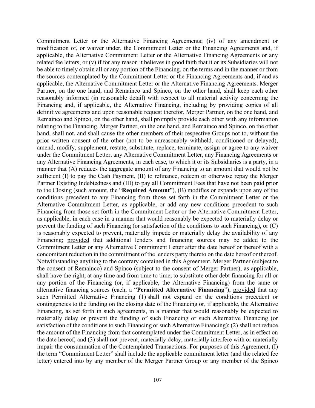 107 Commitment Letter or the Alternative Financing Agreements; (iv) of any amendment or modification of, or waiver under, the Commitment Letter or the Financing Agreements and, if applicable, the Alternative Commitment Letter or the Alternative Financing Agreements or any related fee letters; or (v) if for any reason it believes in good faith that it or its Subsidiaries will not be able to timely obtain all or any portion of the Financing, on the terms and in the manner or from the sources contemplated by the Commitment Letter or the Financing Agreements and, if and as applicable, the Alternative Commitment Letter or the Alternative Financing Agreements. Merger Partner, on the one hand, and Remainco and Spinco, on the other hand, shall keep each other reasonably informed (in reasonable detail) with respect to all material activity concerning the Financing and, if applicable, the Alternative Financing, including by providing copies of all definitive agreements and upon reasonable request therefor, Merger Partner, on the one hand, and Remainco and Spinco, on the other hand, shall promptly provide each other with any information relating to the Financing. Merger Partner, on the one hand, and Remainco and Spinco, on the other hand, shall not, and shall cause the other members of their respective Groups not to, without the prior written consent of the other (not to be unreasonably withheld, conditioned or delayed), amend, modify, supplement, restate, substitute, replace, terminate, assign or agree to any waiver under the Commitment Letter, any Alternative Commitment Letter, any Financing Agreements or any Alternative Financing Agreements, in each case, to which it or its Subsidiaries is a party, in a manner that (A) reduces the aggregate amount of any Financing to an amount that would not be sufficient (I) to pay the Cash Payment, (II) to refinance, redeem or otherwise repay the Merger Partner Existing Indebtedness and (III) to pay all Commitment Fees that have not been paid prior to the Closing (such amount, the “Required Amount”), (B) modifies or expands upon any of the conditions precedent to any Financing from those set forth in the Commitment Letter or the Alternative Commitment Letter, as applicable, or add any new conditions precedent to such Financing from those set forth in the Commitment Letter or the Alternative Commitment Letter, as applicable, in each case in a manner that would reasonably be expected to materially delay or prevent the funding of such Financing (or satisfaction of the conditions to such Financing), or (C) is reasonably expected to prevent, materially impede or materially delay the availability of any Financing; provided that additional lenders and financing sources may be added to the Commitment Letter or any Alternative Commitment Letter after the date hereof or thereof with a concomitant reduction in the commitment of the lenders party thereto on the date hereof or thereof. Notwithstanding anything to the contrary contained in this Agreement, Merger Partner (subject to the consent of Remainco) and Spinco (subject to the consent of Merger Partner), as applicable, shall have the right, at any time and from time to time, to substitute other debt financing for all or any portion of the Financing (or, if applicable, the Alternative Financing) from the same or alternative financing sources (each, a “Permitted Alternative Financing”); provided that any such Permitted Alternative Financing (1) shall not expand on the conditions precedent or contingencies to the funding on the closing date of the Financing or, if applicable, the Alternative Financing, as set forth in such agreements, in a manner that would reasonably be expected to materially delay or prevent the funding of such Financing or such Alternative Financing (or satisfaction of the conditions to such Financing or such Alternative Financing); (2) shall not reduce the amount of the Financing from that contemplated under the Commitment Letter, as in effect on the date hereof; and (3) shall not prevent, materially delay, materially interfere with or materially impair the consummation of the Contemplated Transactions. For purposes of this Agreement, (I) the term “Commitment Letter” shall include the applicable commitment letter (and the related fee letter) entered into by any member of the Merger Partner Group or any member of the Spinco