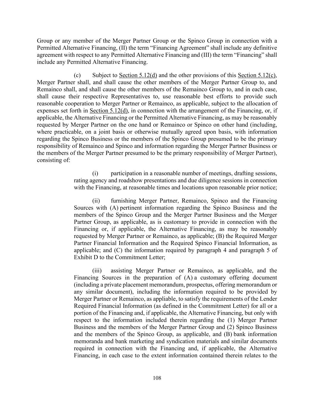 108 Group or any member of the Merger Partner Group or the Spinco Group in connection with a Permitted Alternative Financing, (II) the term “Financing Agreement” shall include any definitive agreement with respect to any Permitted Alternative Financing and (III) the term “Financing” shall include any Permitted Alternative Financing. (c) Subject to Section 5.12(d) and the other provisions of this Section 5.12(c), Merger Partner shall, and shall cause the other members of the Merger Partner Group to, and Remainco shall, and shall cause the other members of the Remainco Group to, and in each case, shall cause their respective Representatives to, use reasonable best efforts to provide such reasonable cooperation to Merger Partner or Remainco, as applicable, subject to the allocation of expenses set forth in Section 5.12(d), in connection with the arrangement of the Financing, or, if applicable, the Alternative Financing or the Permitted Alternative Financing, as may be reasonably requested by Merger Partner on the one hand or Remainco or Spinco on other hand (including, where practicable, on a joint basis or otherwise mutually agreed upon basis, with information regarding the Spinco Business or the members of the Spinco Group presumed to be the primary responsibility of Remainco and Spinco and information regarding the Merger Partner Business or the members of the Merger Partner presumed to be the primary responsibility of Merger Partner), consisting of: (i) participation in a reasonable number of meetings, drafting sessions, rating agency and roadshow presentations and due diligence sessions in connection with the Financing, at reasonable times and locations upon reasonable prior notice; (ii) furnishing Merger Partner, Remainco, Spinco and the Financing Sources with (A) pertinent information regarding the Spinco Business and the members of the Spinco Group and the Merger Partner Business and the Merger Partner Group, as applicable, as is customary to provide in connection with the Financing or, if applicable, the Alternative Financing, as may be reasonably requested by Merger Partner or Remainco, as applicable; (B) the Required Merger Partner Financial Information and the Required Spinco Financial Information, as applicable; and (C) the information required by paragraph 4 and paragraph 5 of Exhibit D to the Commitment Letter; (iii) assisting Merger Partner or Remainco, as applicable, and the Financing Sources in the preparation of (A) a customary offering document (including a private placement memorandum, prospectus, offering memorandum or any similar document), including the information required to be provided by Merger Partner or Remainco, as appliable, to satisfy the requirements of the Lender Required Financial Information (as defined in the Commitment Letter) for all or a portion of the Financing and, if applicable, the Alternative Financing, but only with respect to the information included therein regarding the (1) Merger Partner Business and the members of the Merger Partner Group and (2) Spinco Business and the members of the Spinco Group, as applicable, and (B) bank information memoranda and bank marketing and syndication materials and similar documents required in connection with the Financing and, if applicable, the Alternative Financing, in each case to the extent information contained therein relates to the