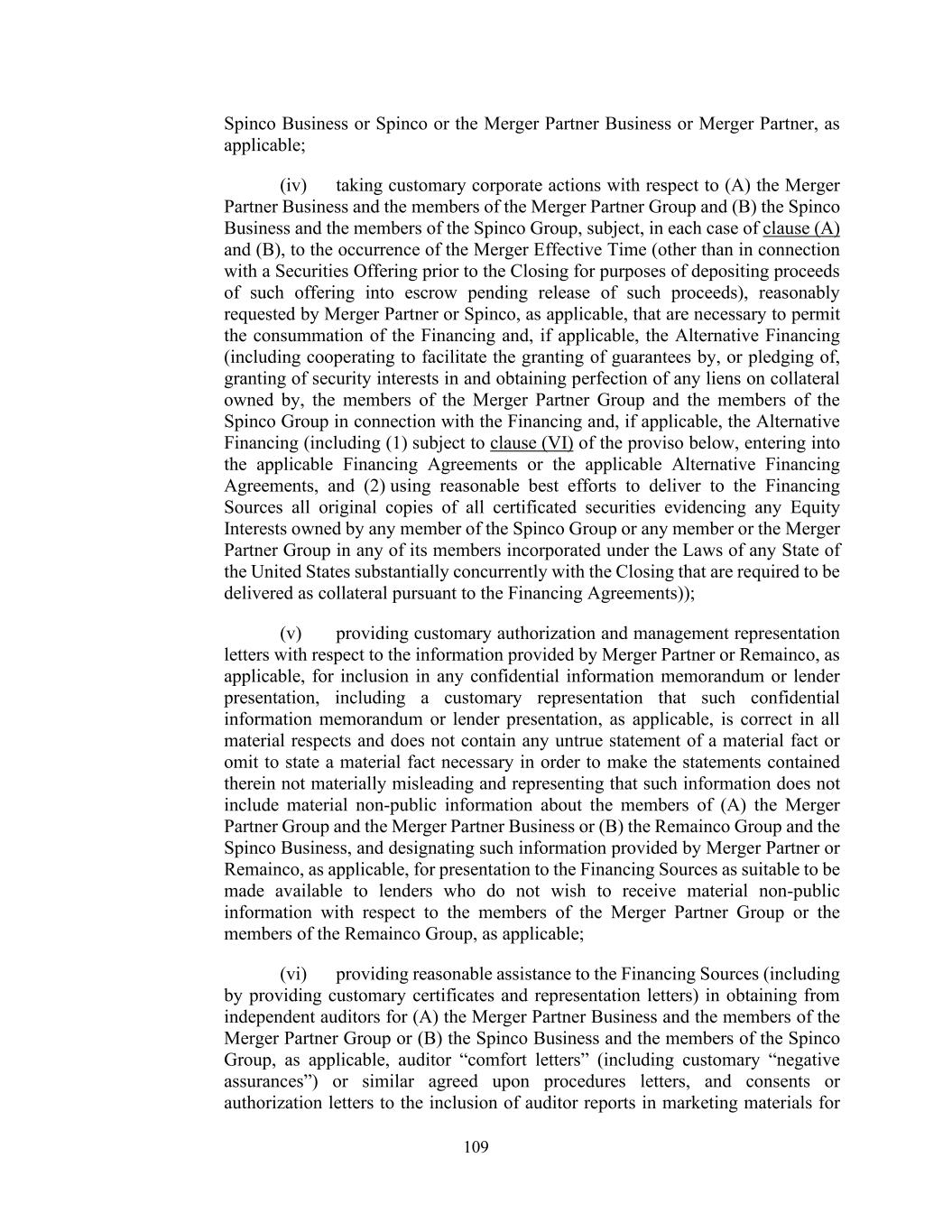109 Spinco Business or Spinco or the Merger Partner Business or Merger Partner, as applicable; (iv) taking customary corporate actions with respect to (A) the Merger Partner Business and the members of the Merger Partner Group and (B) the Spinco Business and the members of the Spinco Group, subject, in each case of clause (A) and (B), to the occurrence of the Merger Effective Time (other than in connection with a Securities Offering prior to the Closing for purposes of depositing proceeds of such offering into escrow pending release of such proceeds), reasonably requested by Merger Partner or Spinco, as applicable, that are necessary to permit the consummation of the Financing and, if applicable, the Alternative Financing (including cooperating to facilitate the granting of guarantees by, or pledging of, granting of security interests in and obtaining perfection of any liens on collateral owned by, the members of the Merger Partner Group and the members of the Spinco Group in connection with the Financing and, if applicable, the Alternative Financing (including (1) subject to clause (VI) of the proviso below, entering into the applicable Financing Agreements or the applicable Alternative Financing Agreements, and (2) using reasonable best efforts to deliver to the Financing Sources all original copies of all certificated securities evidencing any Equity Interests owned by any member of the Spinco Group or any member or the Merger Partner Group in any of its members incorporated under the Laws of any State of the United States substantially concurrently with the Closing that are required to be delivered as collateral pursuant to the Financing Agreements)); (v) providing customary authorization and management representation letters with respect to the information provided by Merger Partner or Remainco, as applicable, for inclusion in any confidential information memorandum or lender presentation, including a customary representation that such confidential information memorandum or lender presentation, as applicable, is correct in all material respects and does not contain any untrue statement of a material fact or omit to state a material fact necessary in order to make the statements contained therein not materially misleading and representing that such information does not include material non-public information about the members of (A) the Merger Partner Group and the Merger Partner Business or (B) the Remainco Group and the Spinco Business, and designating such information provided by Merger Partner or Remainco, as applicable, for presentation to the Financing Sources as suitable to be made available to lenders who do not wish to receive material non-public information with respect to the members of the Merger Partner Group or the members of the Remainco Group, as applicable; (vi) providing reasonable assistance to the Financing Sources (including by providing customary certificates and representation letters) in obtaining from independent auditors for (A) the Merger Partner Business and the members of the Merger Partner Group or (B) the Spinco Business and the members of the Spinco Group, as applicable, auditor “comfort letters” (including customary “negative assurances”) or similar agreed upon procedures letters, and consents or authorization letters to the inclusion of auditor reports in marketing materials for