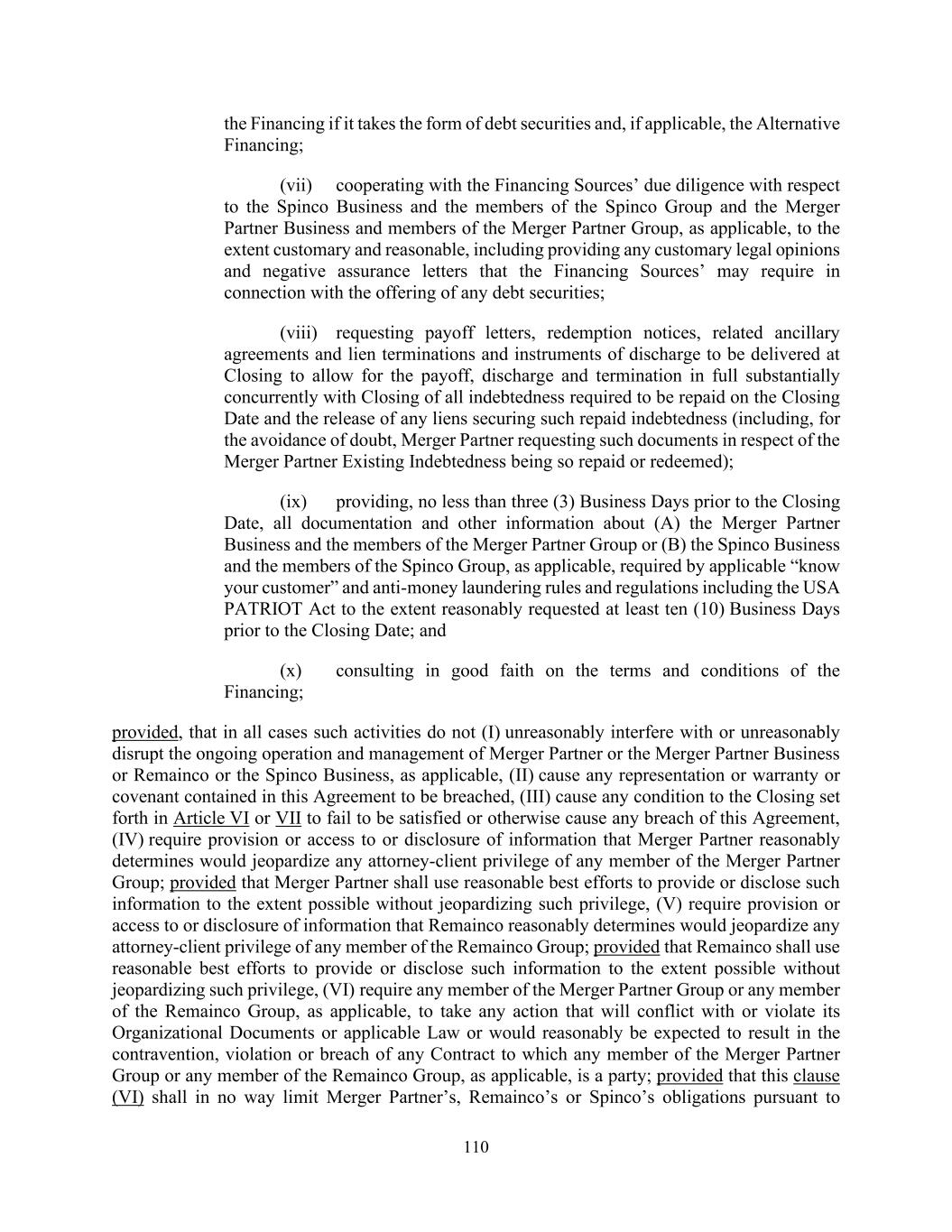 110 the Financing if it takes the form of debt securities and, if applicable, the Alternative Financing; (vii) cooperating with the Financing Sources’ due diligence with respect to the Spinco Business and the members of the Spinco Group and the Merger Partner Business and members of the Merger Partner Group, as applicable, to the extent customary and reasonable, including providing any customary legal opinions and negative assurance letters that the Financing Sources’ may require in connection with the offering of any debt securities; (viii) requesting payoff letters, redemption notices, related ancillary agreements and lien terminations and instruments of discharge to be delivered at Closing to allow for the payoff, discharge and termination in full substantially concurrently with Closing of all indebtedness required to be repaid on the Closing Date and the release of any liens securing such repaid indebtedness (including, for the avoidance of doubt, Merger Partner requesting such documents in respect of the Merger Partner Existing Indebtedness being so repaid or redeemed); (ix) providing, no less than three (3) Business Days prior to the Closing Date, all documentation and other information about (A) the Merger Partner Business and the members of the Merger Partner Group or (B) the Spinco Business and the members of the Spinco Group, as applicable, required by applicable “know your customer” and anti-money laundering rules and regulations including the USA PATRIOT Act to the extent reasonably requested at least ten (10) Business Days prior to the Closing Date; and (x) consulting in good faith on the terms and conditions of the Financing; provided, that in all cases such activities do not (I) unreasonably interfere with or unreasonably disrupt the ongoing operation and management of Merger Partner or the Merger Partner Business or Remainco or the Spinco Business, as applicable, (II) cause any representation or warranty or covenant contained in this Agreement to be breached, (III) cause any condition to the Closing set forth in Article VI or VII to fail to be satisfied or otherwise cause any breach of this Agreement, (IV) require provision or access to or disclosure of information that Merger Partner reasonably determines would jeopardize any attorney-client privilege of any member of the Merger Partner Group; provided that Merger Partner shall use reasonable best efforts to provide or disclose such information to the extent possible without jeopardizing such privilege, (V) require provision or access to or disclosure of information that Remainco reasonably determines would jeopardize any attorney-client privilege of any member of the Remainco Group; provided that Remainco shall use reasonable best efforts to provide or disclose such information to the extent possible without jeopardizing such privilege, (VI) require any member of the Merger Partner Group or any member of the Remainco Group, as applicable, to take any action that will conflict with or violate its Organizational Documents or applicable Law or would reasonably be expected to result in the contravention, violation or breach of any Contract to which any member of the Merger Partner Group or any member of the Remainco Group, as applicable, is a party; provided that this clause (VI) shall in no way limit Merger Partner’s, Remainco’s or Spinco’s obligations pursuant to
