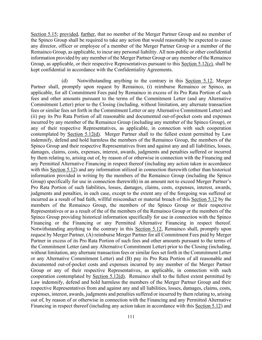 111 Section 5.15; provided, further, that no member of the Merger Partner Group and no member of the Spinco Group shall be required to take any action that would reasonably be expected to cause any director, officer or employee of a member of the Merger Partner Group or a member of the Remainco Group, as applicable, to incur any personal liability. All non-public or other confidential information provided by any member of the Merger Partner Group or any member of the Remainco Group, as applicable, or their respective Representatives pursuant to this Section 5.12(c), shall be kept confidential in accordance with the Confidentiality Agreements. (d) Notwithstanding anything to the contrary in this Section 5.12, Merger Partner shall, promptly upon request by Remainco, (i) reimburse Remainco or Spinco, as applicable, for all Commitment Fees paid by Remainco in excess of its Pro Rata Portion of such fees and other amounts pursuant to the terms of the Commitment Letter (and any Alternative Commitment Letter) prior to the Closing (including, without limitation, any alternate transaction fees or similar fees set forth in the Commitment Letter or any Alternative Commitment Letter) and (ii) pay its Pro Rata Portion of all reasonable and documented out-of-pocket costs and expenses incurred by any member of the Remainco Group (including any member of the Spinco Group), or any of their respective Representatives, as applicable, in connection with such cooperation contemplated by Section 5.12(d). Merger Partner shall to the fullest extent permitted by Law indemnify, defend and hold harmless the members of the Remainco Group, the members of the Spinco Group and their respective Representatives from and against any and all liabilities, losses, damages, claims, costs, expenses, interest, awards, judgments and penalties suffered or incurred by them relating to, arising out of, by reason of or otherwise in connection with the Financing and any Permitted Alternative Financing in respect thereof (including any action taken in accordance with this Section 5.12) and any information utilized in connection therewith (other than historical information provided in writing by the members of the Remainco Group (including the Spinco Group) specifically for use in connection therewith) in an amount not to exceed Merger Partner’s Pro Rata Portion of such liabilities, losses, damages, claims, costs, expenses, interest, awards, judgments and penalties, in each case, except to the extent any of the foregoing was suffered or incurred as a result of bad faith, willful misconduct or material breach of this Section 5.12 by the members of the Remainco Group, the members of the Spinco Group or their respective Representatives or as a result of the of the members of the Remainco Group or the members of the Spinco Group providing historical information specifically for use in connection with the Spinco Financing or the Financing or any Permitted Alternative Financing in respect thereof. Notwithstanding anything to the contrary in this Section 5.12, Remainco shall, promptly upon request by Merger Partner, (A) reimburse Merger Partner for all Commitment Fees paid by Merger Partner in excess of its Pro Rata Portion of such fees and other amounts pursuant to the terms of the Commitment Letter (and any Alternative Commitment Letter) prior to the Closing (including, without limitation, any alternate transaction fees or similar fees set forth in the Commitment Letter or any Alternative Commitment Letter) and (B) pay its Pro Rata Portion of all reasonable and documented out-of-pocket costs and expenses incurred by any member of the Merger Partner Group or any of their respective Representatives, as applicable, in connection with such cooperation contemplated by Section 5.12(d). Remainco shall to the fullest extent permitted by Law indemnify, defend and hold harmless the members of the Merger Partner Group and their respective Representatives from and against any and all liabilities, losses, damages, claims, costs, expenses, interest, awards, judgments and penalties suffered or incurred by them relating to, arising out of, by reason of or otherwise in connection with the Financing and any Permitted Alternative Financing in respect thereof (including any action taken in accordance with this Section 5.12) and
