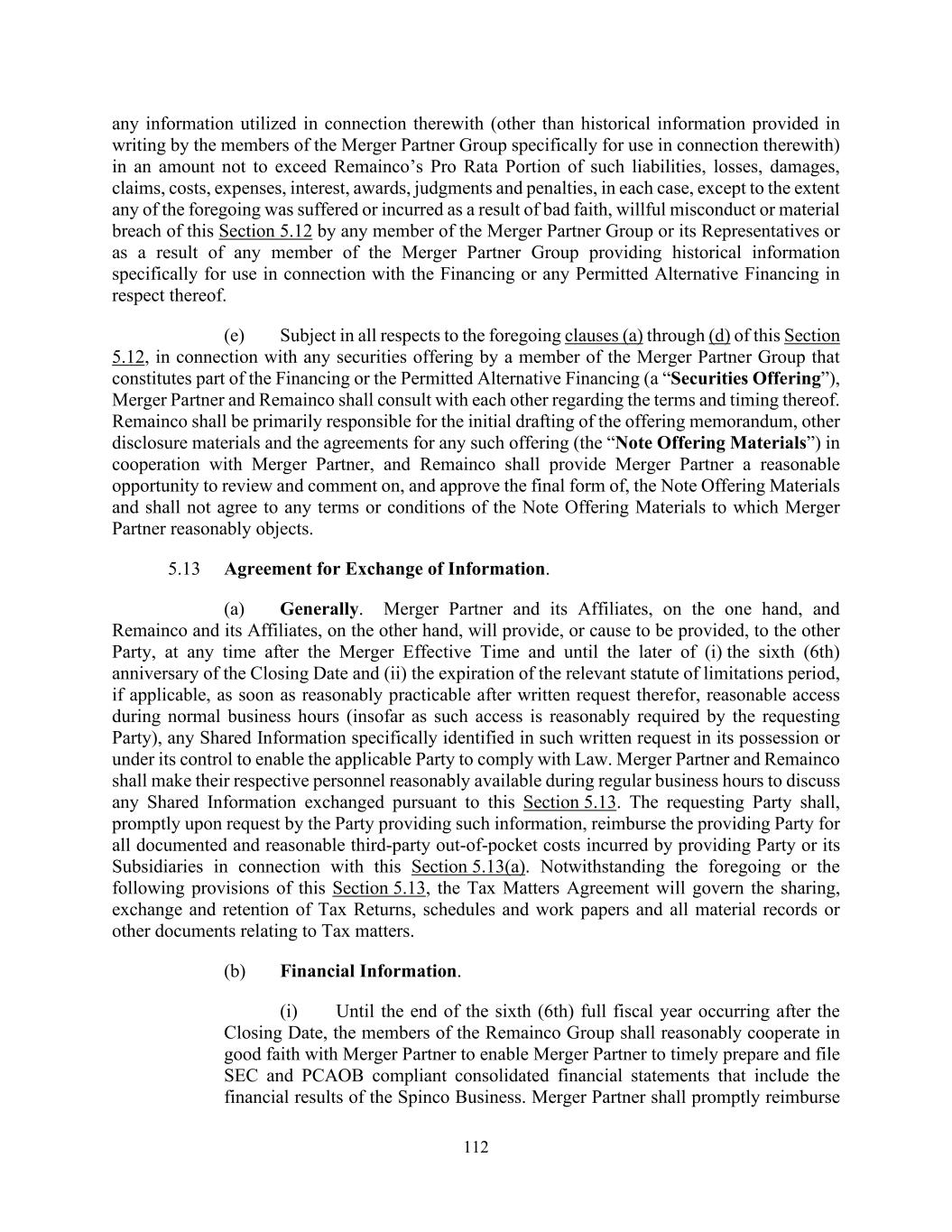 112 any information utilized in connection therewith (other than historical information provided in writing by the members of the Merger Partner Group specifically for use in connection therewith) in an amount not to exceed Remainco’s Pro Rata Portion of such liabilities, losses, damages, claims, costs, expenses, interest, awards, judgments and penalties, in each case, except to the extent any of the foregoing was suffered or incurred as a result of bad faith, willful misconduct or material breach of this Section 5.12 by any member of the Merger Partner Group or its Representatives or as a result of any member of the Merger Partner Group providing historical information specifically for use in connection with the Financing or any Permitted Alternative Financing in respect thereof. (e) Subject in all respects to the foregoing clauses (a) through (d) of this Section 5.12, in connection with any securities offering by a member of the Merger Partner Group that constitutes part of the Financing or the Permitted Alternative Financing (a “Securities Offering”), Merger Partner and Remainco shall consult with each other regarding the terms and timing thereof. Remainco shall be primarily responsible for the initial drafting of the offering memorandum, other disclosure materials and the agreements for any such offering (the “Note Offering Materials”) in cooperation with Merger Partner, and Remainco shall provide Merger Partner a reasonable opportunity to review and comment on, and approve the final form of, the Note Offering Materials and shall not agree to any terms or conditions of the Note Offering Materials to which Merger Partner reasonably objects. 5.13 Agreement for Exchange of Information. (a) Generally. Merger Partner and its Affiliates, on the one hand, and Remainco and its Affiliates, on the other hand, will provide, or cause to be provided, to the other Party, at any time after the Merger Effective Time and until the later of (i) the sixth (6th) anniversary of the Closing Date and (ii) the expiration of the relevant statute of limitations period, if applicable, as soon as reasonably practicable after written request therefor, reasonable access during normal business hours (insofar as such access is reasonably required by the requesting Party), any Shared Information specifically identified in such written request in its possession or under its control to enable the applicable Party to comply with Law. Merger Partner and Remainco shall make their respective personnel reasonably available during regular business hours to discuss any Shared Information exchanged pursuant to this Section 5.13. The requesting Party shall, promptly upon request by the Party providing such information, reimburse the providing Party for all documented and reasonable third-party out-of-pocket costs incurred by providing Party or its Subsidiaries in connection with this Section 5.13(a). Notwithstanding the foregoing or the following provisions of this Section 5.13, the Tax Matters Agreement will govern the sharing, exchange and retention of Tax Returns, schedules and work papers and all material records or other documents relating to Tax matters. (b) Financial Information. (i) Until the end of the sixth (6th) full fiscal year occurring after the Closing Date, the members of the Remainco Group shall reasonably cooperate in good faith with Merger Partner to enable Merger Partner to timely prepare and file SEC and PCAOB compliant consolidated financial statements that include the financial results of the Spinco Business. Merger Partner shall promptly reimburse