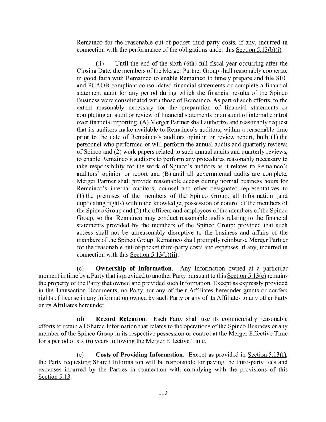 113 Remainco for the reasonable out-of-pocket third-party costs, if any, incurred in connection with the performance of the obligations under this Section 5.13(b)(i). (ii) Until the end of the sixth (6th) full fiscal year occurring after the Closing Date, the members of the Merger Partner Group shall reasonably cooperate in good faith with Remainco to enable Remainco to timely prepare and file SEC and PCAOB compliant consolidated financial statements or complete a financial statement audit for any period during which the financial results of the Spinco Business were consolidated with those of Remainco. As part of such efforts, to the extent reasonably necessary for the preparation of financial statements or completing an audit or review of financial statements or an audit of internal control over financial reporting, (A) Merger Partner shall authorize and reasonably request that its auditors make available to Remainco’s auditors, within a reasonable time prior to the date of Remainco’s auditors opinion or review report, both (1) the personnel who performed or will perform the annual audits and quarterly reviews of Spinco and (2) work papers related to such annual audits and quarterly reviews, to enable Remainco’s auditors to perform any procedures reasonably necessary to take responsibility for the work of Spinco’s auditors as it relates to Remainco’s auditors’ opinion or report and (B) until all governmental audits are complete, Merger Partner shall provide reasonable access during normal business hours for Remainco’s internal auditors, counsel and other designated representatives to (1) the premises of the members of the Spinco Group, all Information (and duplicating rights) within the knowledge, possession or control of the members of the Spinco Group and (2) the officers and employees of the members of the Spinco Group, so that Remainco may conduct reasonable audits relating to the financial statements provided by the members of the Spinco Group; provided that such access shall not be unreasonably disruptive to the business and affairs of the members of the Spinco Group. Remainco shall promptly reimburse Merger Partner for the reasonable out-of-pocket third-party costs and expenses, if any, incurred in connection with this Section 5.13(b)(ii). (c) Ownership of Information. Any Information owned at a particular moment in time by a Party that is provided to another Party pursuant to this Section 5.13(c) remains the property of the Party that owned and provided such Information. Except as expressly provided in the Transaction Documents, no Party nor any of their Affiliates hereunder grants or confers rights of license in any Information owned by such Party or any of its Affiliates to any other Party or its Affiliates hereunder. (d) Record Retention. Each Party shall use its commercially reasonable efforts to retain all Shared Information that relates to the operations of the Spinco Business or any member of the Spinco Group in its respective possession or control at the Merger Effective Time for a period of six (6) years following the Merger Effective Time. (e) Costs of Providing Information. Except as provided in Section 5.13(f), the Party requesting Shared Information will be responsible for paying the third-party fees and expenses incurred by the Parties in connection with complying with the provisions of this Section 5.13.