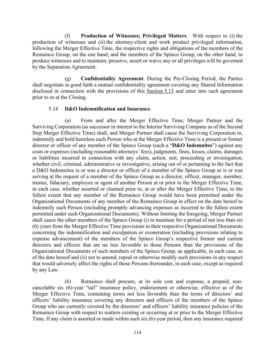 114 (f) Production of Witnesses; Privileged Matters. With respect to (i) the production of witnesses and (ii) the attorney-client and work product privileged information, following the Merger Effective Time, the respective rights and obligations of the members of the Remainco Group, on the one hand, and the members of the Spinco Group, on the other hand, to produce witnesses and to maintain, preserve, assert or waive any or all privileges will be governed by the Separation Agreement. (g) Confidentiality Agreement. During the Pre-Closing Period, the Parties shall negotiate in good faith a mutual confidentiality agreement covering any Shared Information disclosed in connection with the provisions of this Section 5.13 and enter into such agreement prior to or at the Closing. 5.14 D&O Indemnification and Insurance. (a) From and after the Merger Effective Time, Merger Partner and the Surviving Corporation (as successor in interest to the Interim Surviving Company as of the Second Step Merger Effective Time) shall, and Merger Partner shall cause the Surviving Corporation to, indemnify and hold harmless each Person who at the Merger Effective Time is a present or former director or officer of any member of the Spinco Group (each a “D&O Indemnitee”) against any costs or expenses (including reasonable attorneys’ fees), judgments, fines, losses, claims, damages or liabilities incurred in connection with any claim, action, suit, proceeding or investigation, whether civil, criminal, administrative or investigative, arising out of or pertaining to the fact that a D&O Indemnitee is or was a director or officer of a member of the Spinco Group or is or was serving at the request of a member of the Spinco Group as a director, officer, manager, member, trustee, fiduciary, employee or agent of another Person at or prior to the Merger Effective Time, in each case, whether asserted or claimed prior to, at or after the Merger Effective Time, to the fullest extent that any member of the Remainco Group would have been permitted under the Organizational Documents of any member of the Remainco Group in effect on the date hereof to indemnify such Person (including promptly advancing expenses as incurred to the fullest extent permitted under such Organizational Documents). Without limiting the foregoing, Merger Partner shall cause the other members of the Spinco Group (i) to maintain for a period of not less than six (6) years from the Merger Effective Time provisions in their respective Organizational Documents concerning the indemnification and exculpation or exoneration (including provisions relating to expense advancement) of the members of the Spinco Group’s respective former and current directors and officers that are no less favorable to those Persons than the provisions of the Organizational Documents of such members of the Spinco Group, as applicable, in each case, as of the date hereof and (ii) not to amend, repeal or otherwise modify such provisions in any respect that would adversely affect the rights of those Persons thereunder, in each case, except as required by any Law. (b) Remainco shall procure, at its sole cost and expense, a prepaid, non- cancelable six (6)-year “tail” insurance policy, endorsement or otherwise, effective as of the Merger Effective Time, containing terms not less favorable than the terms of directors’ and officers’ liability insurance covering any directors and officers of the members of the Spinco Group who are currently covered by the directors’ and officers’ liability insurance policies of the Remainco Group with respect to matters existing or occurring at or prior to the Merger Effective Time. If any claim is asserted or made within such six (6)-year period, then any insurance required