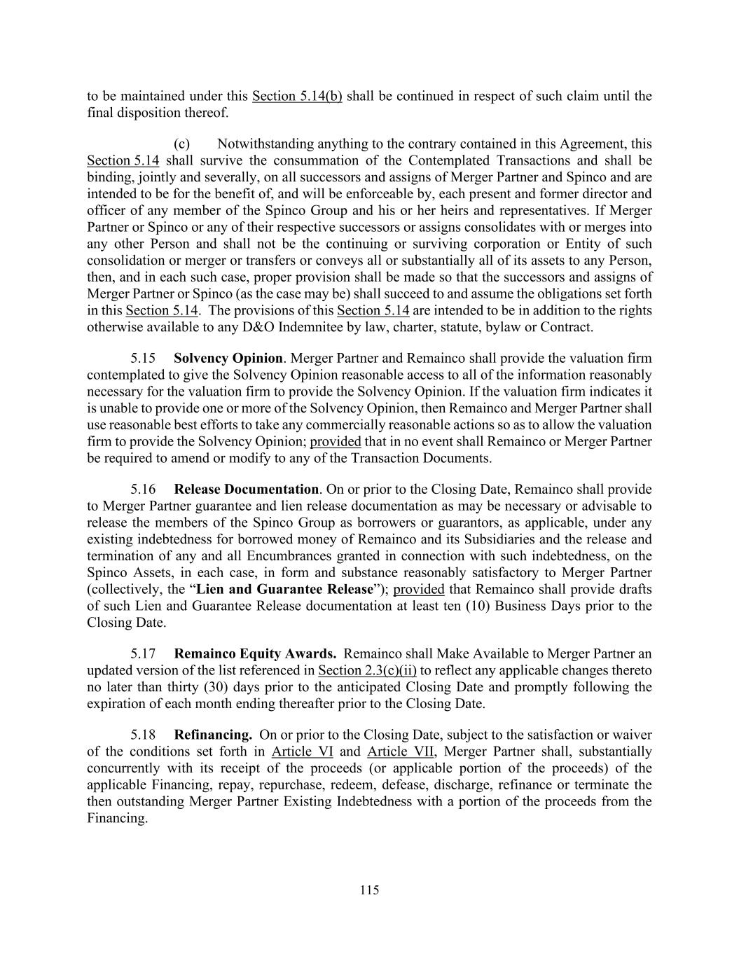 115 to be maintained under this Section 5.14(b) shall be continued in respect of such claim until the final disposition thereof. (c) Notwithstanding anything to the contrary contained in this Agreement, this Section 5.14 shall survive the consummation of the Contemplated Transactions and shall be binding, jointly and severally, on all successors and assigns of Merger Partner and Spinco and are intended to be for the benefit of, and will be enforceable by, each present and former director and officer of any member of the Spinco Group and his or her heirs and representatives. If Merger Partner or Spinco or any of their respective successors or assigns consolidates with or merges into any other Person and shall not be the continuing or surviving corporation or Entity of such consolidation or merger or transfers or conveys all or substantially all of its assets to any Person, then, and in each such case, proper provision shall be made so that the successors and assigns of Merger Partner or Spinco (as the case may be) shall succeed to and assume the obligations set forth in this Section 5.14. The provisions of this Section 5.14 are intended to be in addition to the rights otherwise available to any D&O Indemnitee by law, charter, statute, bylaw or Contract. 5.15 Solvency Opinion. Merger Partner and Remainco shall provide the valuation firm contemplated to give the Solvency Opinion reasonable access to all of the information reasonably necessary for the valuation firm to provide the Solvency Opinion. If the valuation firm indicates it is unable to provide one or more of the Solvency Opinion, then Remainco and Merger Partner shall use reasonable best efforts to take any commercially reasonable actions so as to allow the valuation firm to provide the Solvency Opinion; provided that in no event shall Remainco or Merger Partner be required to amend or modify to any of the Transaction Documents. 5.16 Release Documentation. On or prior to the Closing Date, Remainco shall provide to Merger Partner guarantee and lien release documentation as may be necessary or advisable to release the members of the Spinco Group as borrowers or guarantors, as applicable, under any existing indebtedness for borrowed money of Remainco and its Subsidiaries and the release and termination of any and all Encumbrances granted in connection with such indebtedness, on the Spinco Assets, in each case, in form and substance reasonably satisfactory to Merger Partner (collectively, the “Lien and Guarantee Release”); provided that Remainco shall provide drafts of such Lien and Guarantee Release documentation at least ten (10) Business Days prior to the Closing Date. 5.17 Remainco Equity Awards. Remainco shall Make Available to Merger Partner an updated version of the list referenced in Section 2.3(c)(ii) to reflect any applicable changes thereto no later than thirty (30) days prior to the anticipated Closing Date and promptly following the expiration of each month ending thereafter prior to the Closing Date. 5.18 Refinancing. On or prior to the Closing Date, subject to the satisfaction or waiver of the conditions set forth in Article VI and Article VII, Merger Partner shall, substantially concurrently with its receipt of the proceeds (or applicable portion of the proceeds) of the applicable Financing, repay, repurchase, redeem, defease, discharge, refinance or terminate the then outstanding Merger Partner Existing Indebtedness with a portion of the proceeds from the Financing.