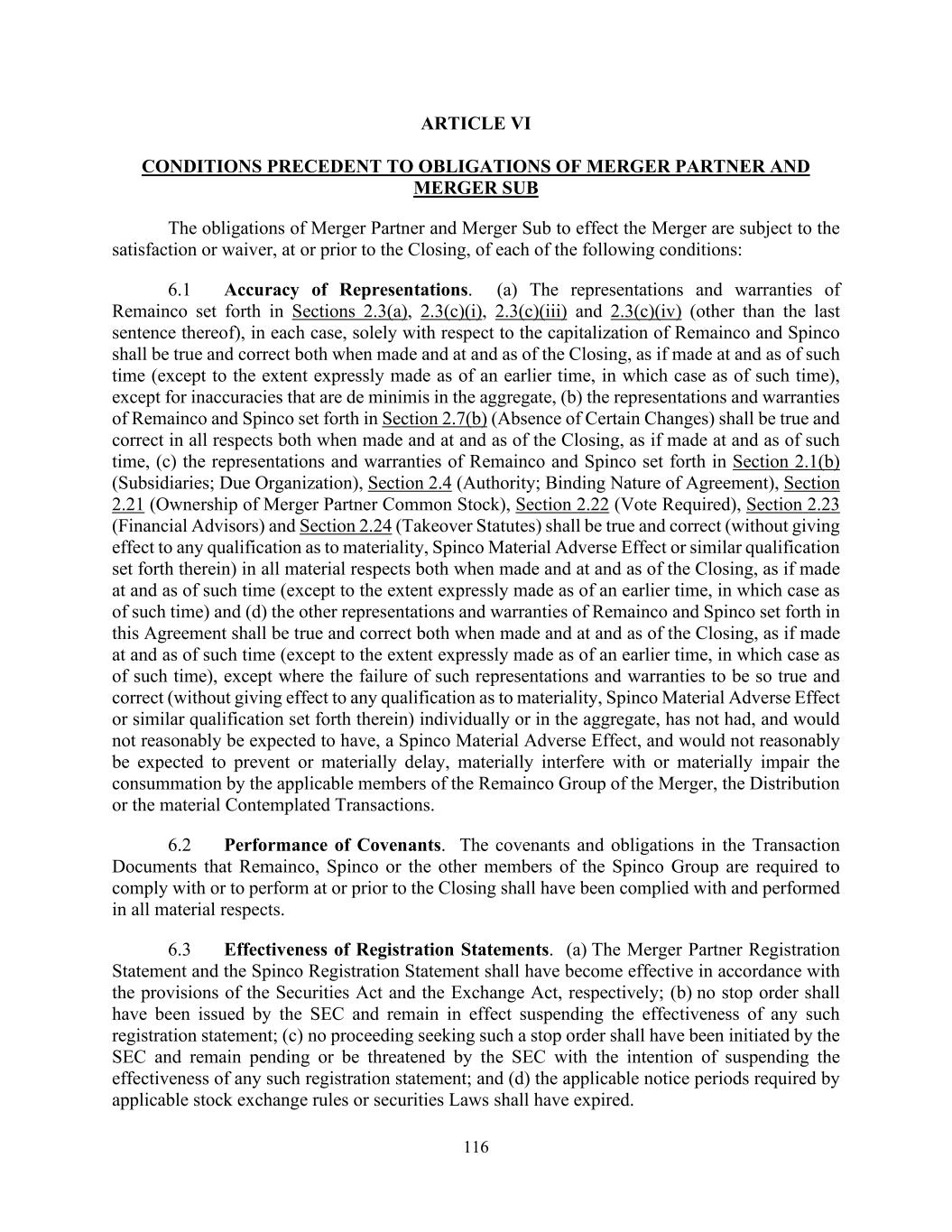 116 ARTICLE VI CONDITIONS PRECEDENT TO OBLIGATIONS OF MERGER PARTNER AND MERGER SUB The obligations of Merger Partner and Merger Sub to effect the Merger are subject to the satisfaction or waiver, at or prior to the Closing, of each of the following conditions: 6.1 Accuracy of Representations. (a) The representations and warranties of Remainco set forth in Sections 2.3(a), 2.3(c)(i), 2.3(c)(iii) and 2.3(c)(iv) (other than the last sentence thereof), in each case, solely with respect to the capitalization of Remainco and Spinco shall be true and correct both when made and at and as of the Closing, as if made at and as of such time (except to the extent expressly made as of an earlier time, in which case as of such time), except for inaccuracies that are de minimis in the aggregate, (b) the representations and warranties of Remainco and Spinco set forth in Section 2.7(b) (Absence of Certain Changes) shall be true and correct in all respects both when made and at and as of the Closing, as if made at and as of such time, (c) the representations and warranties of Remainco and Spinco set forth in Section 2.1(b) (Subsidiaries; Due Organization), Section 2.4 (Authority; Binding Nature of Agreement), Section 2.21 (Ownership of Merger Partner Common Stock), Section 2.22 (Vote Required), Section 2.23 (Financial Advisors) and Section 2.24 (Takeover Statutes) shall be true and correct (without giving effect to any qualification as to materiality, Spinco Material Adverse Effect or similar qualification set forth therein) in all material respects both when made and at and as of the Closing, as if made at and as of such time (except to the extent expressly made as of an earlier time, in which case as of such time) and (d) the other representations and warranties of Remainco and Spinco set forth in this Agreement shall be true and correct both when made and at and as of the Closing, as if made at and as of such time (except to the extent expressly made as of an earlier time, in which case as of such time), except where the failure of such representations and warranties to be so true and correct (without giving effect to any qualification as to materiality, Spinco Material Adverse Effect or similar qualification set forth therein) individually or in the aggregate, has not had, and would not reasonably be expected to have, a Spinco Material Adverse Effect, and would not reasonably be expected to prevent or materially delay, materially interfere with or materially impair the consummation by the applicable members of the Remainco Group of the Merger, the Distribution or the material Contemplated Transactions. 6.2 Performance of Covenants. The covenants and obligations in the Transaction Documents that Remainco, Spinco or the other members of the Spinco Group are required to comply with or to perform at or prior to the Closing shall have been complied with and performed in all material respects. 6.3 Effectiveness of Registration Statements. (a) The Merger Partner Registration Statement and the Spinco Registration Statement shall have become effective in accordance with the provisions of the Securities Act and the Exchange Act, respectively; (b) no stop order shall have been issued by the SEC and remain in effect suspending the effectiveness of any such registration statement; (c) no proceeding seeking such a stop order shall have been initiated by the SEC and remain pending or be threatened by the SEC with the intention of suspending the effectiveness of any such registration statement; and (d) the applicable notice periods required by applicable stock exchange rules or securities Laws shall have expired.
