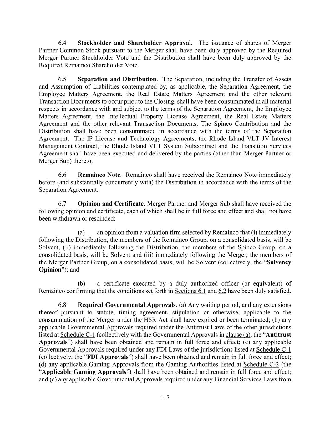117 6.4 Stockholder and Shareholder Approval. The issuance of shares of Merger Partner Common Stock pursuant to the Merger shall have been duly approved by the Required Merger Partner Stockholder Vote and the Distribution shall have been duly approved by the Required Remainco Shareholder Vote. 6.5 Separation and Distribution. The Separation, including the Transfer of Assets and Assumption of Liabilities contemplated by, as applicable, the Separation Agreement, the Employee Matters Agreement, the Real Estate Matters Agreement and the other relevant Transaction Documents to occur prior to the Closing, shall have been consummated in all material respects in accordance with and subject to the terms of the Separation Agreement, the Employee Matters Agreement, the Intellectual Property License Agreement, the Real Estate Matters Agreement and the other relevant Transaction Documents. The Spinco Contribution and the Distribution shall have been consummated in accordance with the terms of the Separation Agreement. The IP License and Technology Agreements, the Rhode Island VLT JV Interest Management Contract, the Rhode Island VLT System Subcontract and the Transition Services Agreement shall have been executed and delivered by the parties (other than Merger Partner or Merger Sub) thereto. 6.6 Remainco Note. Remainco shall have received the Remainco Note immediately before (and substantially concurrently with) the Distribution in accordance with the terms of the Separation Agreement. 6.7 Opinion and Certificate. Merger Partner and Merger Sub shall have received the following opinion and certificate, each of which shall be in full force and effect and shall not have been withdrawn or rescinded: (a) an opinion from a valuation firm selected by Remainco that (i) immediately following the Distribution, the members of the Remainco Group, on a consolidated basis, will be Solvent, (ii) immediately following the Distribution, the members of the Spinco Group, on a consolidated basis, will be Solvent and (iii) immediately following the Merger, the members of the Merger Partner Group, on a consolidated basis, will be Solvent (collectively, the “Solvency Opinion”); and (b) a certificate executed by a duly authorized officer (or equivalent) of Remainco confirming that the conditions set forth in Sections 6.1 and 6.2 have been duly satisfied. 6.8 Required Governmental Approvals. (a) Any waiting period, and any extensions thereof pursuant to statute, timing agreement, stipulation or otherwise, applicable to the consummation of the Merger under the HSR Act shall have expired or been terminated; (b) any applicable Governmental Approvals required under the Antitrust Laws of the other jurisdictions listed at Schedule C-1 (collectively with the Governmental Approvals in clause (a), the “Antitrust Approvals”) shall have been obtained and remain in full force and effect; (c) any applicable Governmental Approvals required under any FDI Laws of the jurisdictions listed at Schedule C-1 (collectively, the “FDI Approvals”) shall have been obtained and remain in full force and effect; (d) any applicable Gaming Approvals from the Gaming Authorities listed at Schedule C-2 (the “Applicable Gaming Approvals”) shall have been obtained and remain in full force and effect; and (e) any applicable Governmental Approvals required under any Financial Services Laws from